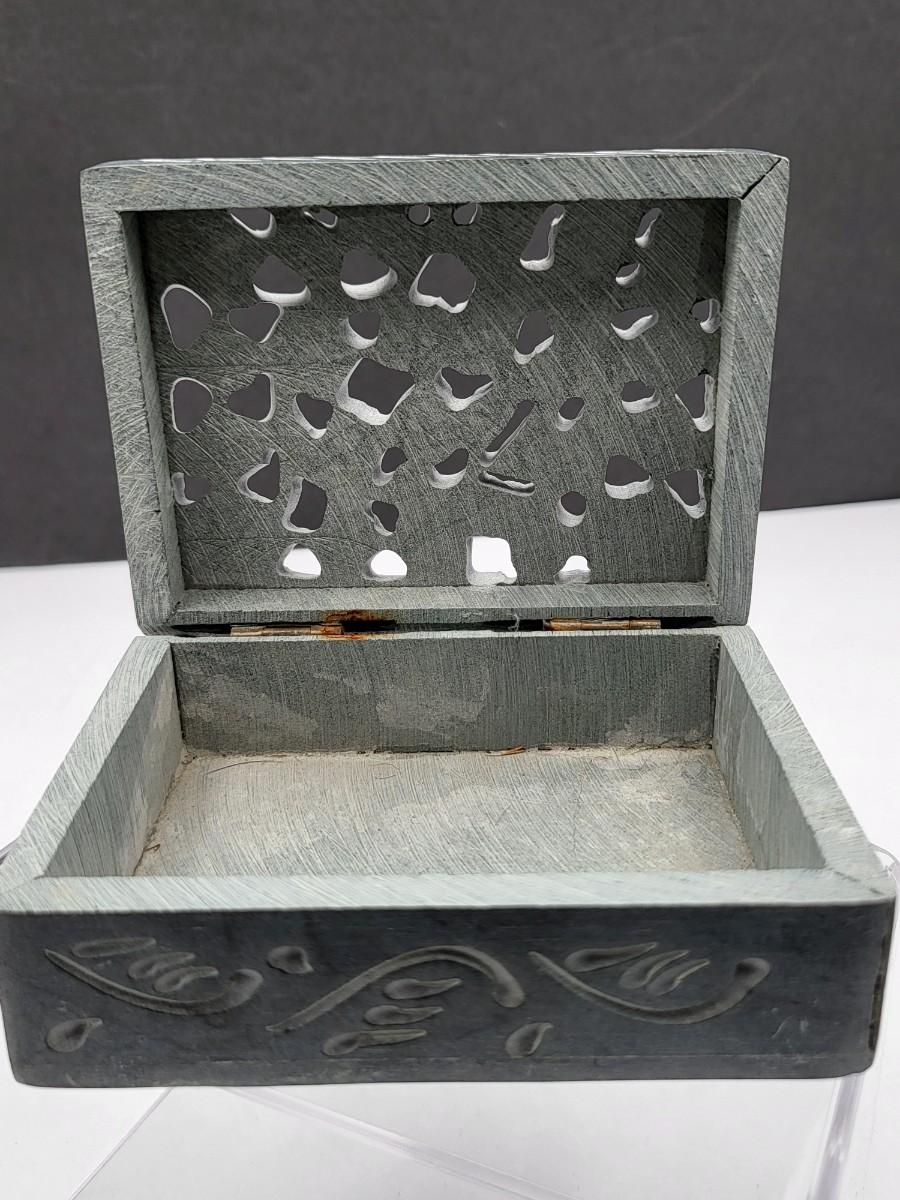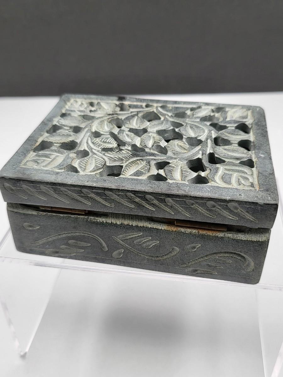 Etched & carved, grey soapstone, hinged trinket box, meaduring 4" x 3" x 1.5"