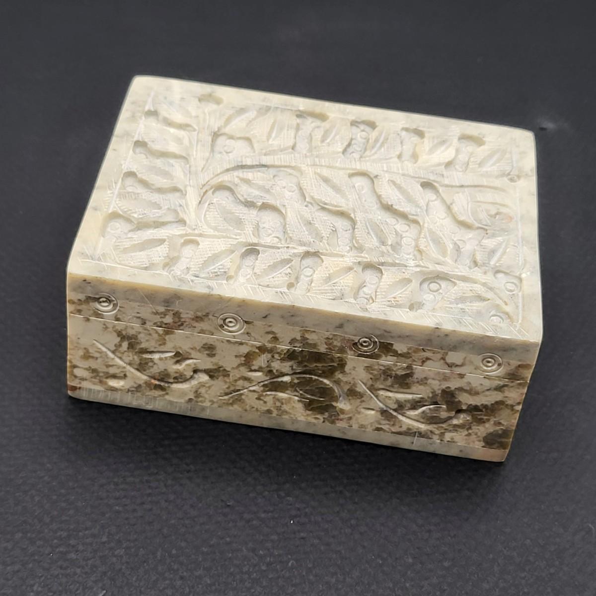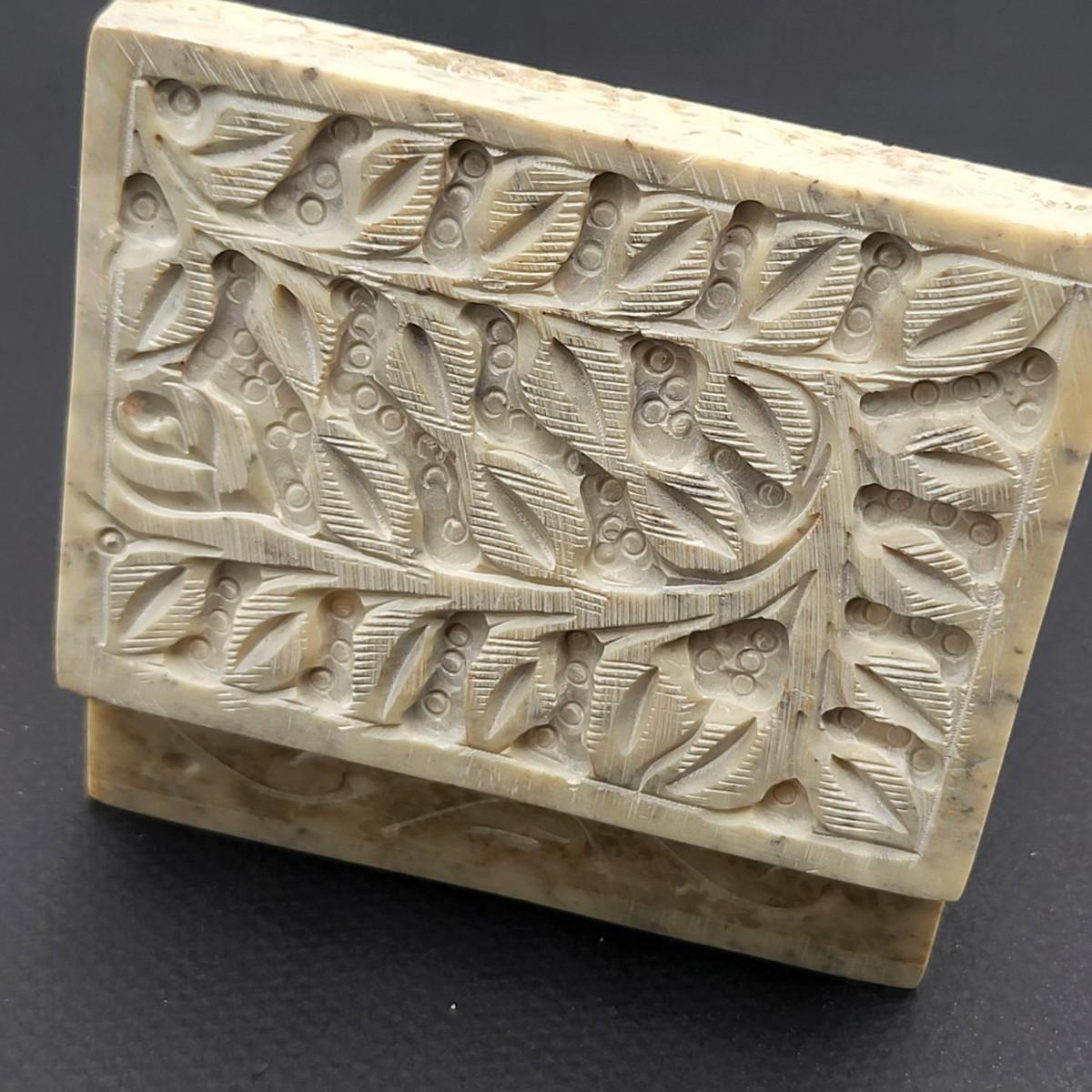 Light earth tones, leaf & branch carved soapstone hinged trinket boxes 4" wide x 3" deep x 1.5" tall.