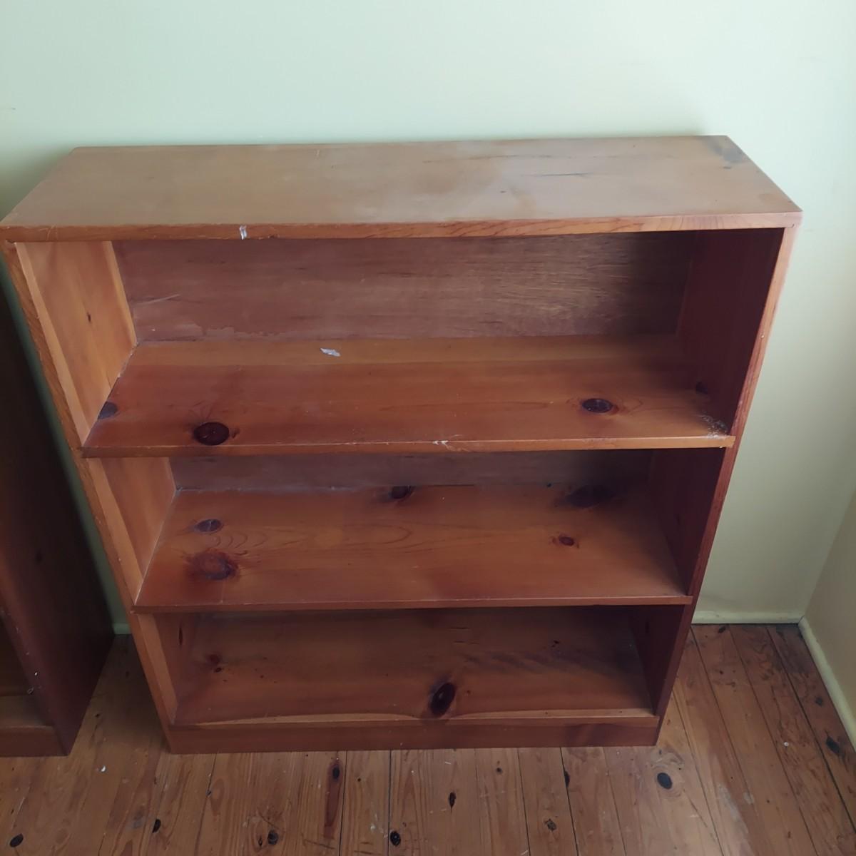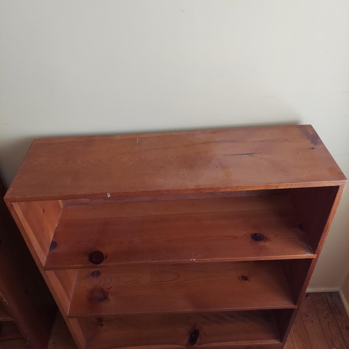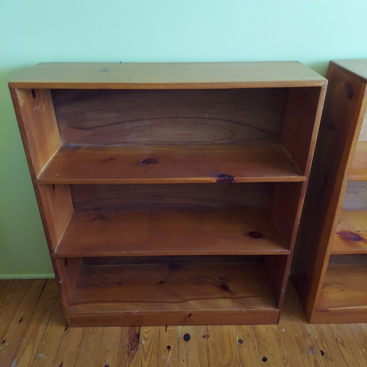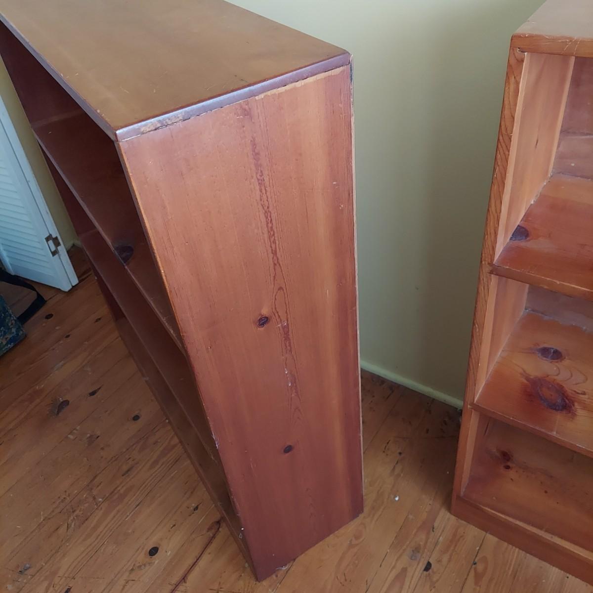 Two solid wood bookshelves with fixed shelves. Each measure 36.5” x 11.5” x 42"H. A few overall nicks. Please see photos for details. Local Pickup Only