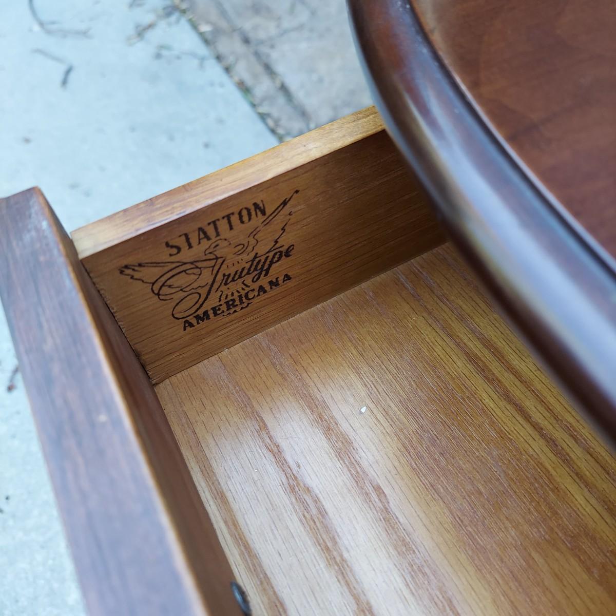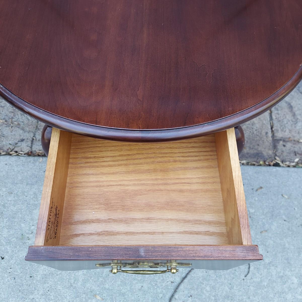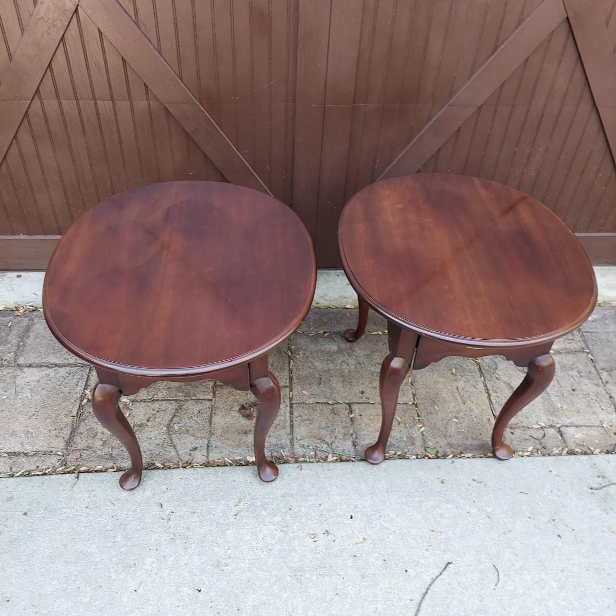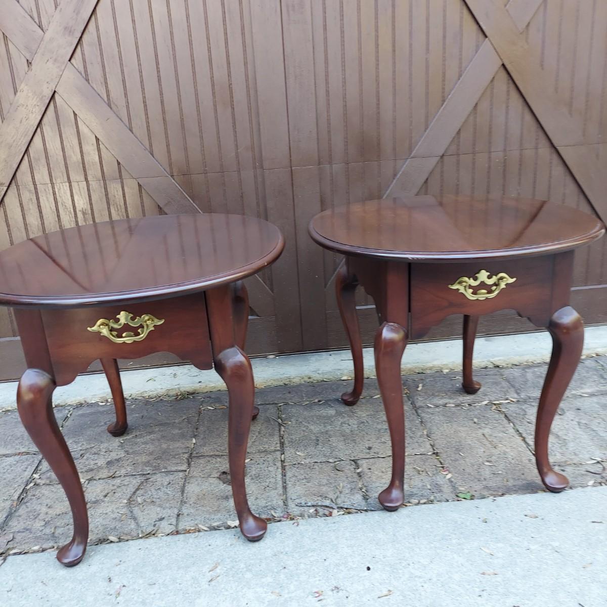 Two solid wood side tables with storage drawer. Appears to be cherry wood and has dovetailed drawers. Made by Stratton Trutype Americana. Each are 23.5 x 26.5 x 23"H. Some signs of use on the top surfaces. Please see photos. Local Pickup Only.