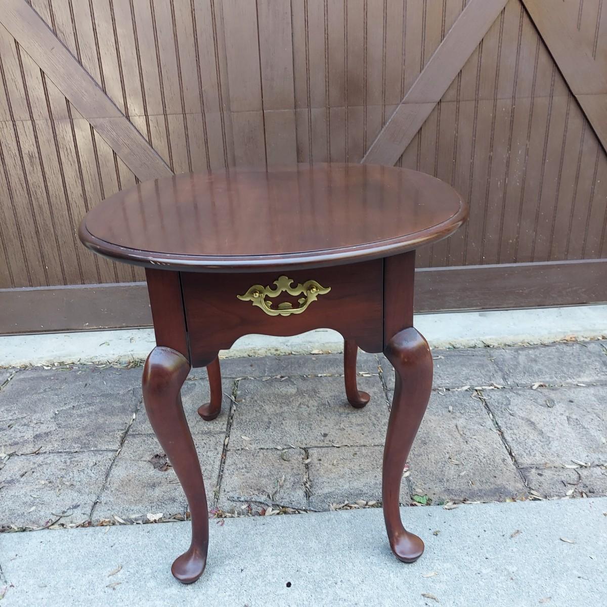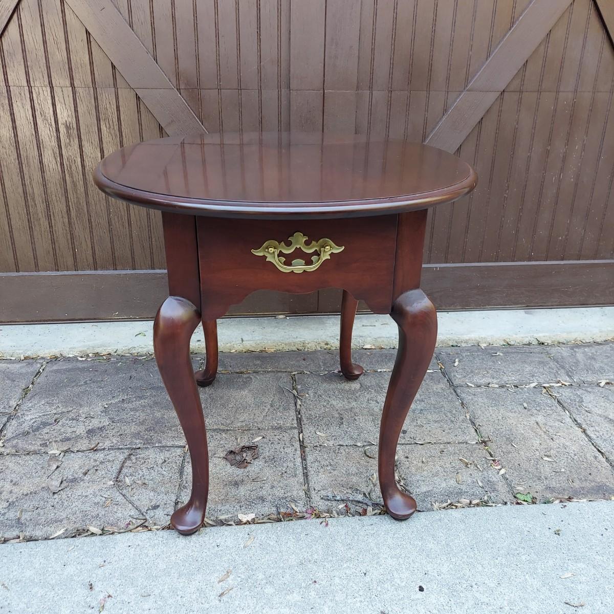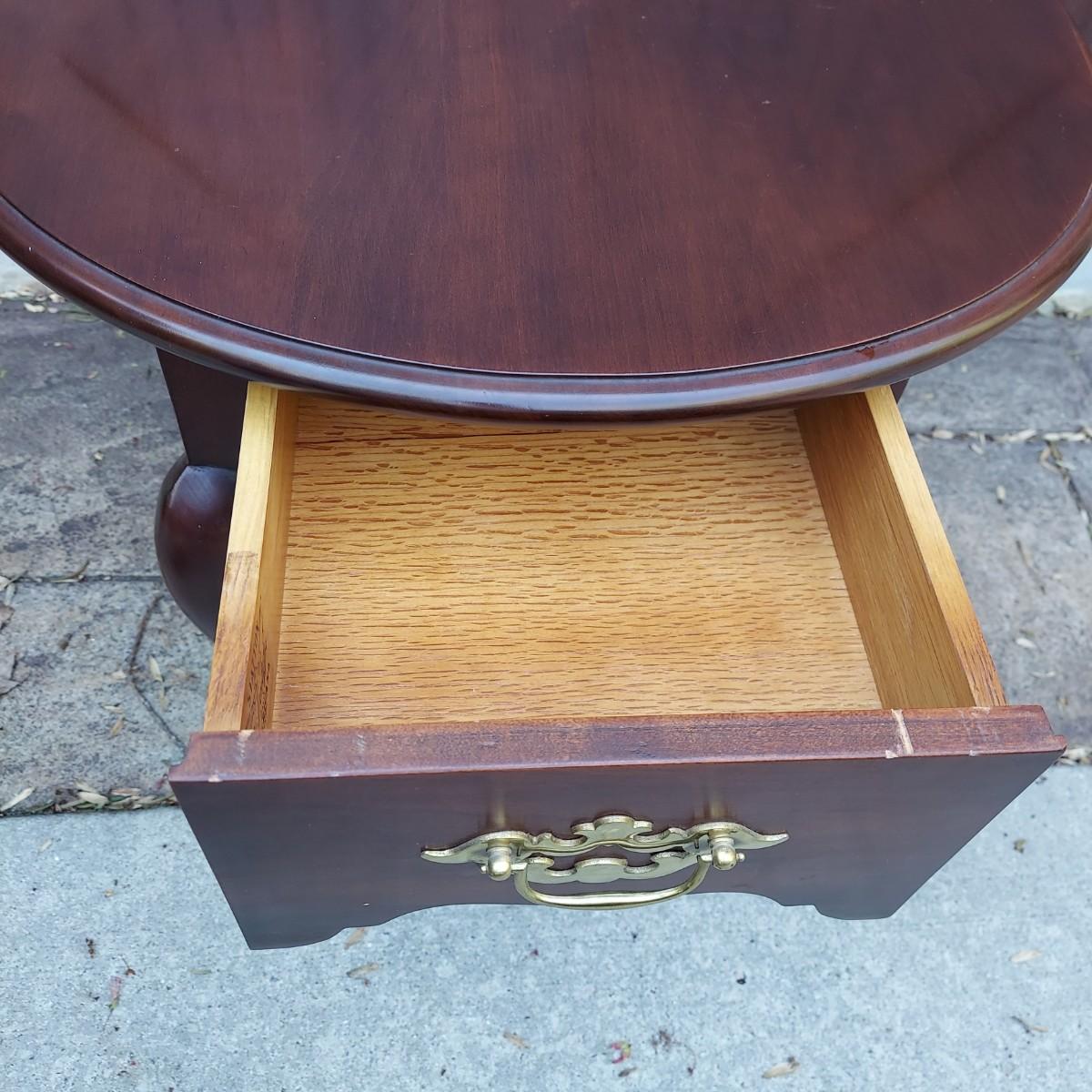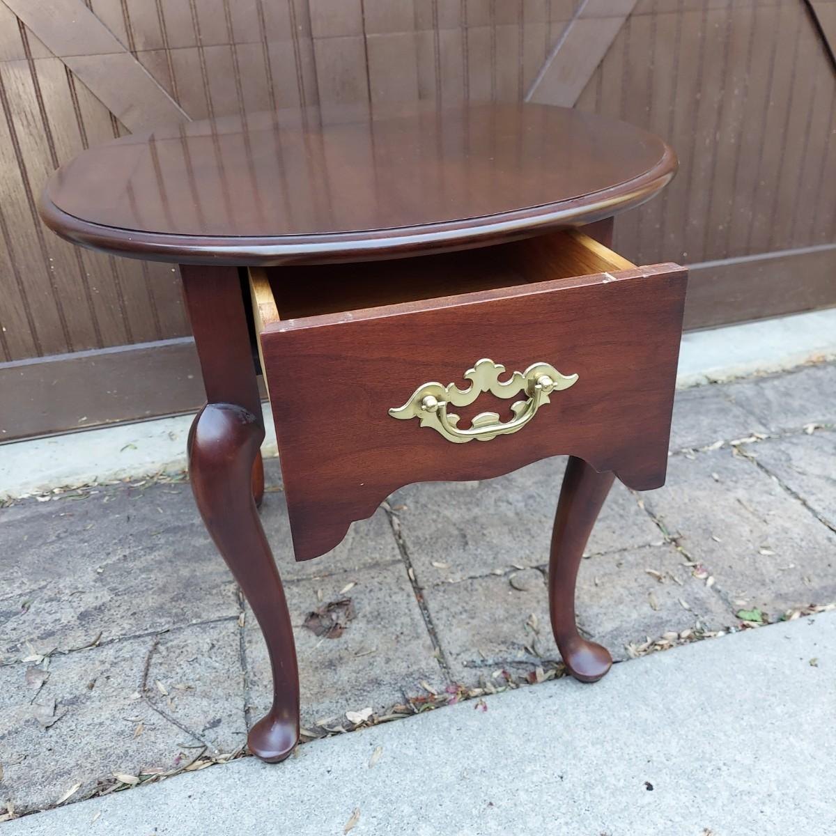 Two solid wood side tables with storage drawer. Appears to be cherry wood and has dovetailed drawers. Made by Stratton Trutype Americana. Each are 23.5 x 26.5 x 23"H. Some signs of use on the top surfaces. Please see photos. Local Pickup Only.
