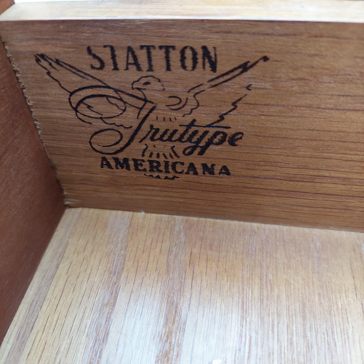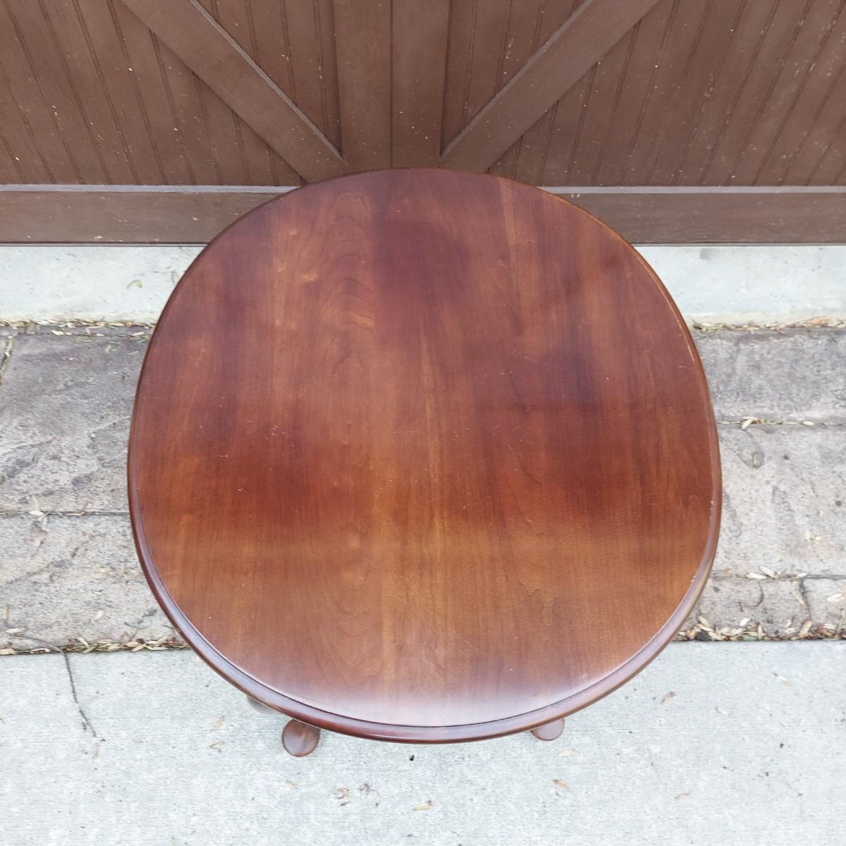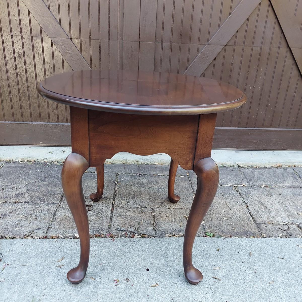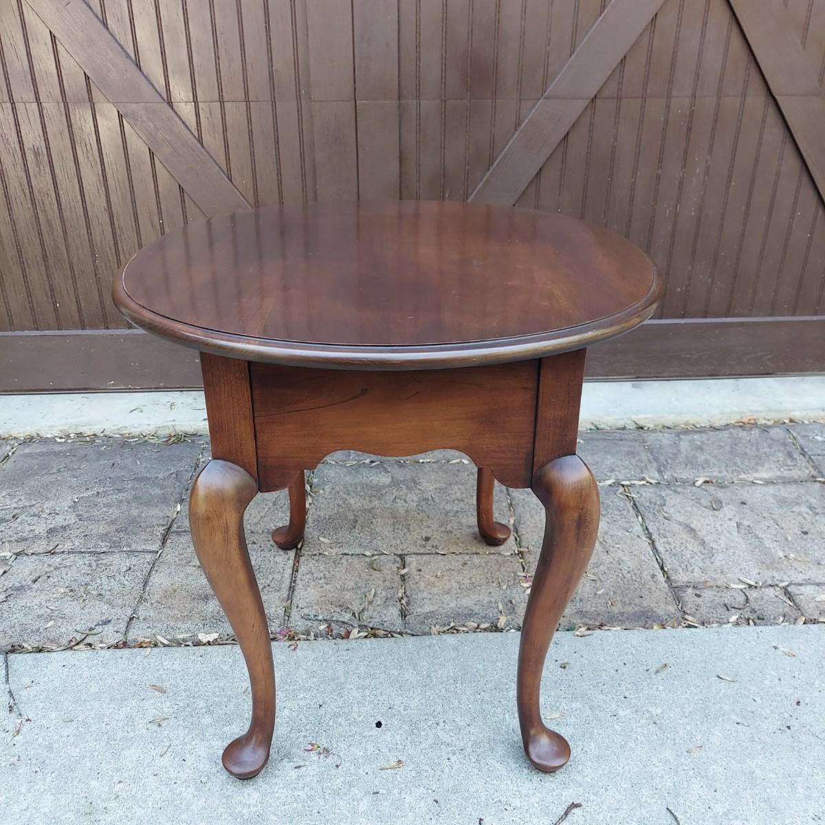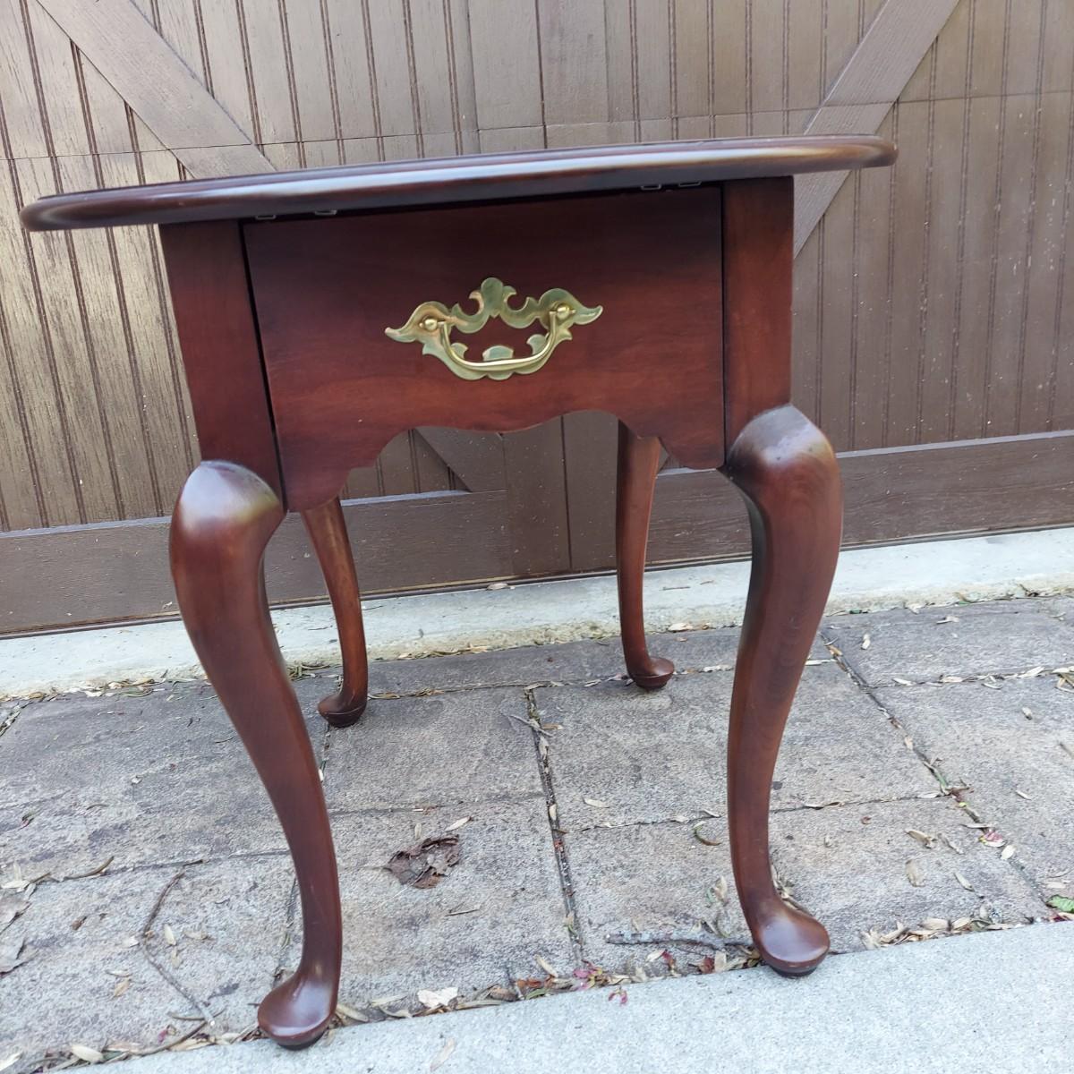 Two solid wood side tables with storage drawer. Appears to be cherry wood and has dovetailed drawers. Made by Stratton Trutype Americana. Each are 23.5 x 26.5 x 23"H. Some signs of use on the top surfaces. Please see photos. Local Pickup Only.