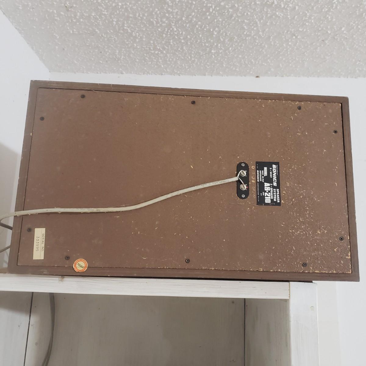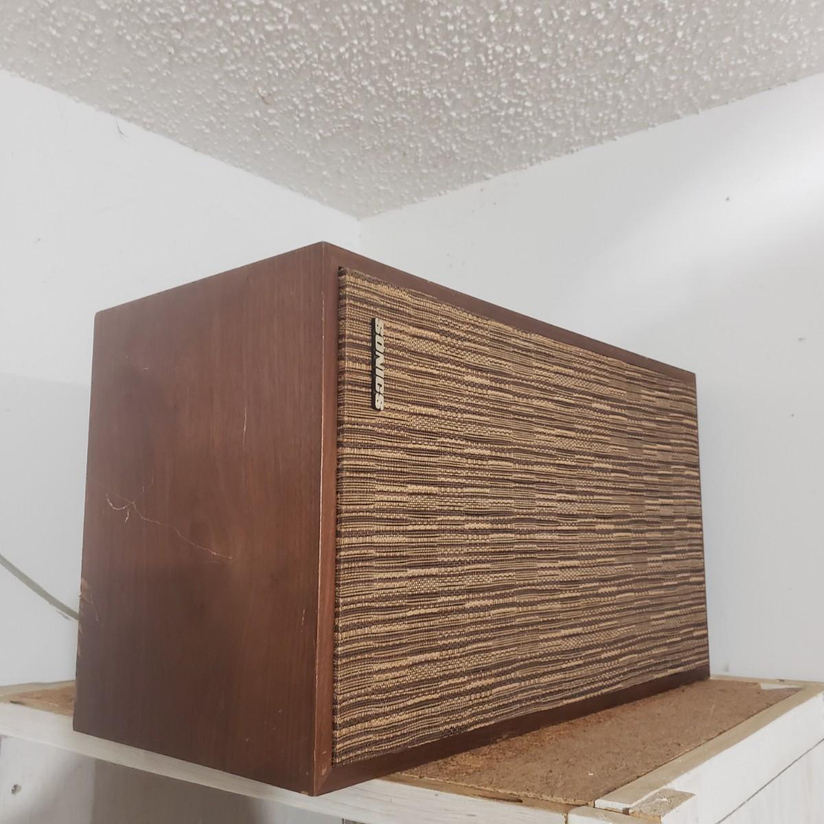 These two vintage speakers are made by Sonics. See picture for model number. The speakers power on when plugged in. There wasn't a group shot, but note there are two speakers.