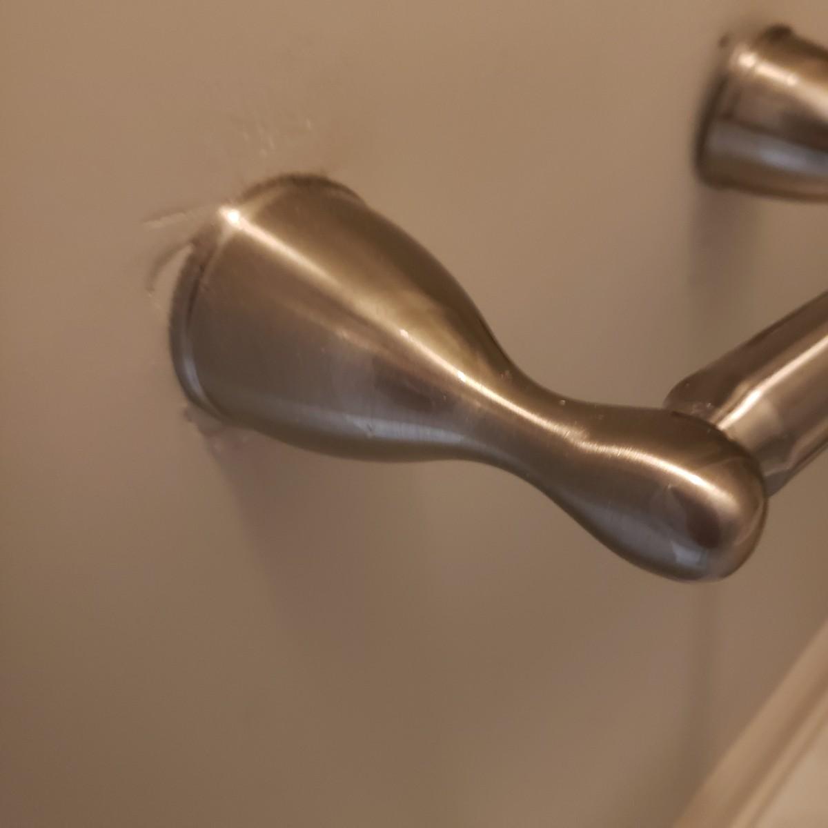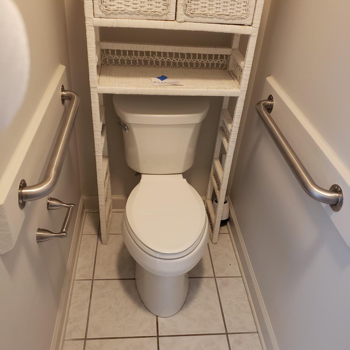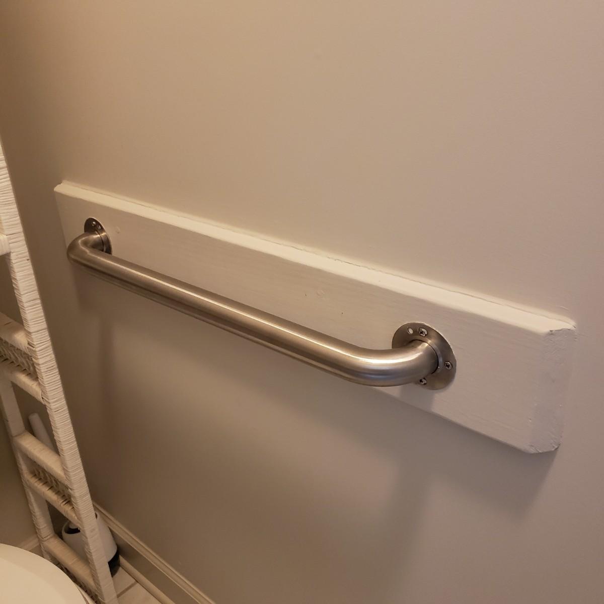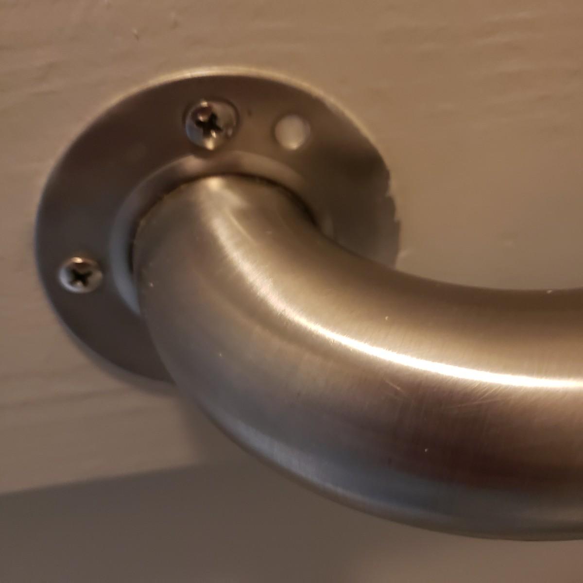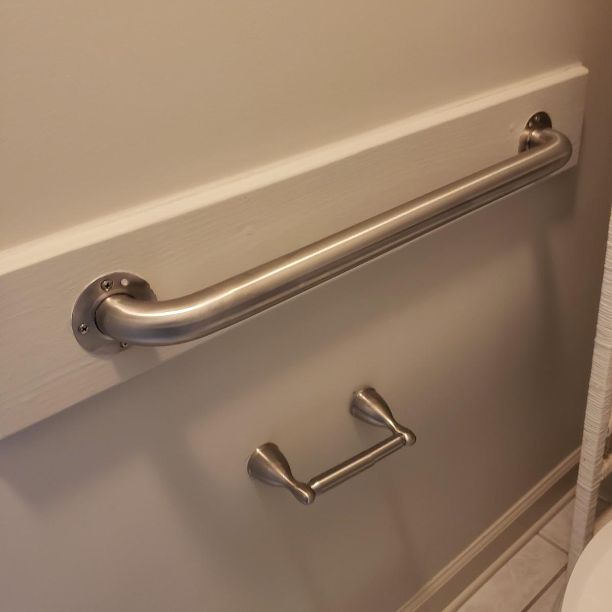 This three-piece lot has two stainless grab bars. Each bar measures 27" from outside bracket to bracket. It comes 3" off the wall. Also included is a brushed nickel toilet paper holder with a spring tube.