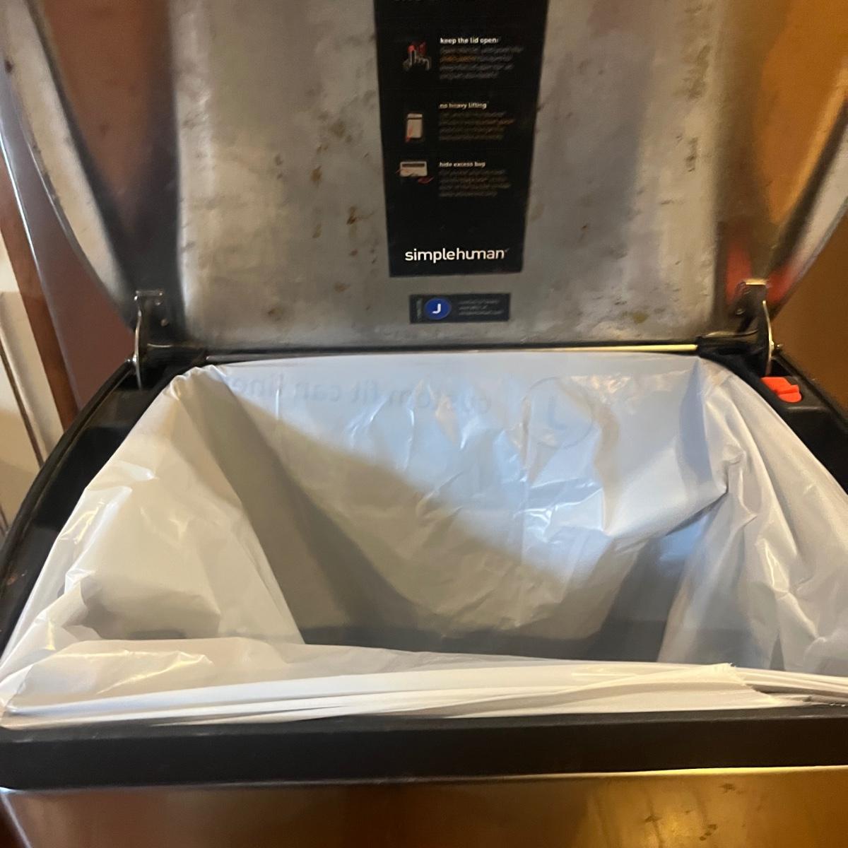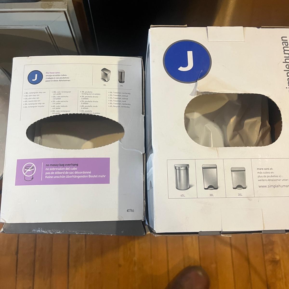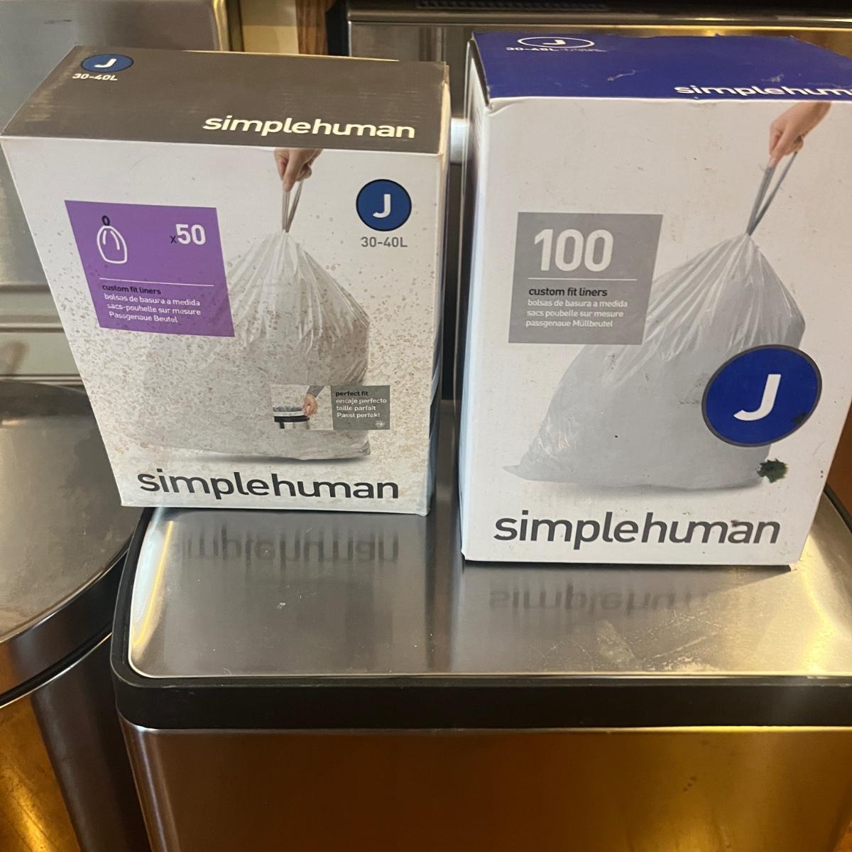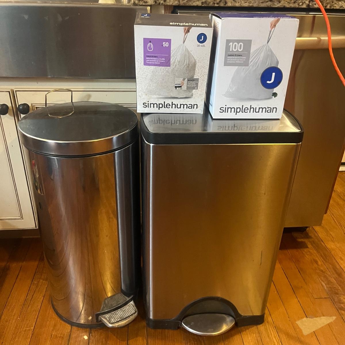 Lot includes a Simple Human stainless steel kitchen garbage bin and an unbranded circular stainless steel garbage bin. Both bins have the step to open feature. Also includes two boxes of partially full bags. Largest bin measures 15” x 10” x 26”H.