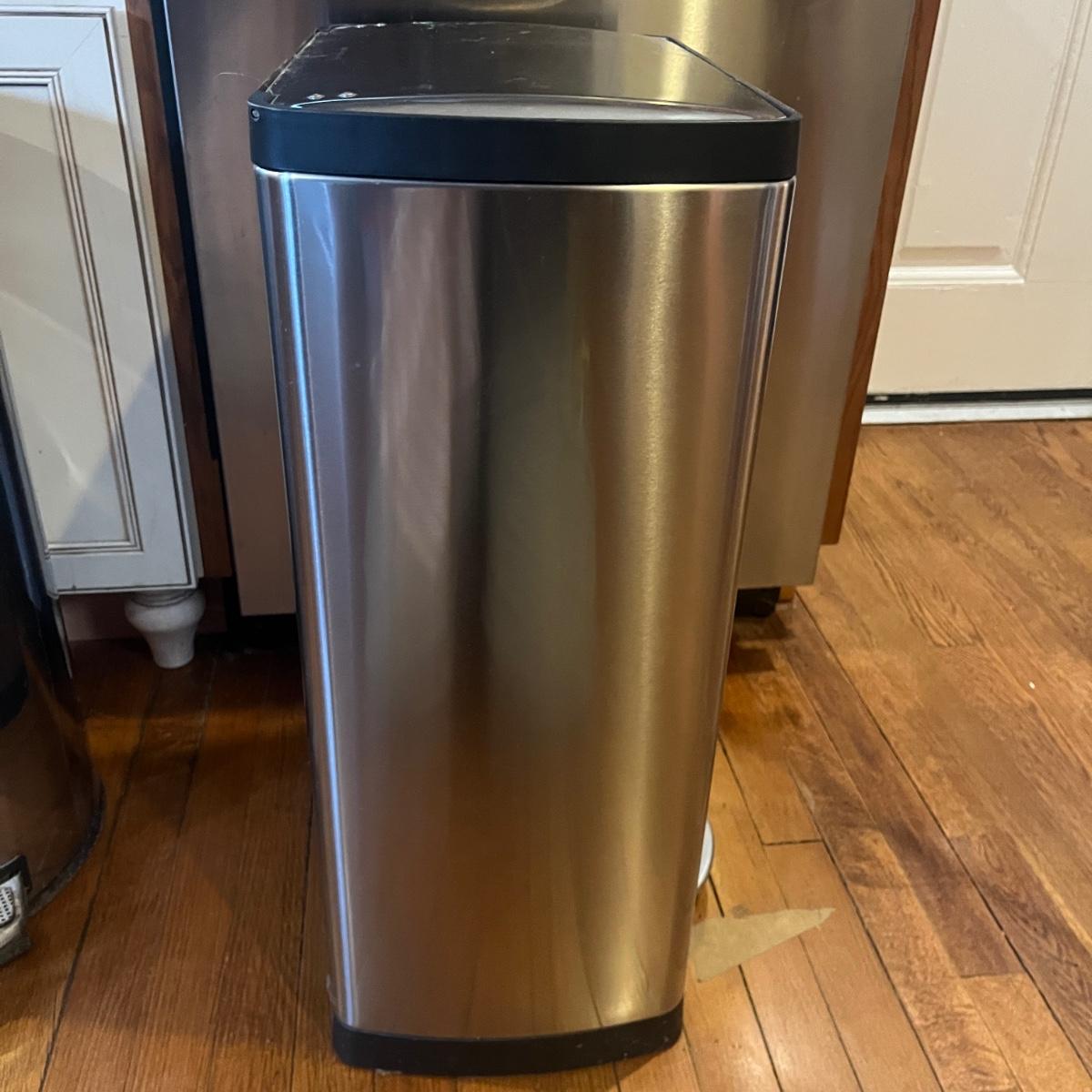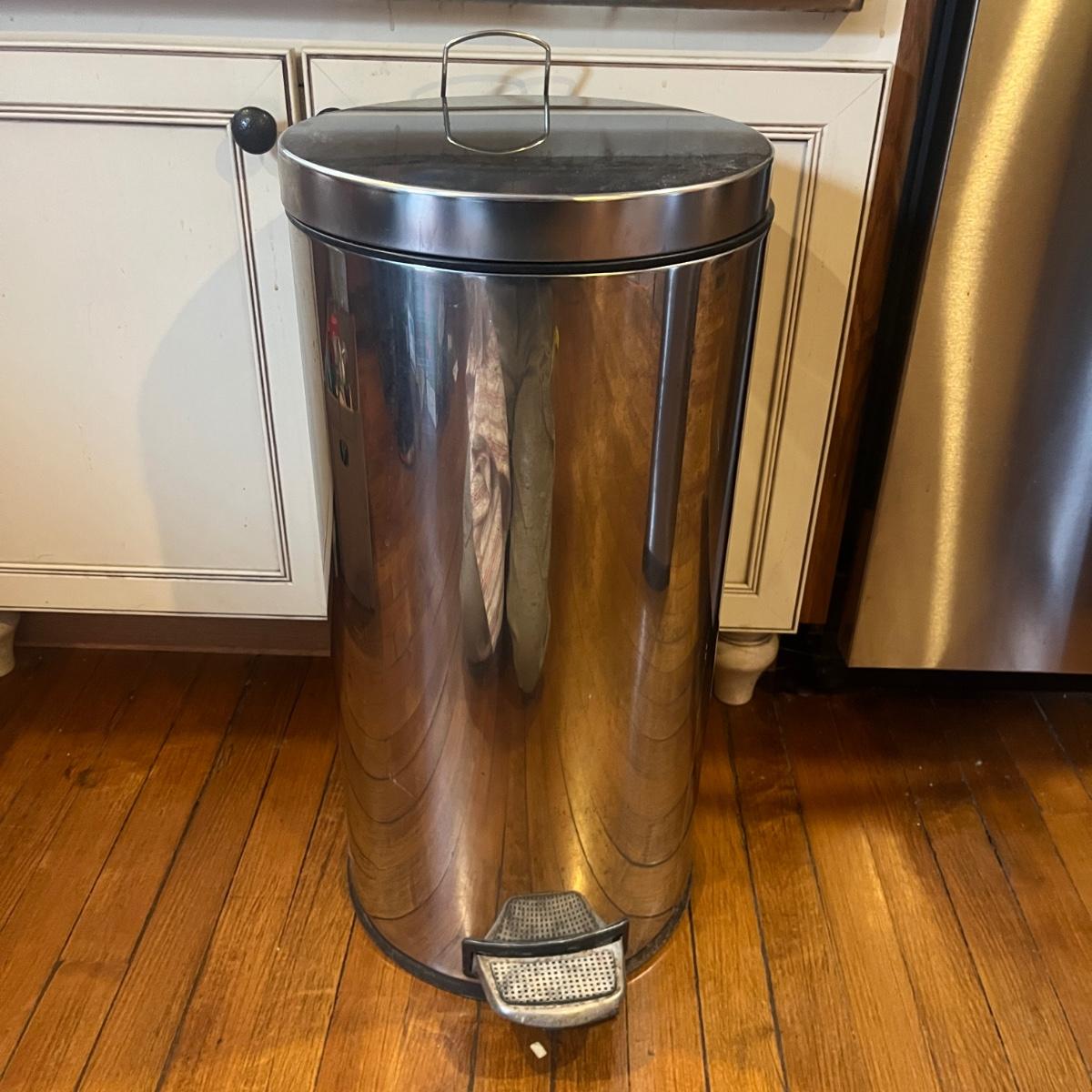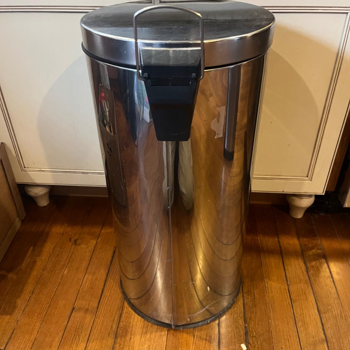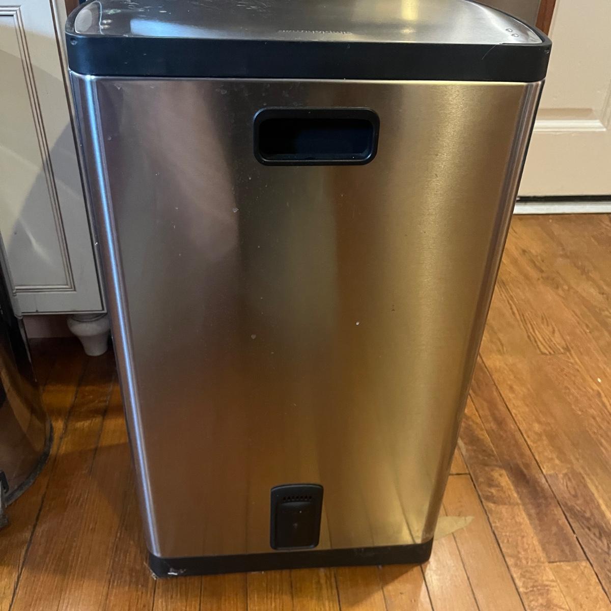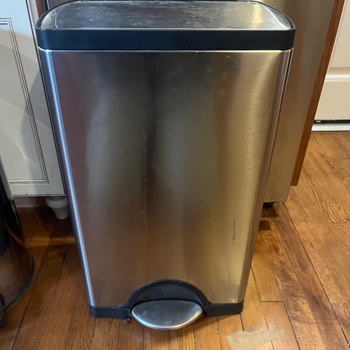 Lot includes a Simple Human stainless steel kitchen garbage bin and an unbranded circular stainless steel garbage bin. Both bins have the step to open feature. Also includes two boxes of partially full bags. Largest bin measures 15” x 10” x 26”H.
