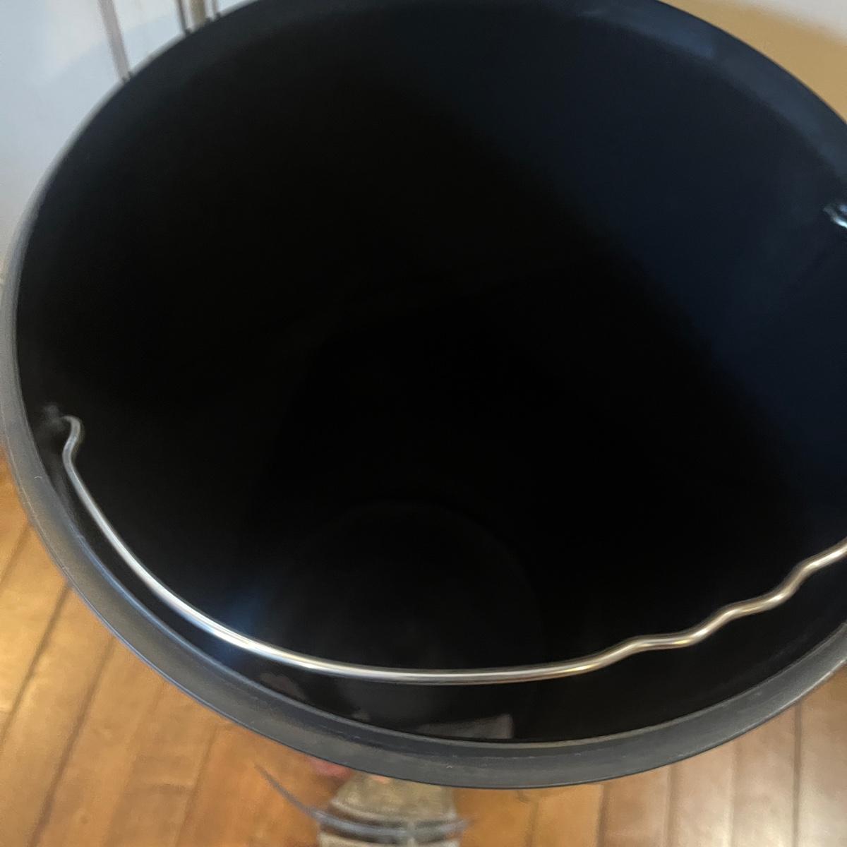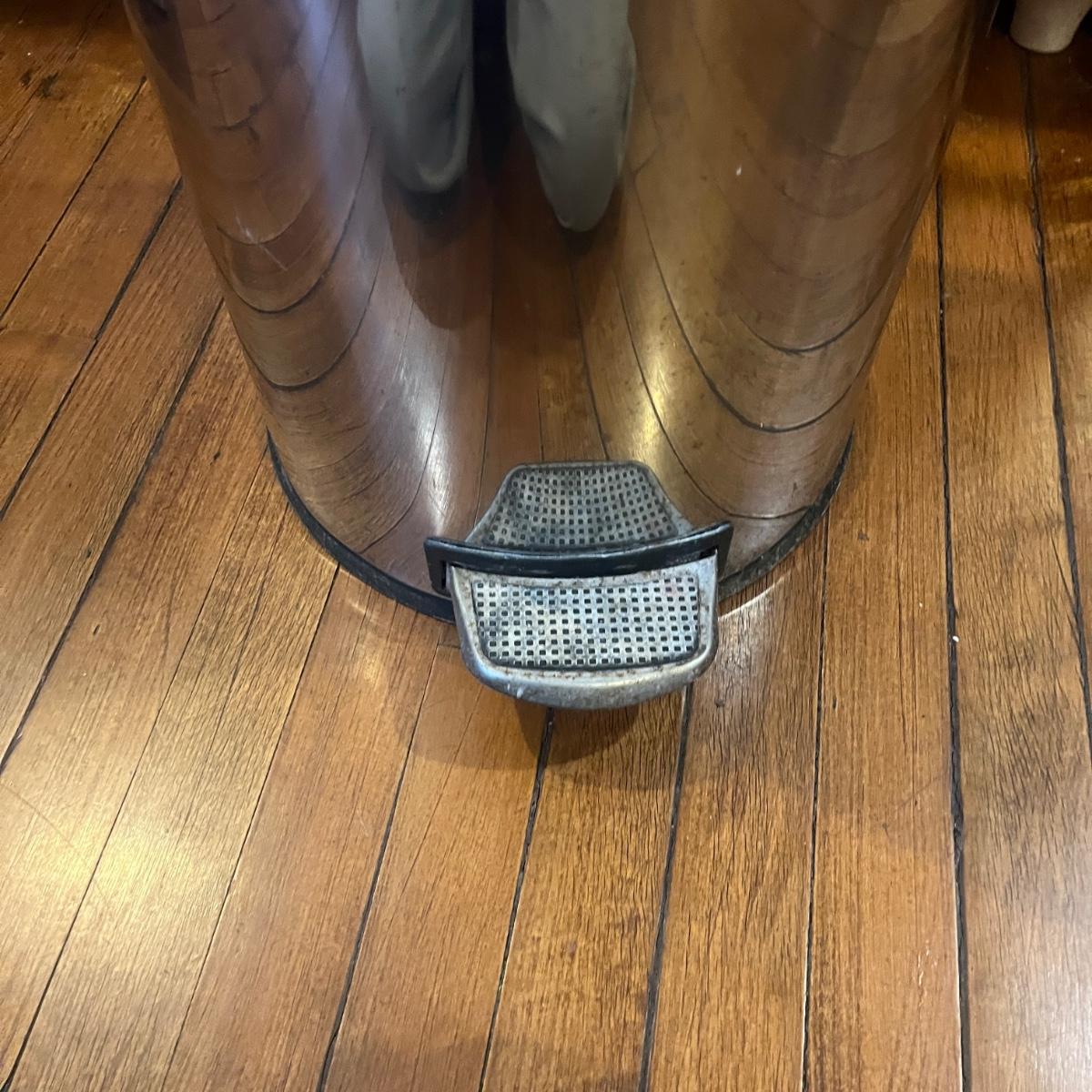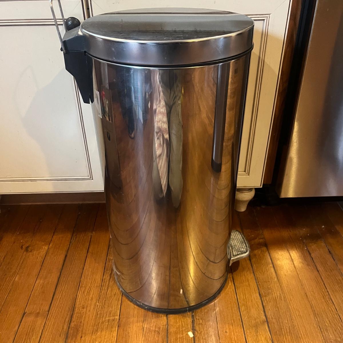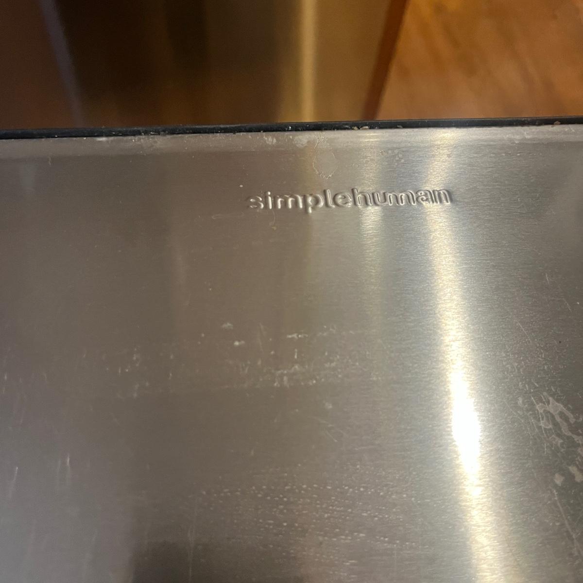 Lot includes a Simple Human stainless steel kitchen garbage bin and an unbranded circular stainless steel garbage bin. Both bins have the step to open feature. Also includes two boxes of partially full bags. Largest bin measures 15” x 10” x 26”H.
