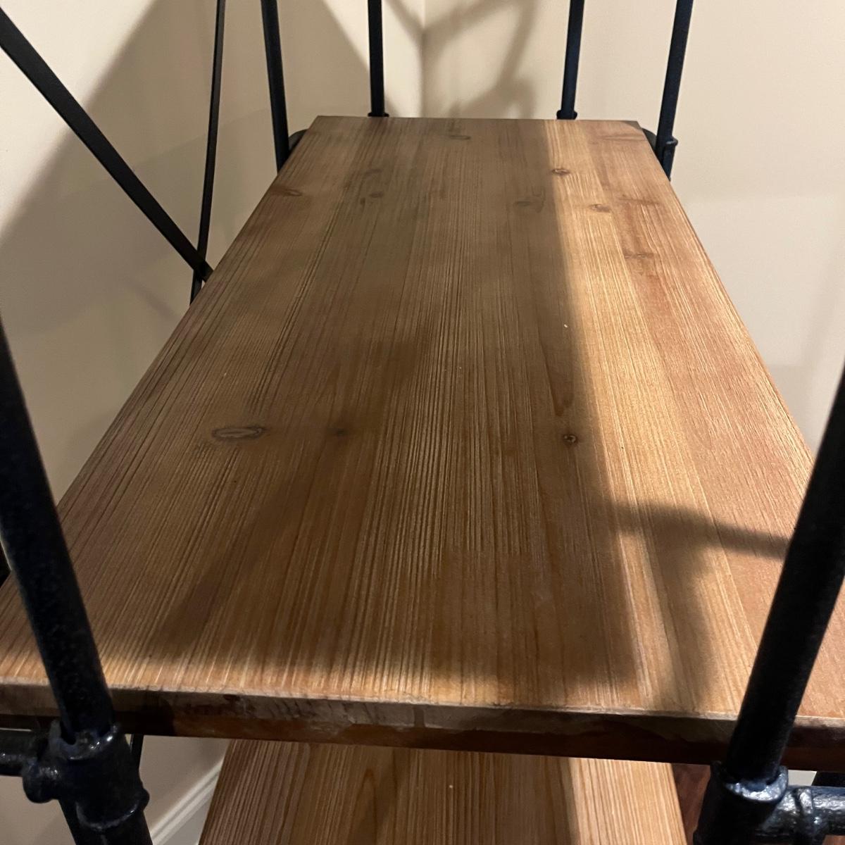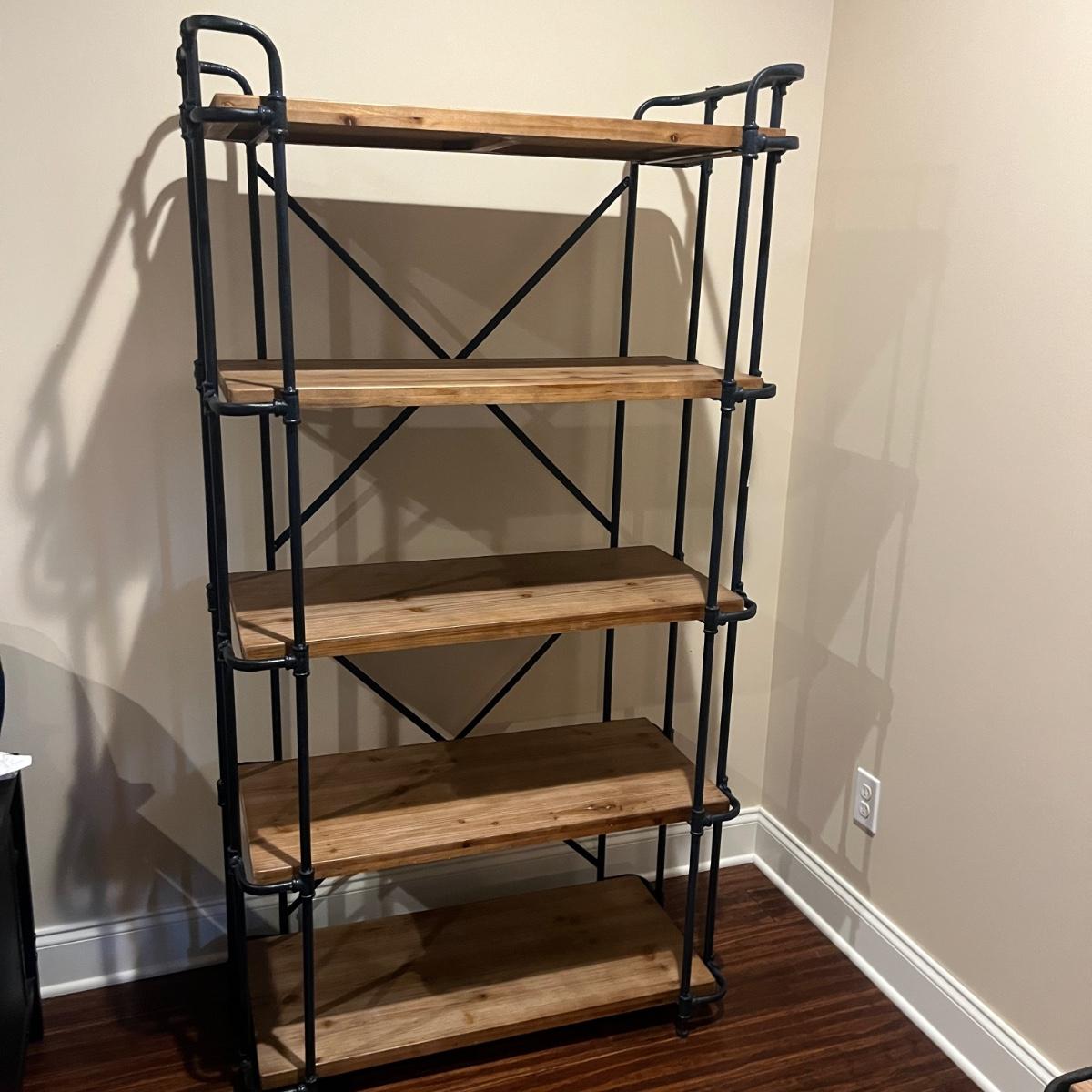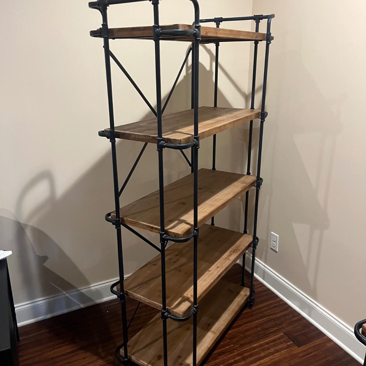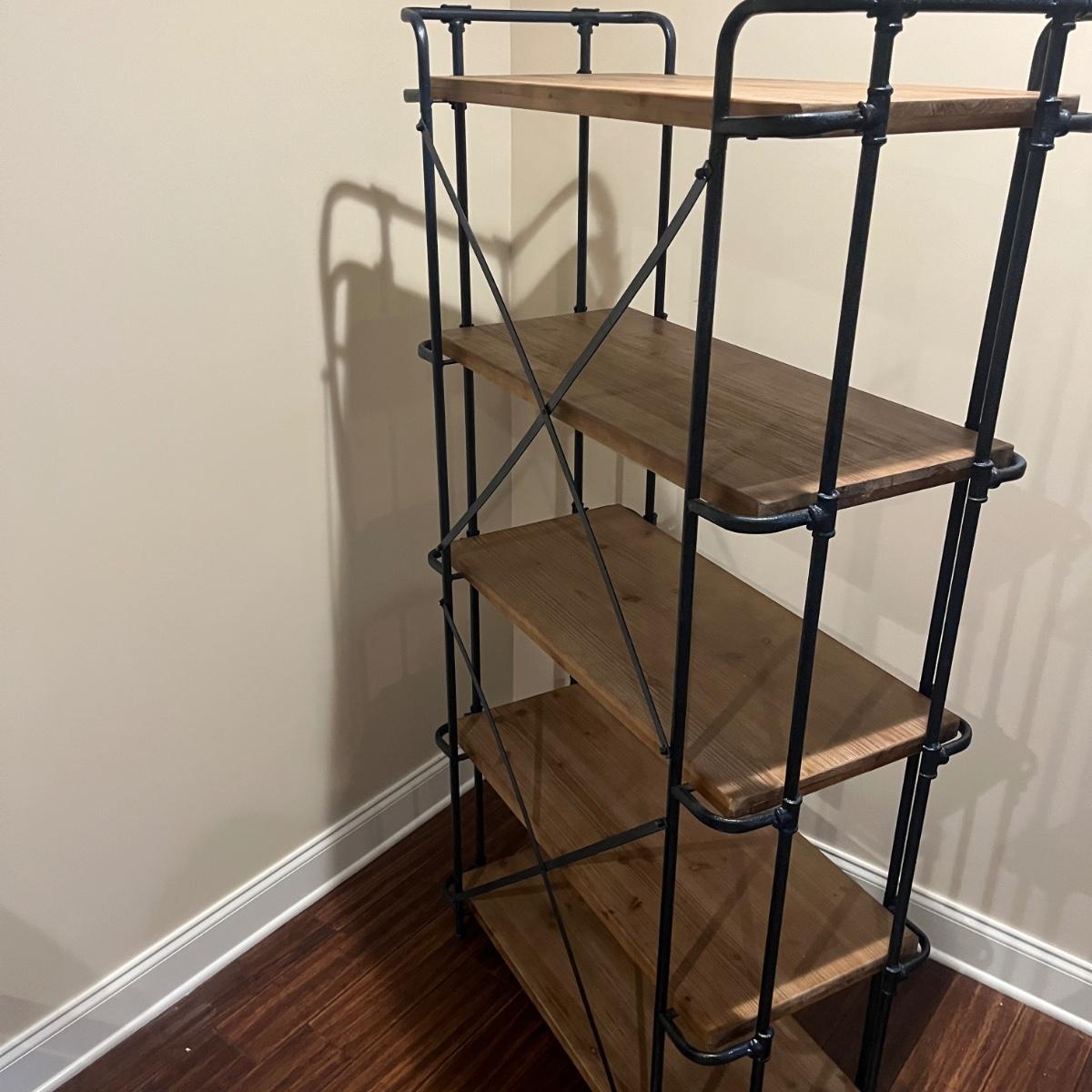 Lot includes two steel frame shelving units. Each unit offers five wooden shelves. Units measure 35” x 17” x 67”H.