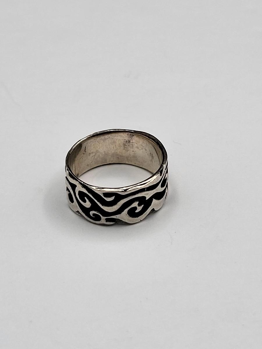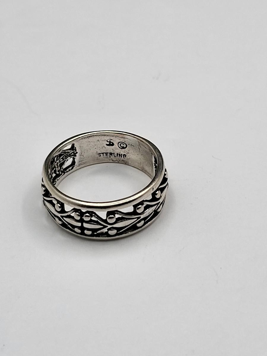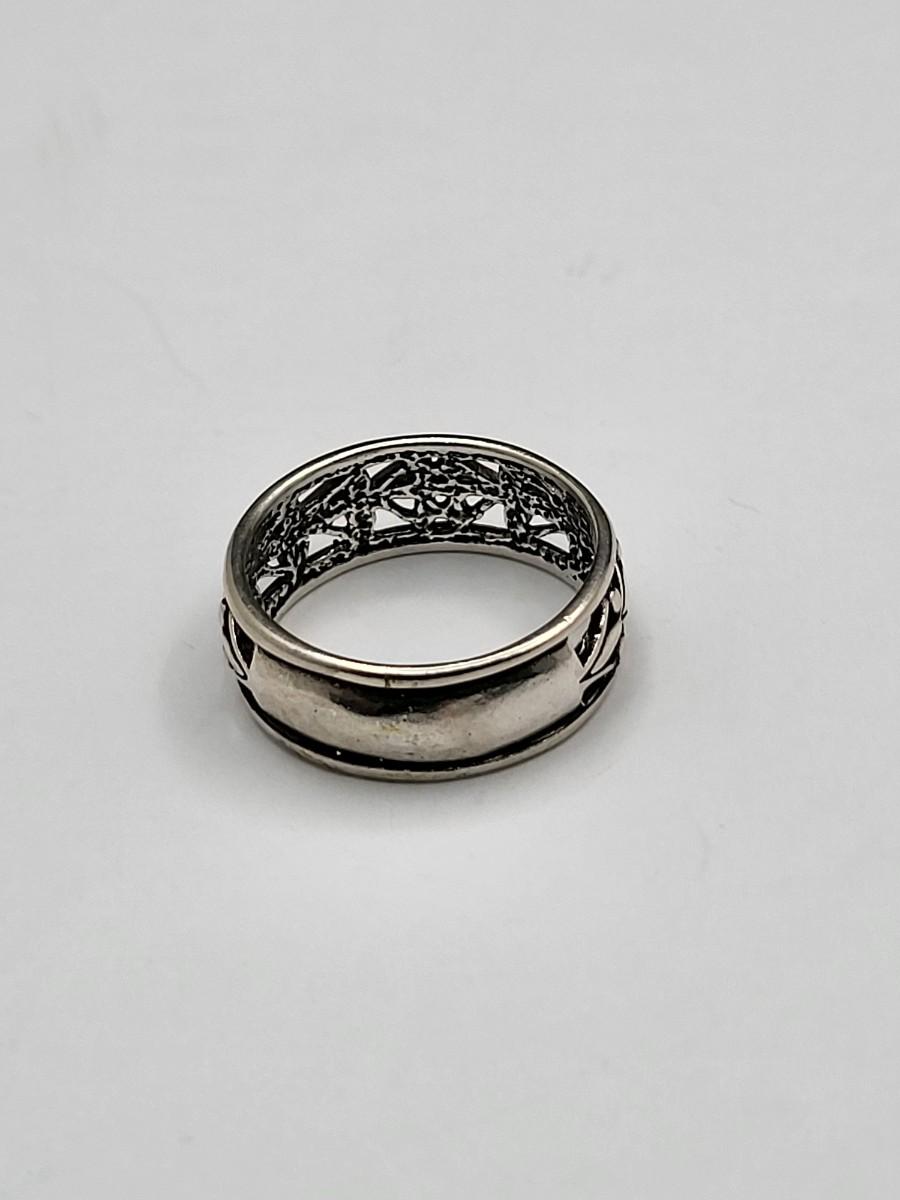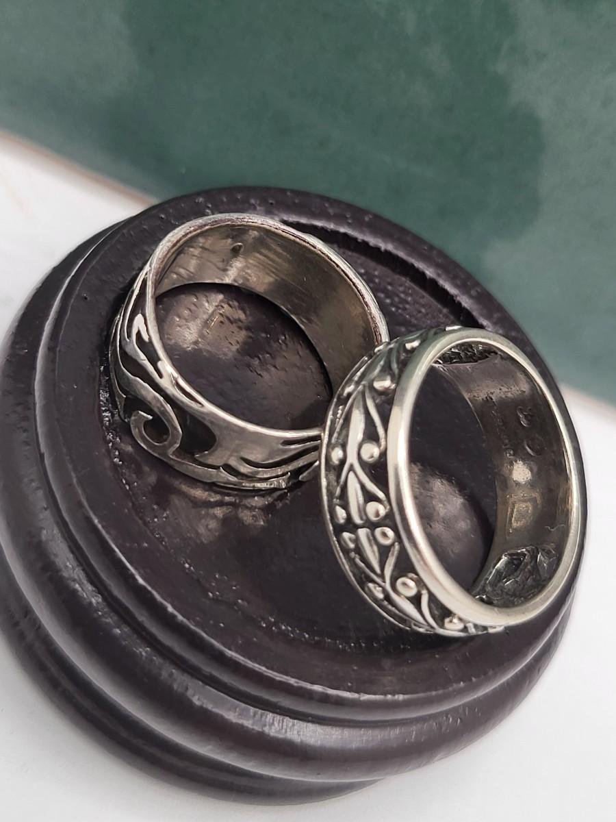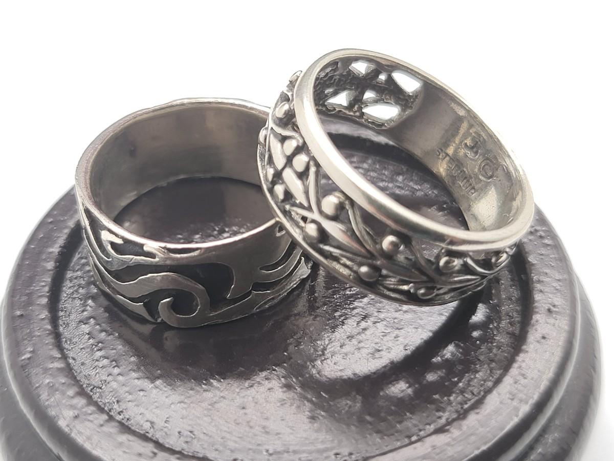 Two, wide band rings: one is size 5.5 (6mm) with wavy pattern and one is a size 8 (5mm), open work on 2/3rd of the Band and 1/3rd is solid. Makers mark stamped.