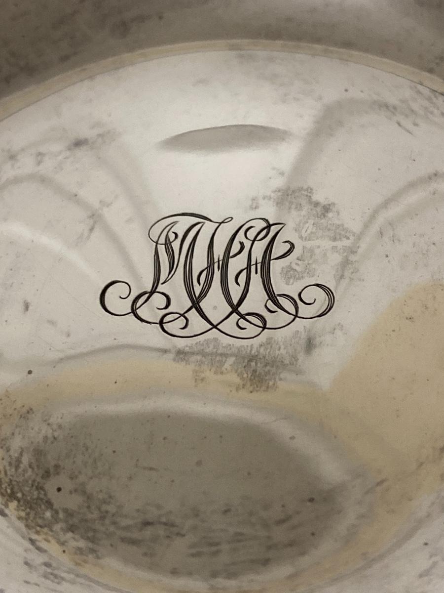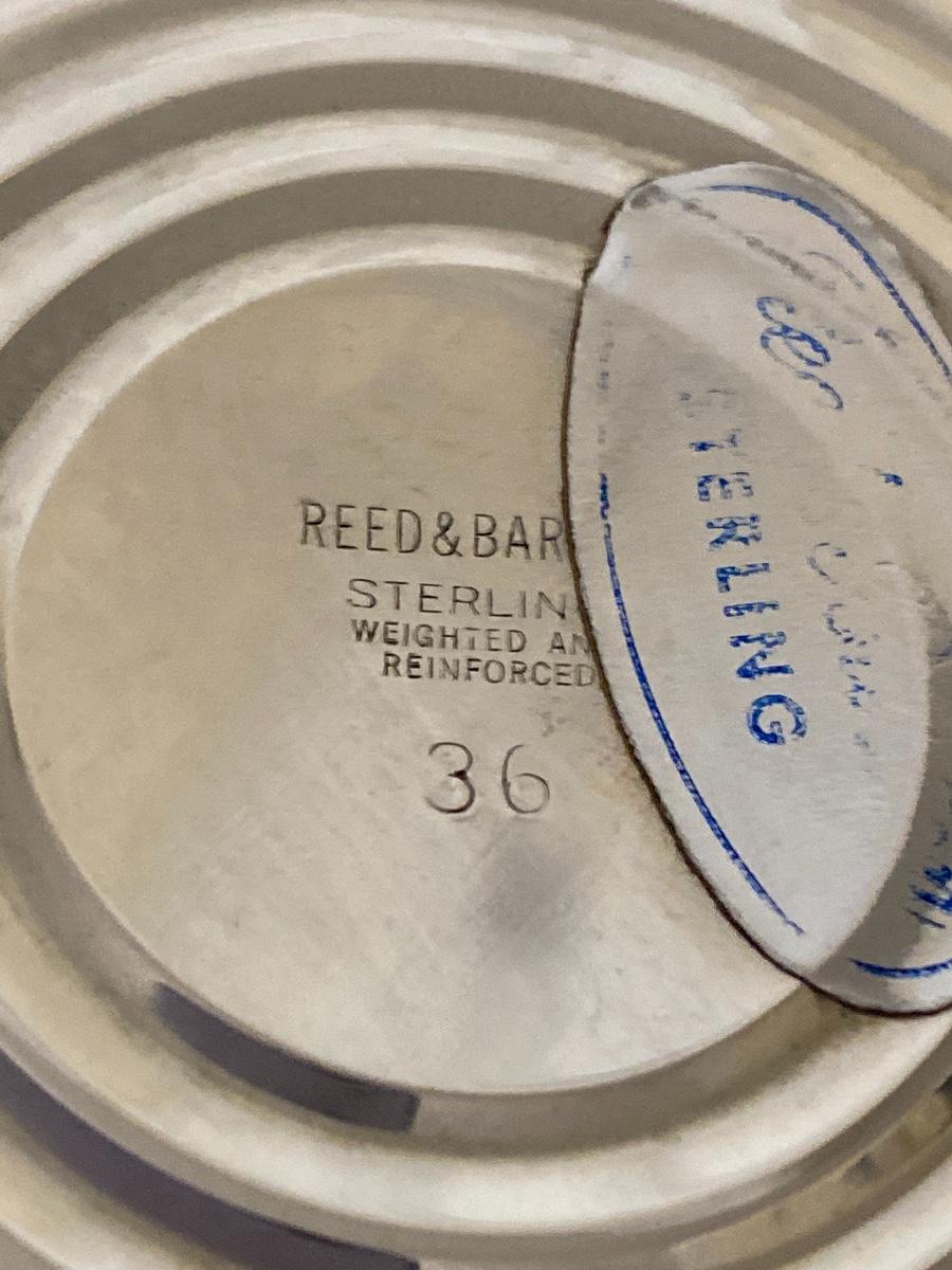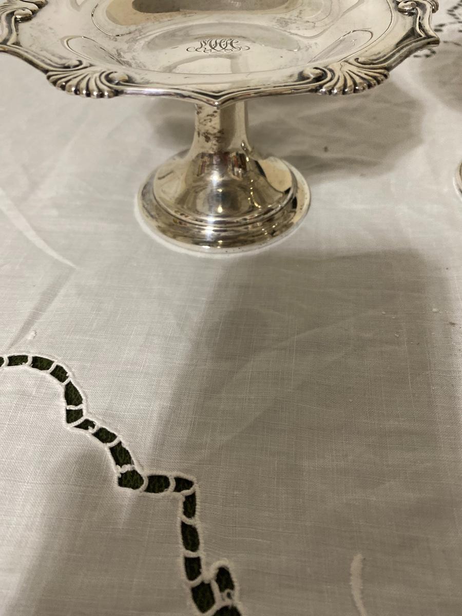 A monogrammed Tiffany & Co. Compote stamped Tiffany & Co. Makers 8701 Sterling Silver 925-1000 M. The compote measures 3” high x 5” diameter and weighs 170.4 grams and 109.6 dwt. The other compote is stamped Reed & Barton Sterling Weighted Reinforced 36. It is 4.5” high x 5.5” diameter. It weighs 91.5 dwt and 142.2 grams (weighted).