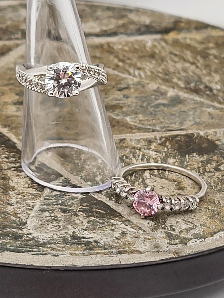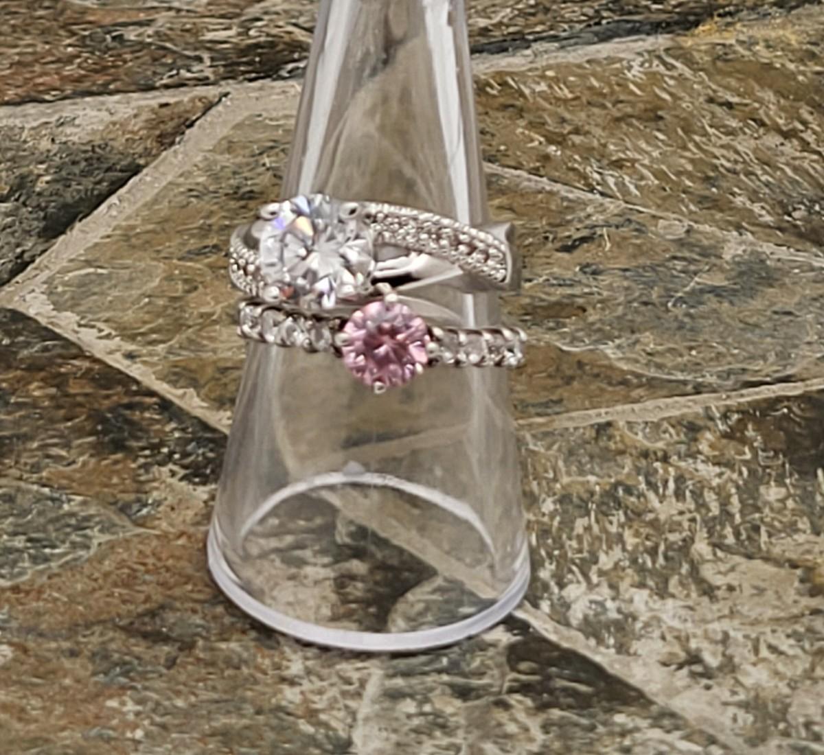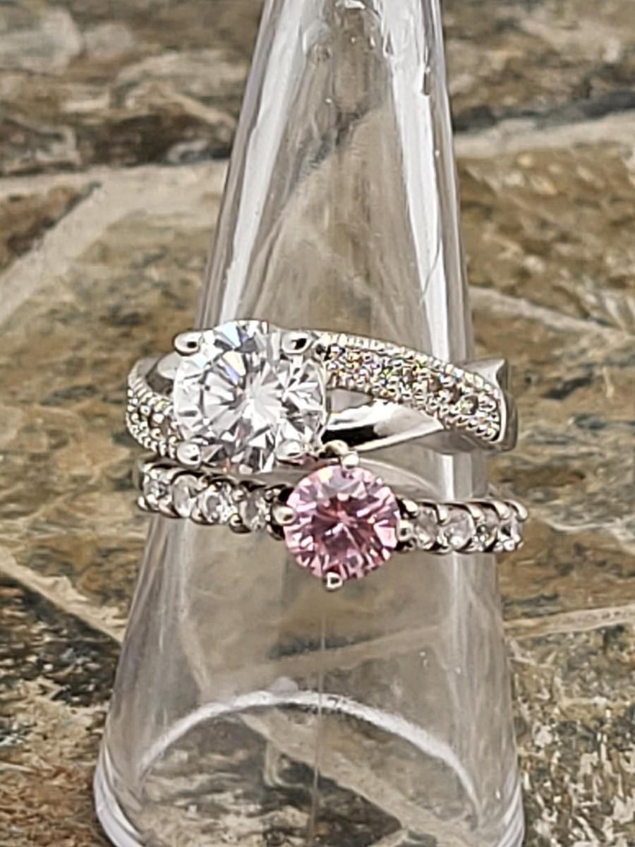 Sparkly clear CZ stone center with clear stone sides, size 7.