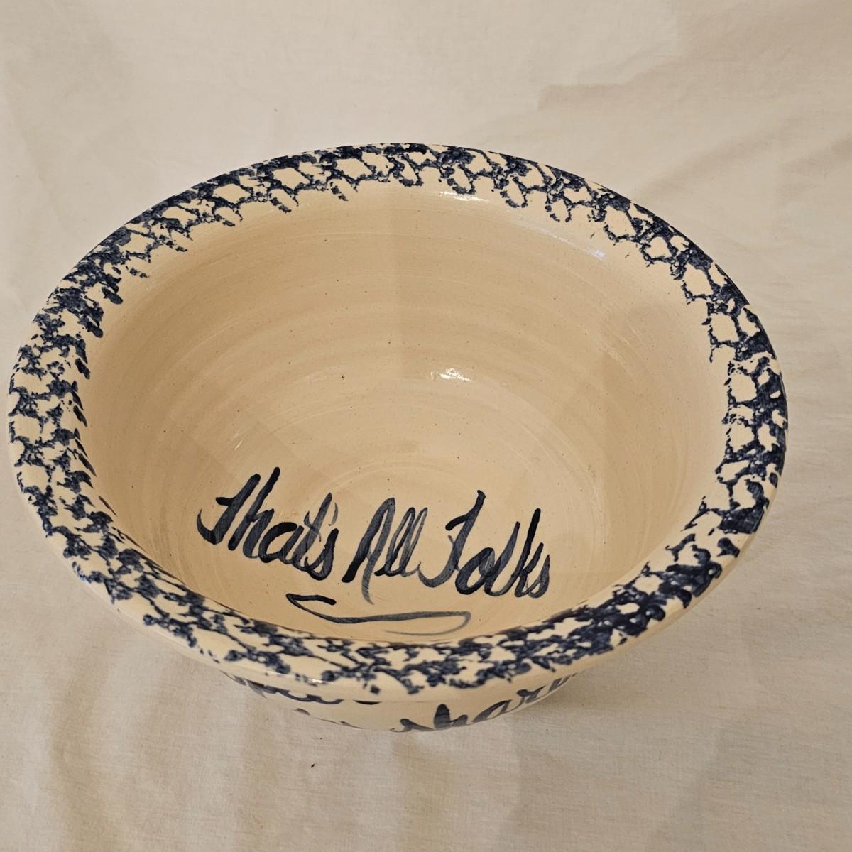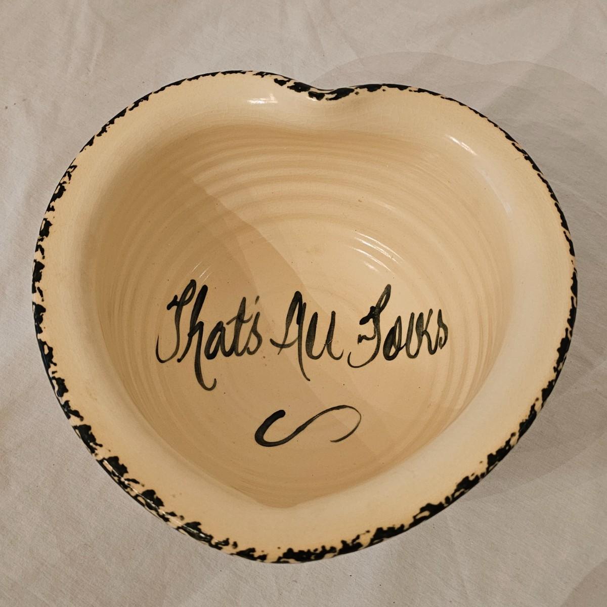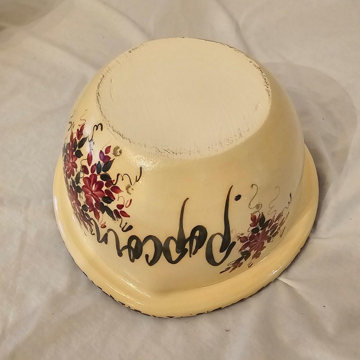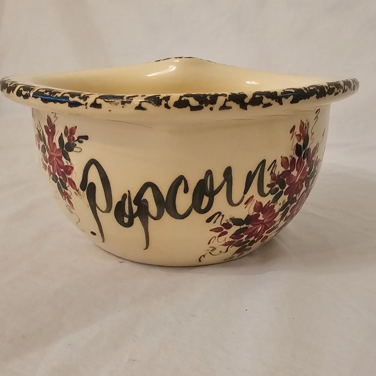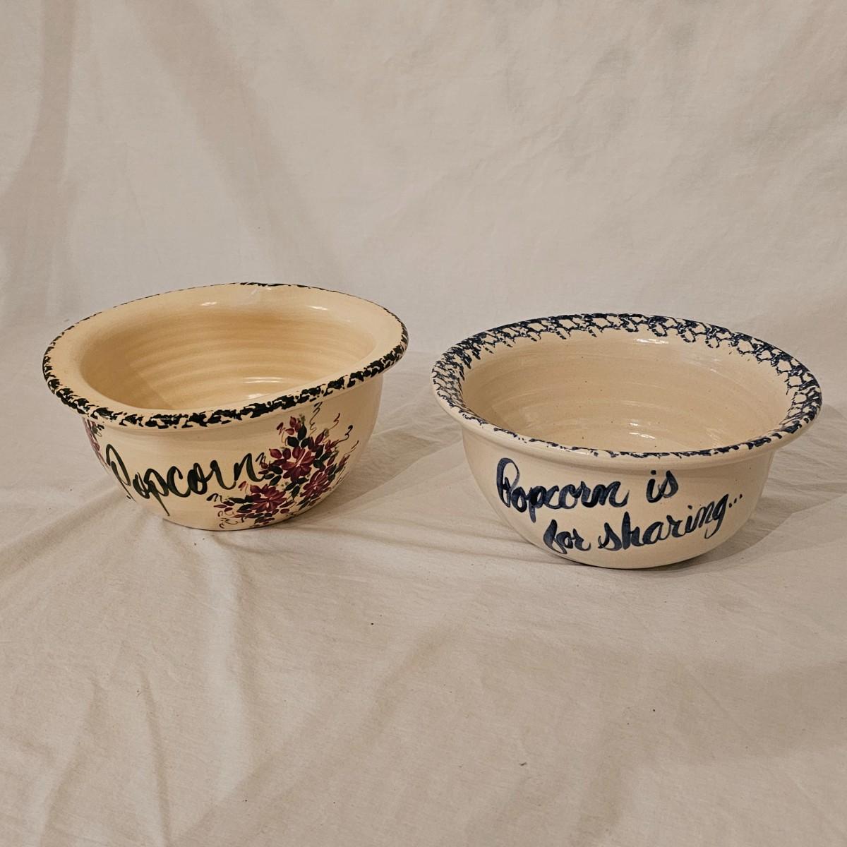 A pair of fun decorative bowls for popcorn or other. One round, one heart shaped, both measure 11" D x 5"H. Cute graphics inside each. See photos for details. Shipping available.