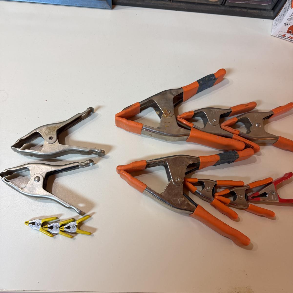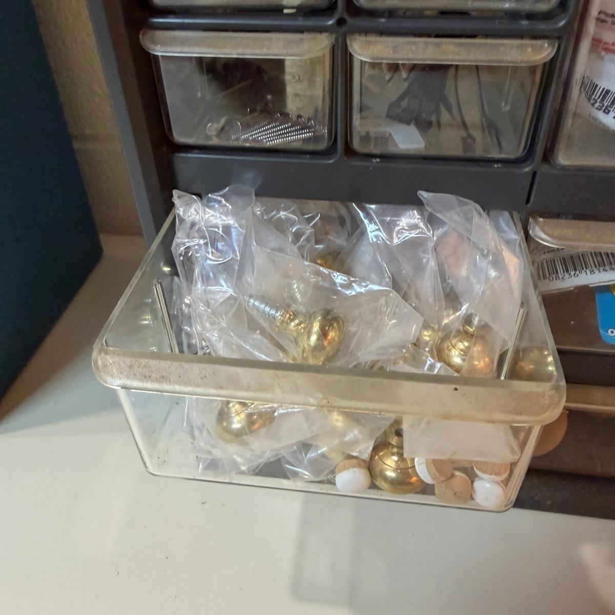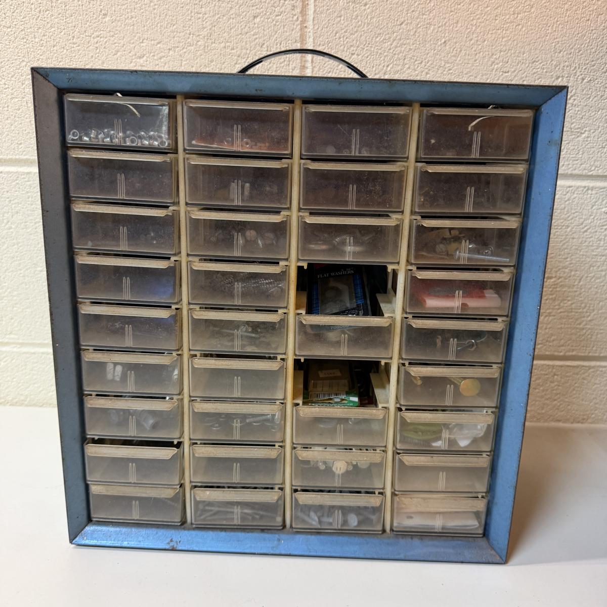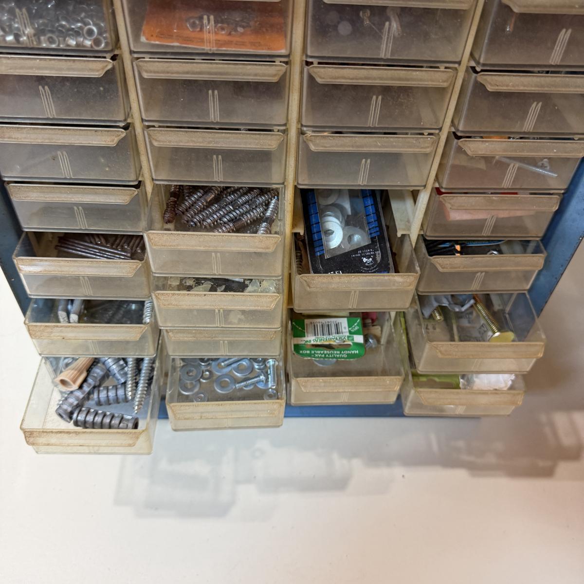 Lot includes a metal 36 drawer storage organizer, plastic 38 drawer storage and a selection of metal clamps. Storage organizers includes contents. Largest organizer measures 14” x 6” x 18”H.