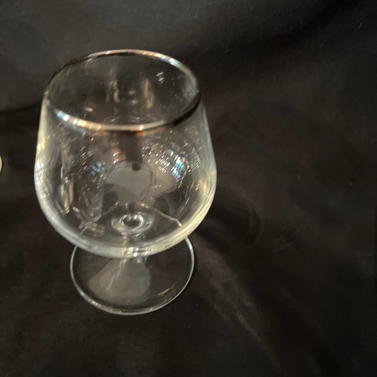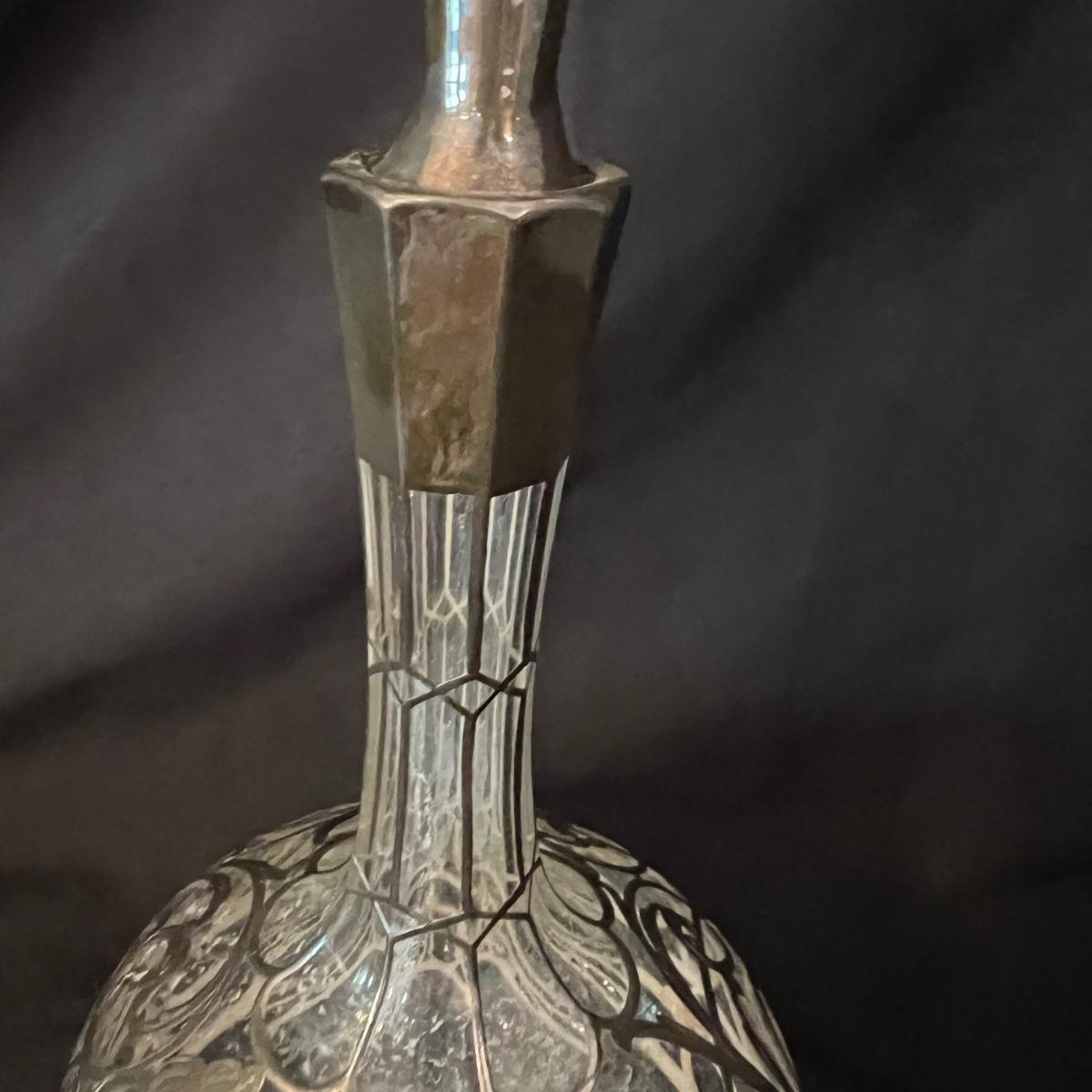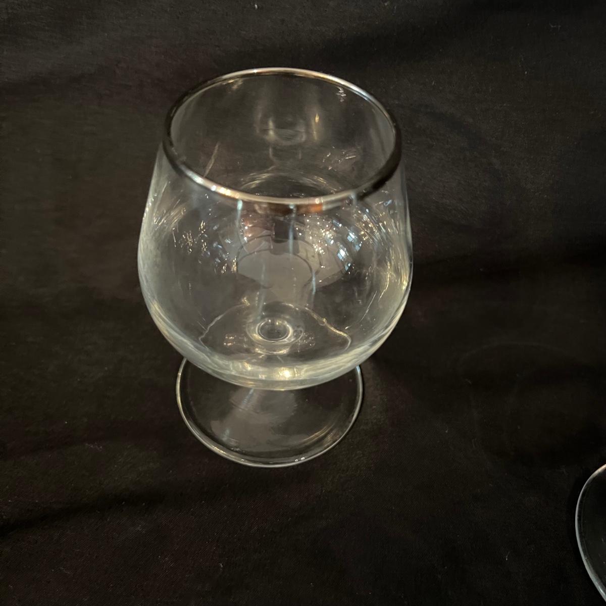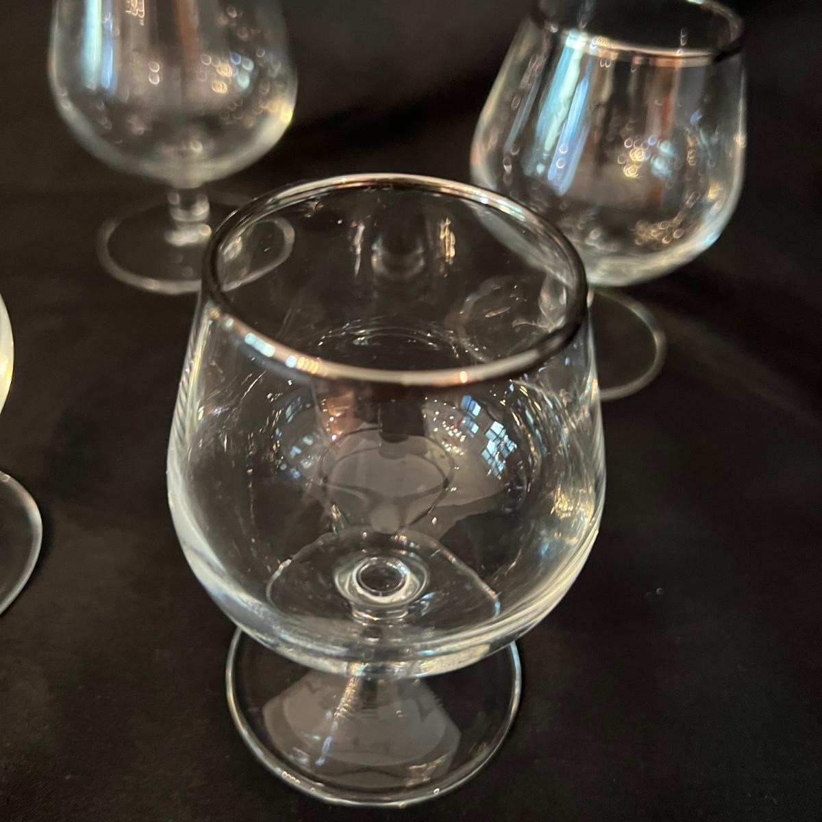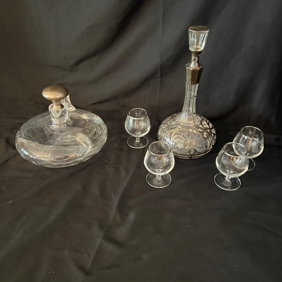 Two beauties. The taller decanter is overlayed with an ornamental silver filigree. It measures approximately 6"D x 12"H. The four smaller snifter-like glasses are rimmed with a silver edge at the lip and measure approximately 3.5"D x 4"H. The shorter decanter is also glass, with an apparently silver painted stopper. It measures approximately 9"D x 7"H.