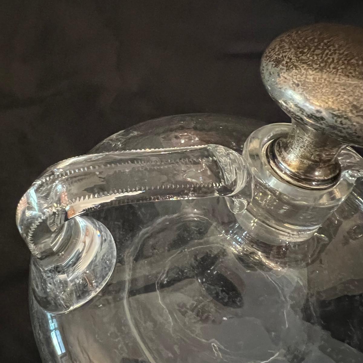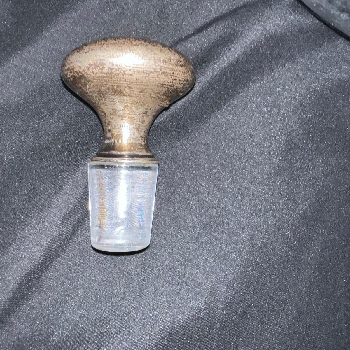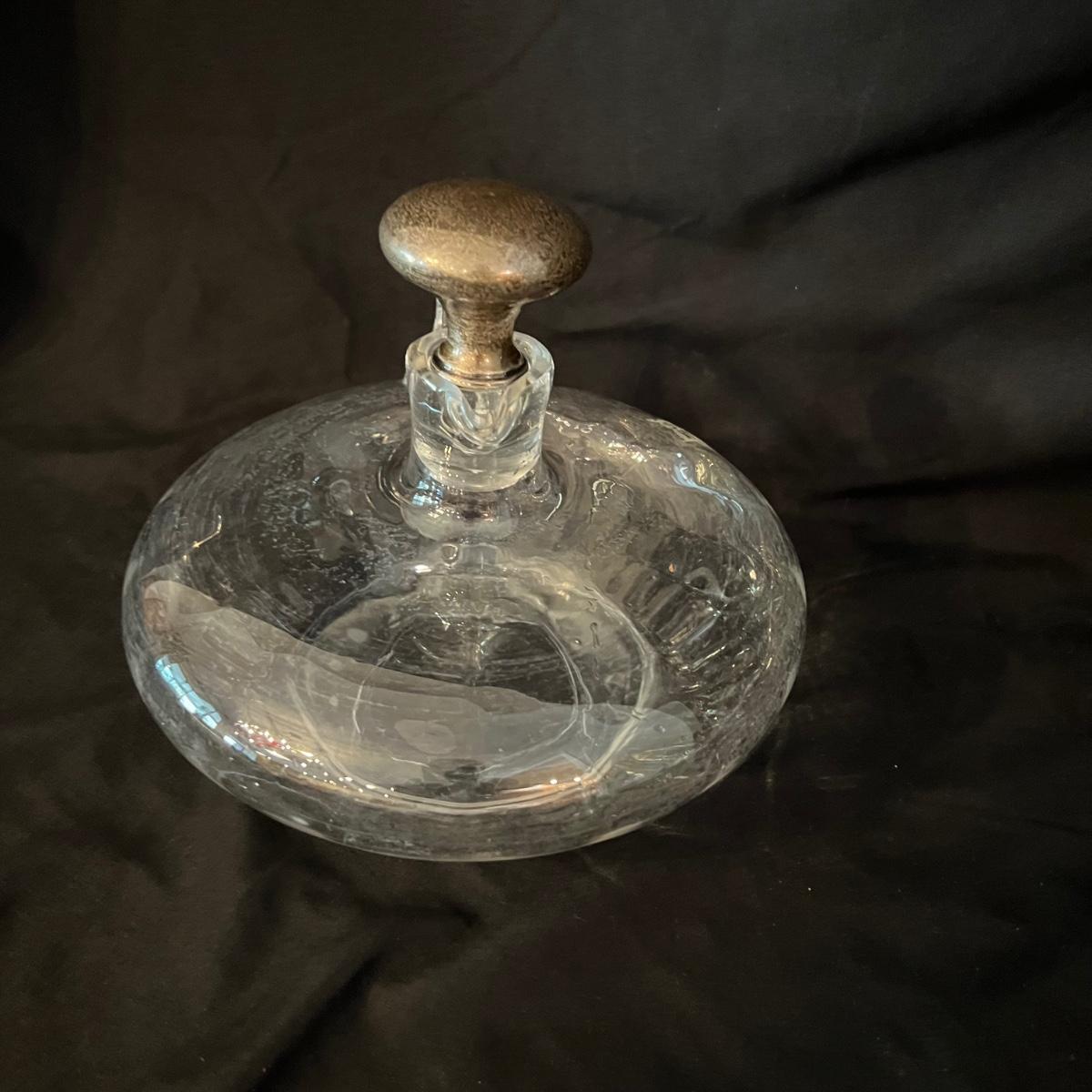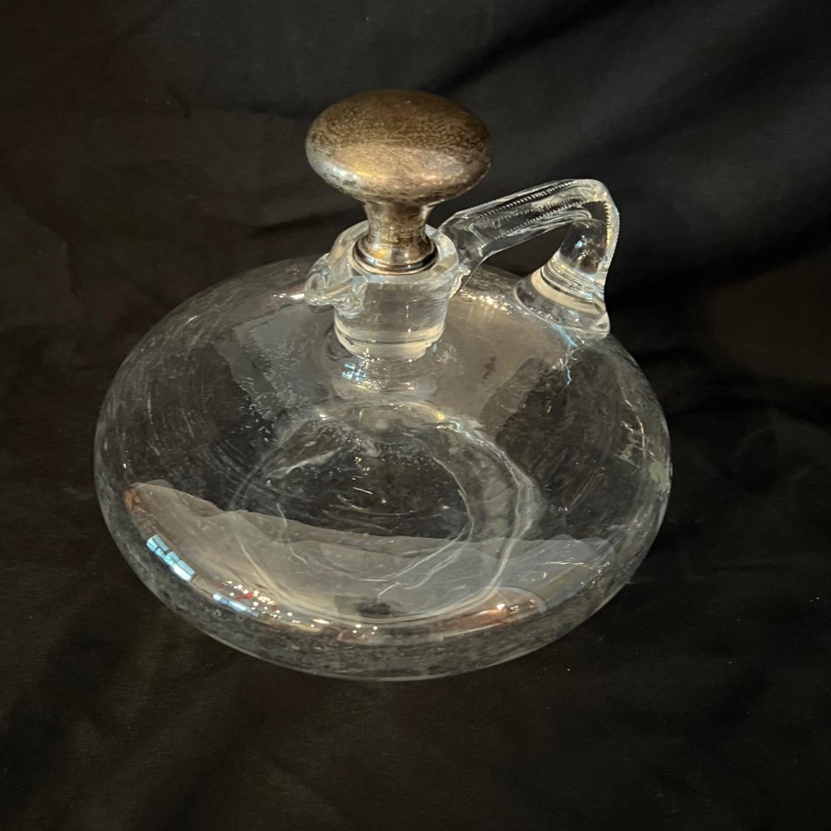 Two beauties. The taller decanter is overlayed with an ornamental silver filigree. It measures approximately 6"D x 12"H. The four smaller snifter-like glasses are rimmed with a silver edge at the lip and measure approximately 3.5"D x 4"H. The shorter decanter is also glass, with an apparently silver painted stopper. It measures approximately 9"D x 7"H.
