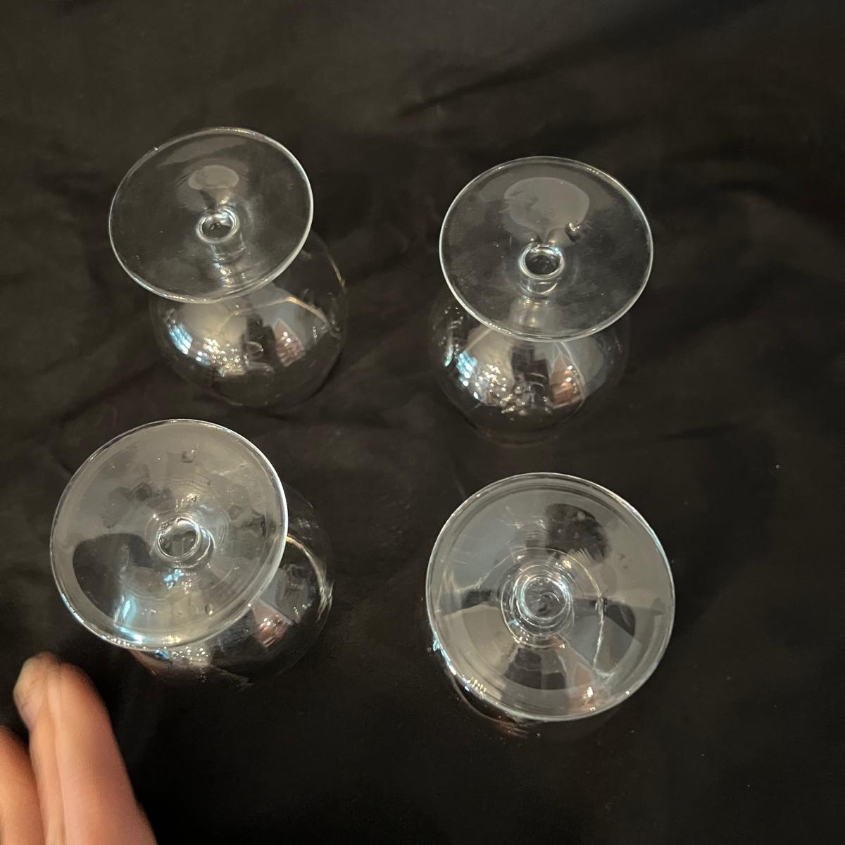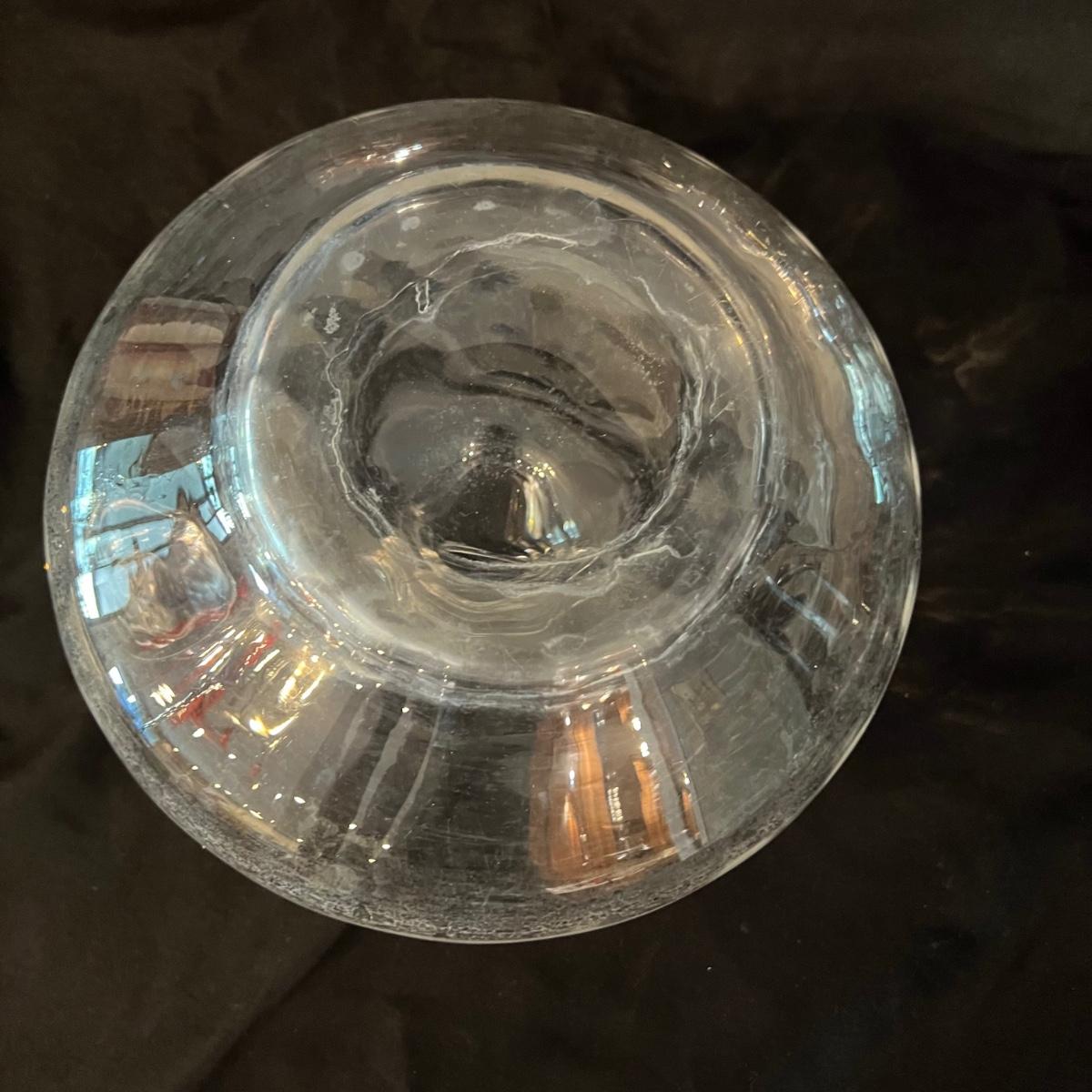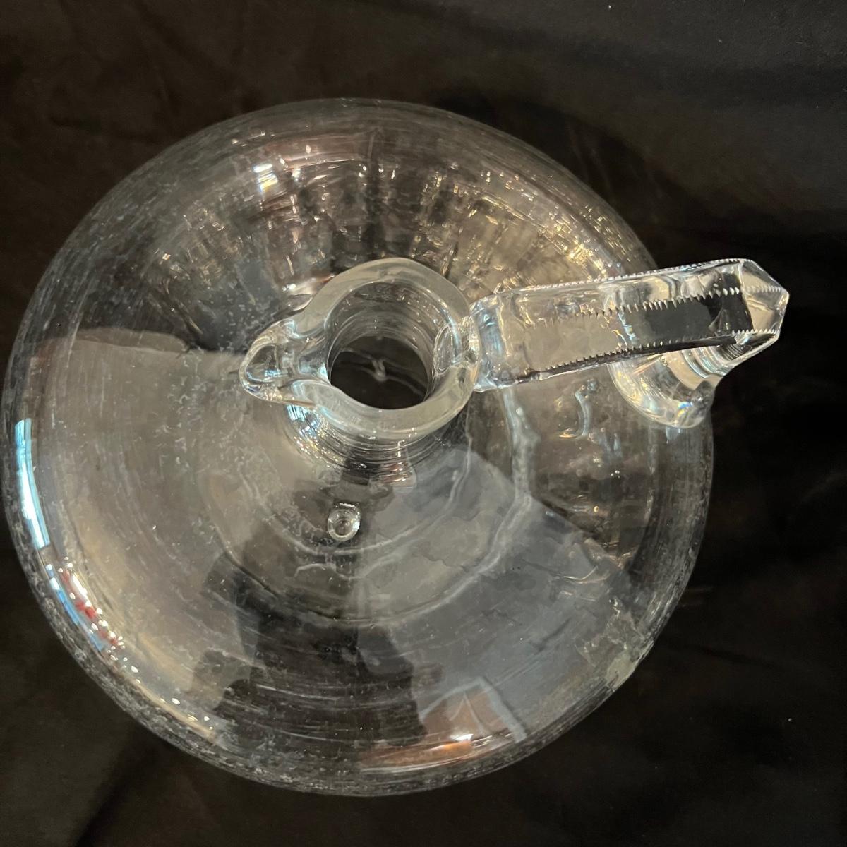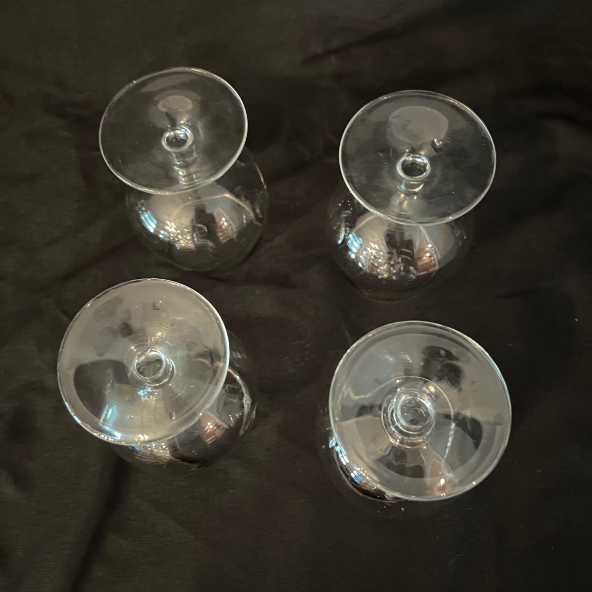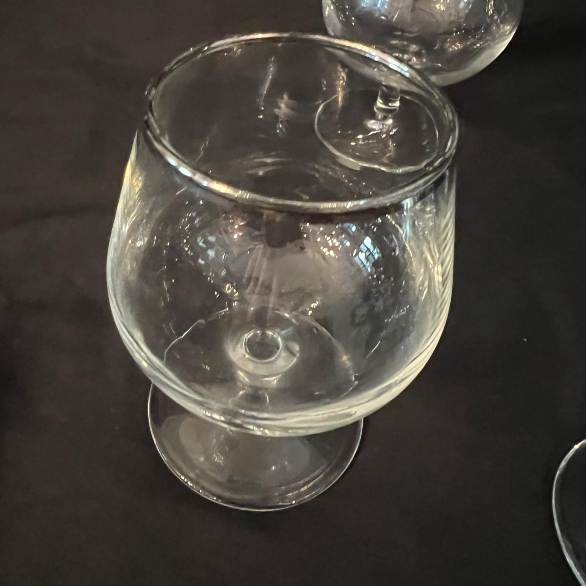 Two beauties. The taller decanter is overlayed with an ornamental silver filigree. It measures approximately 6"D x 12"H. The four smaller snifter-like glasses are rimmed with a silver edge at the lip and measure approximately 3.5"D x 4"H. The shorter decanter is also glass, with an apparently silver painted stopper. It measures approximately 9"D x 7"H.
