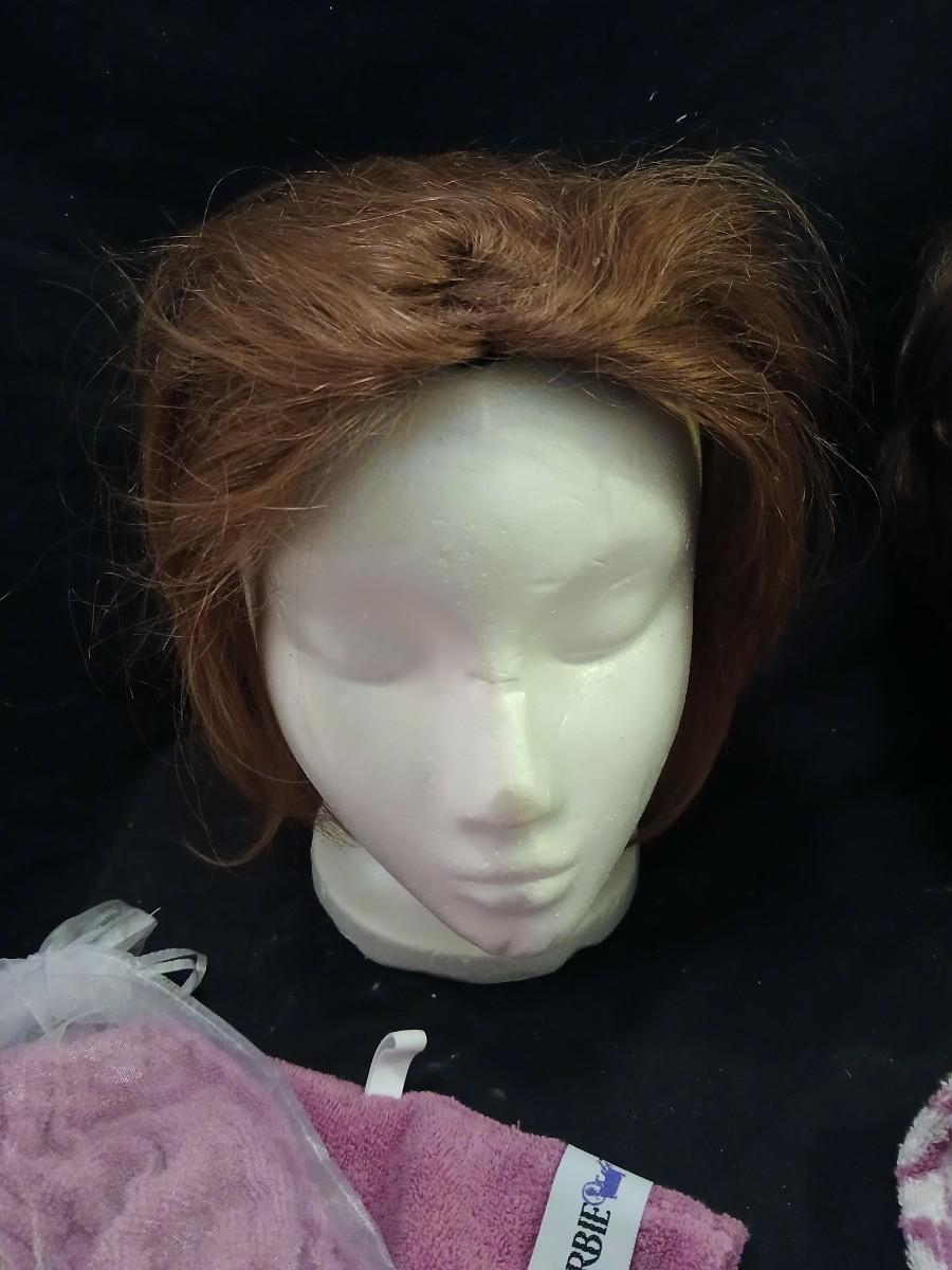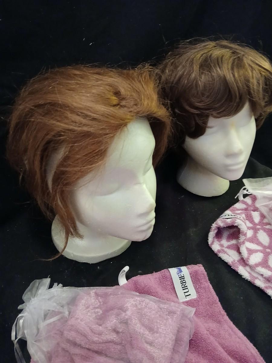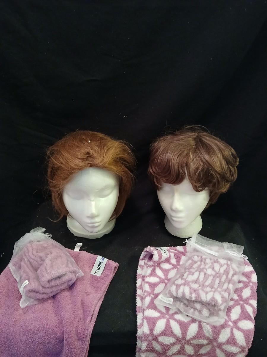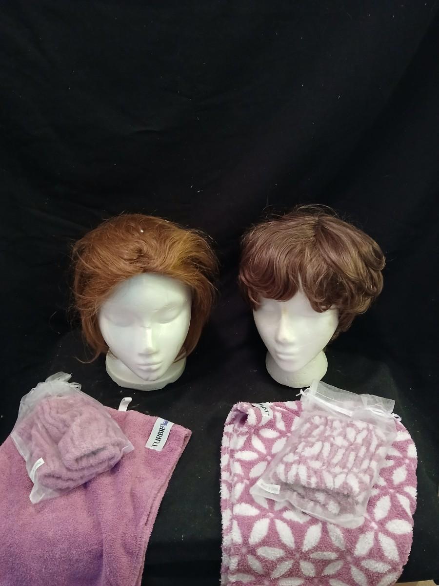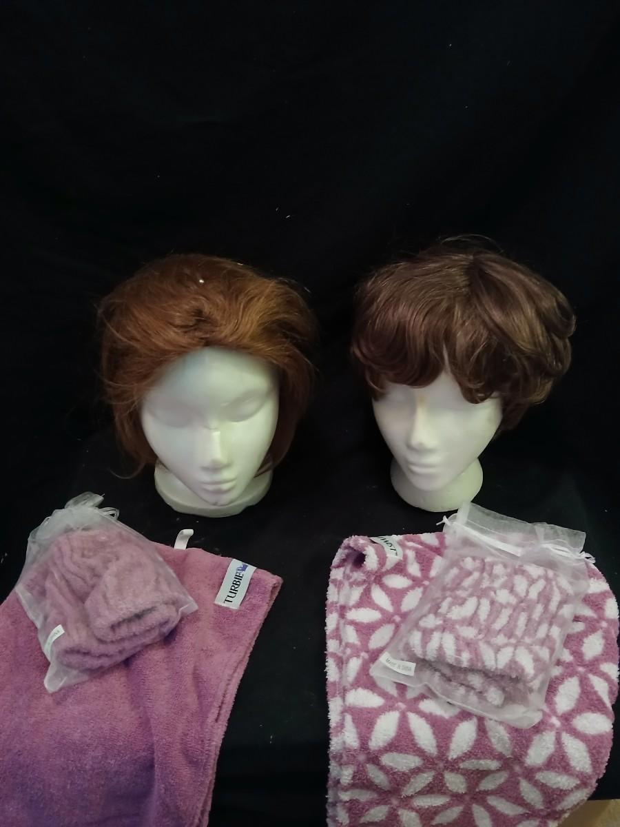 Two Styrofoam heads with wigs and two Turbie hair towels