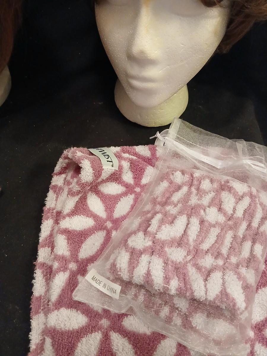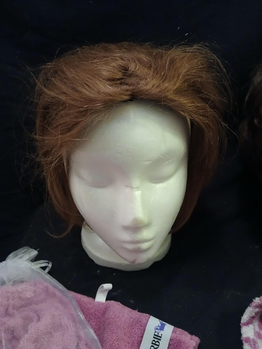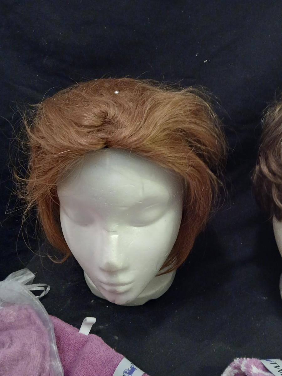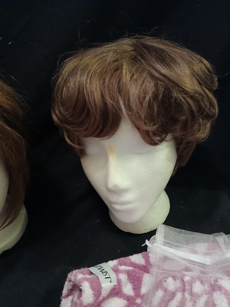 Two Styrofoam heads with wigs and two Turbie hair towels