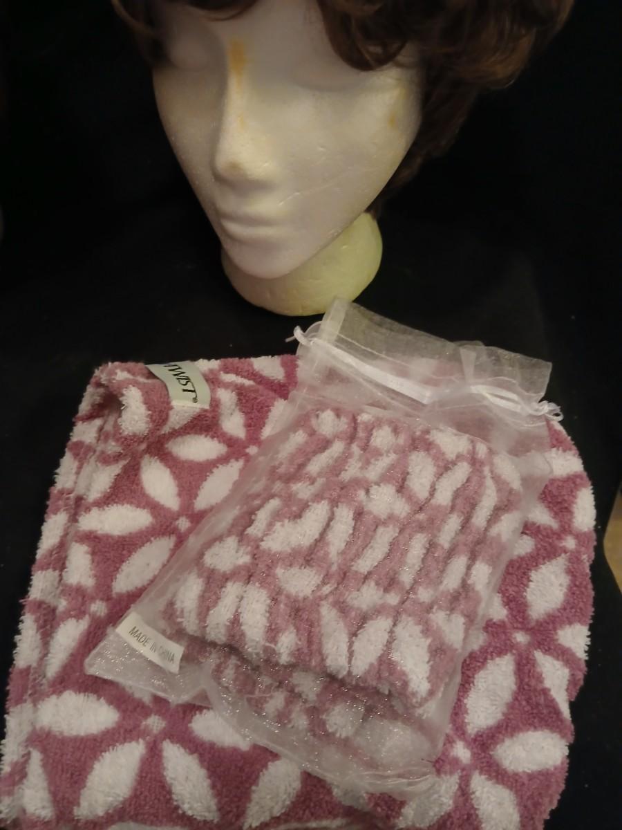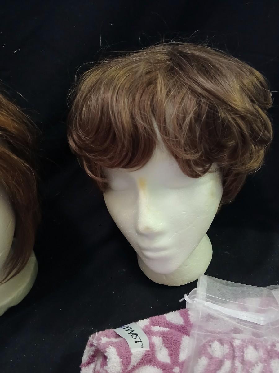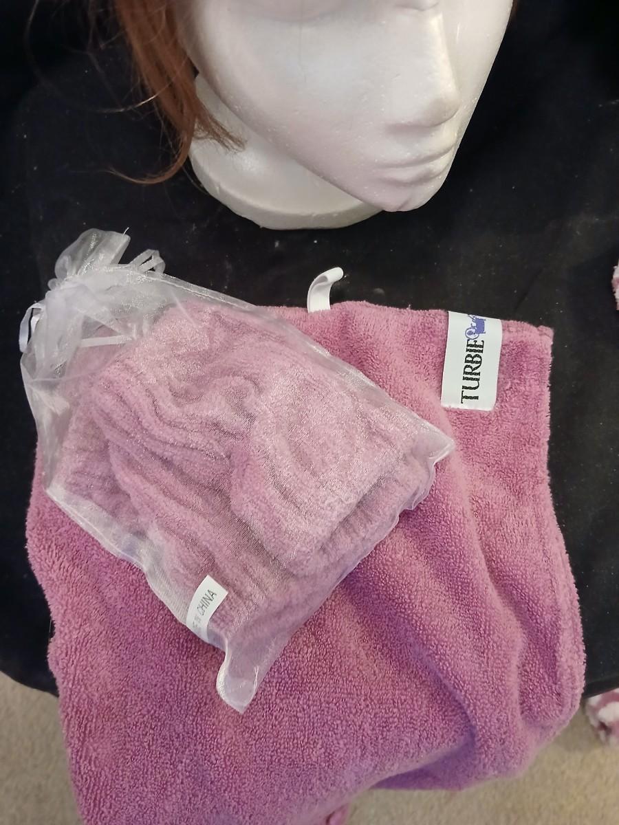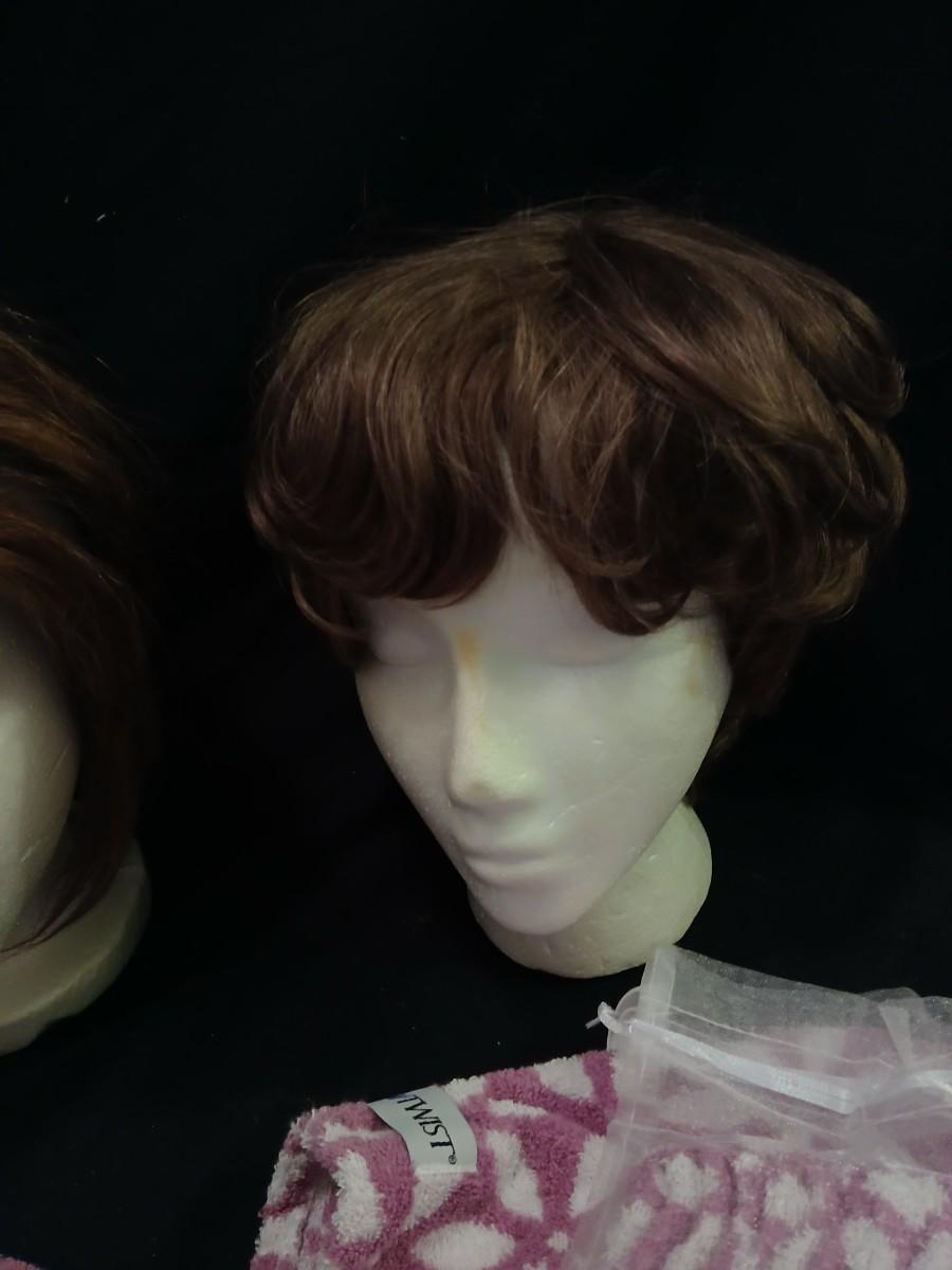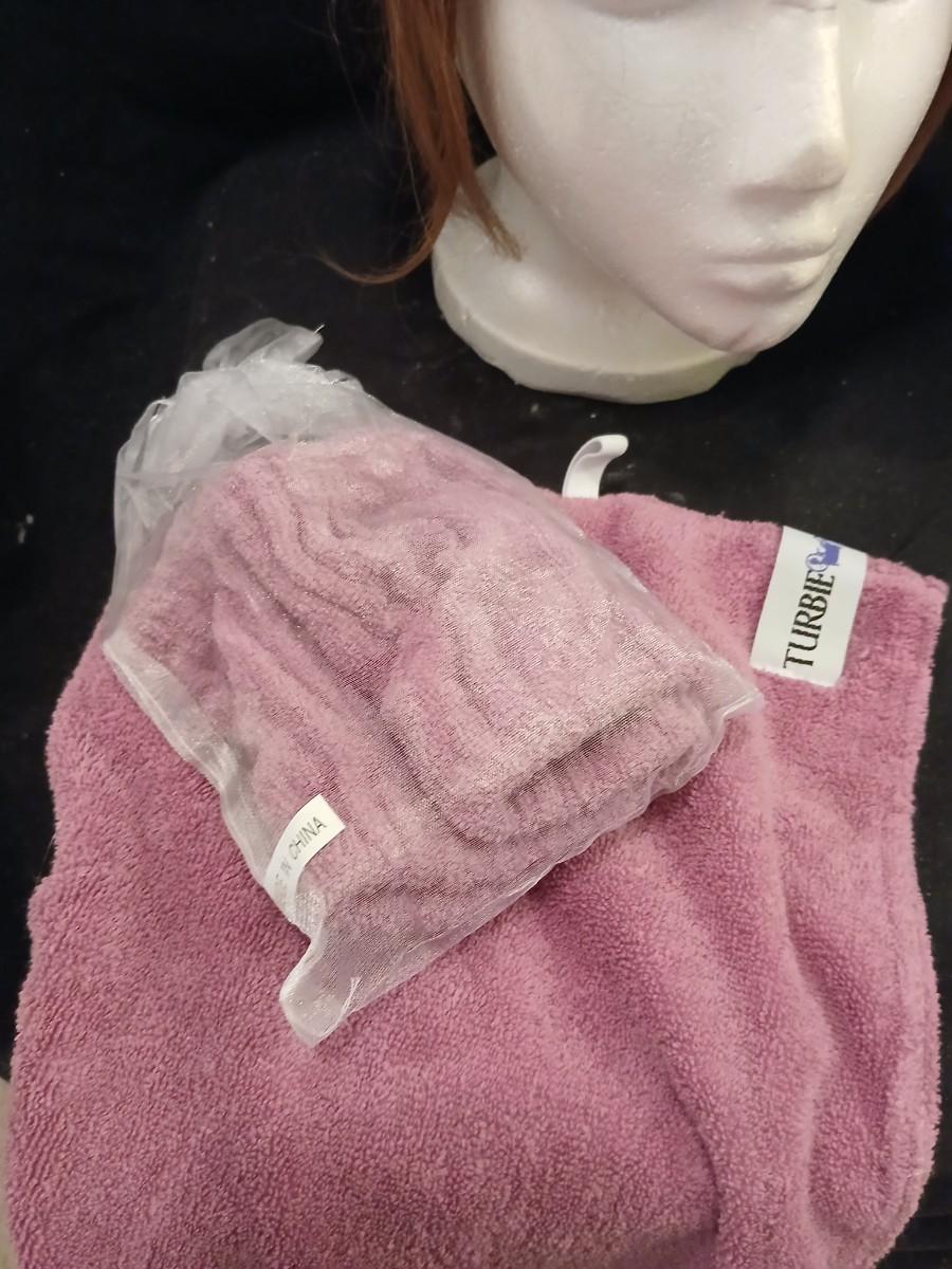 Two Styrofoam heads with wigs and two Turbie hair towels