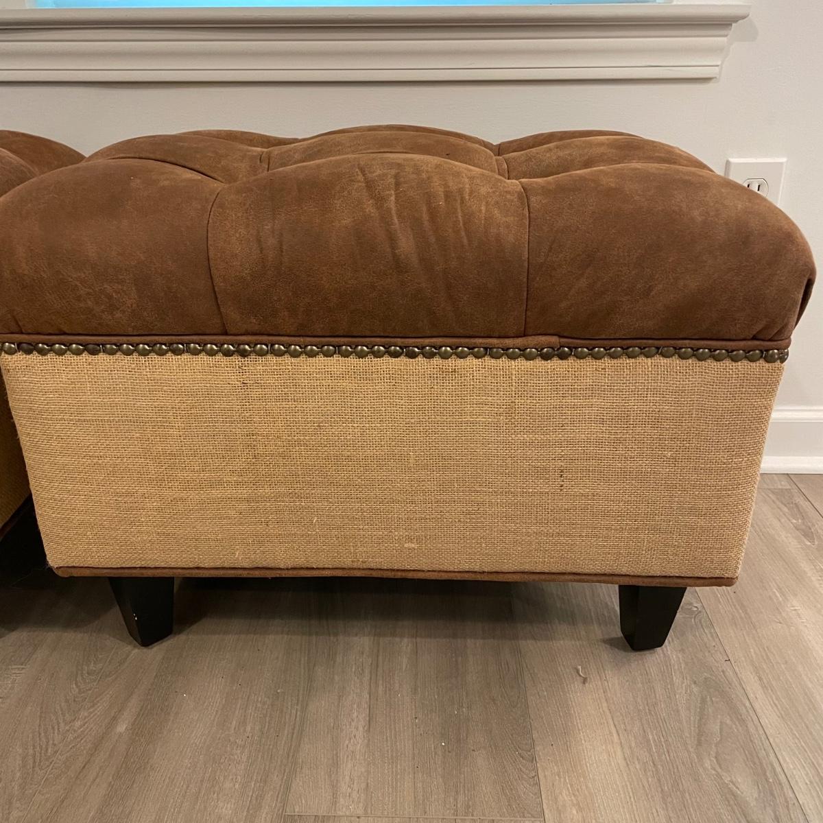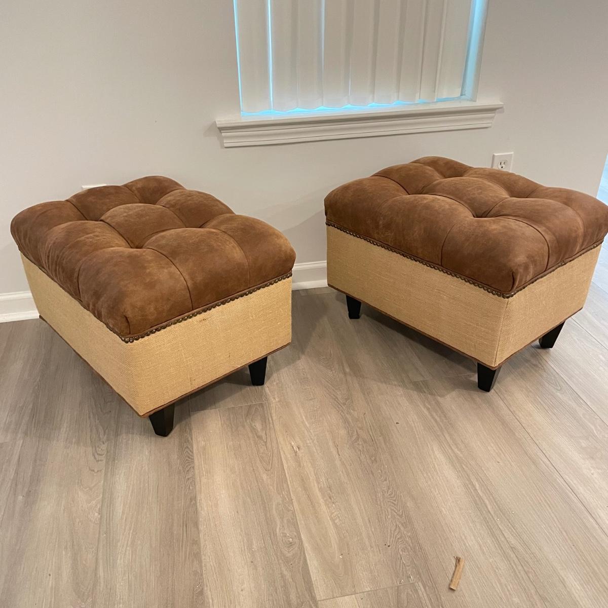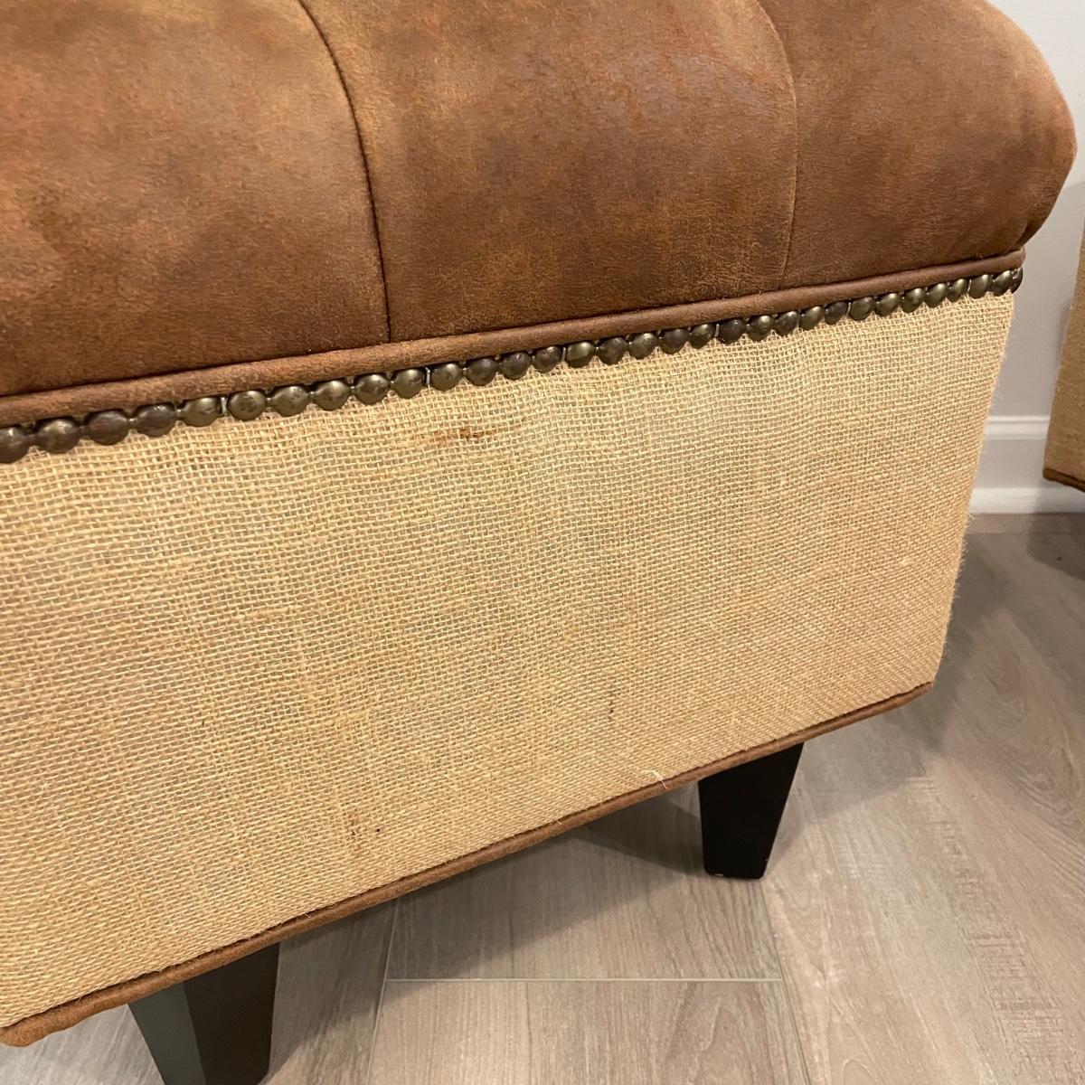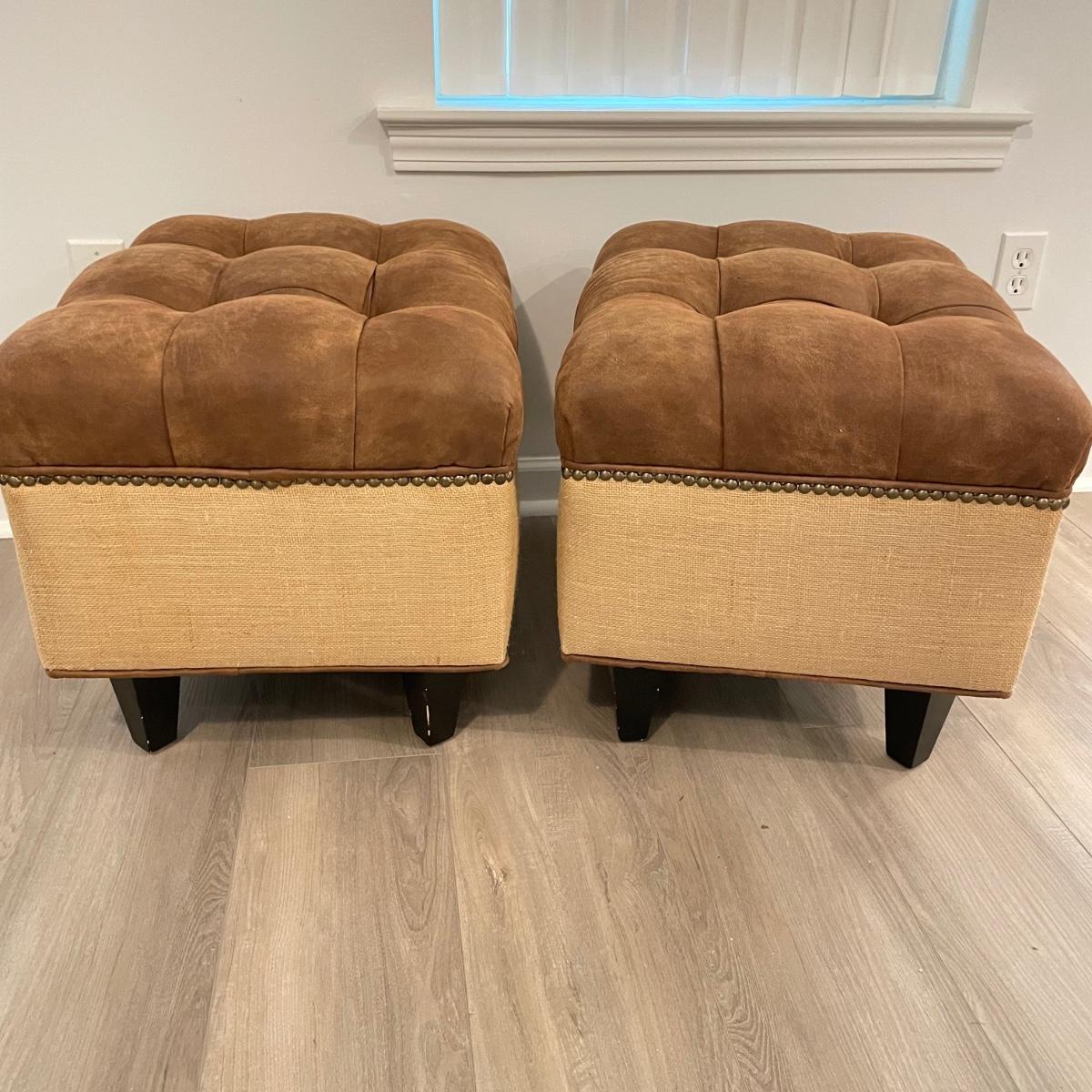 A pair of what appears to be suede tufted ottomans though seller claimed they are vegan leather. These rectangle ottomans have a lower border with a burlap style textile with upholstery tacks. The suede material is a very warm brown with hint of copper. Each measure 24” x 17” x 18”H. These are one piece ottomans, with no storage inside. This auction has another lot with a round ottoman listed with what appears to be the same suede-like fabric. See images. Local pick up only.
