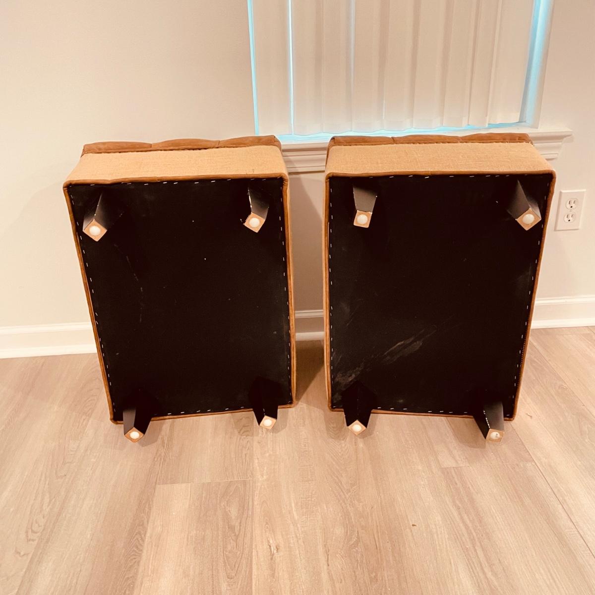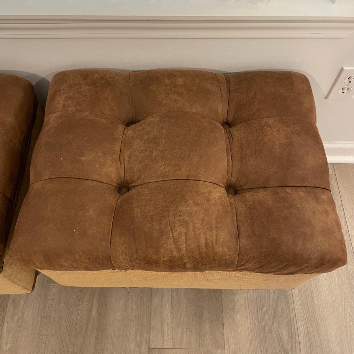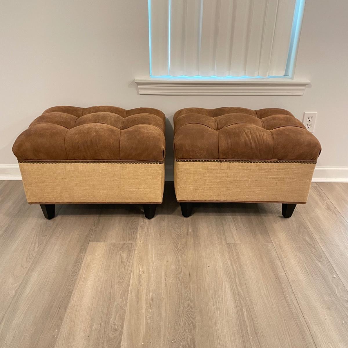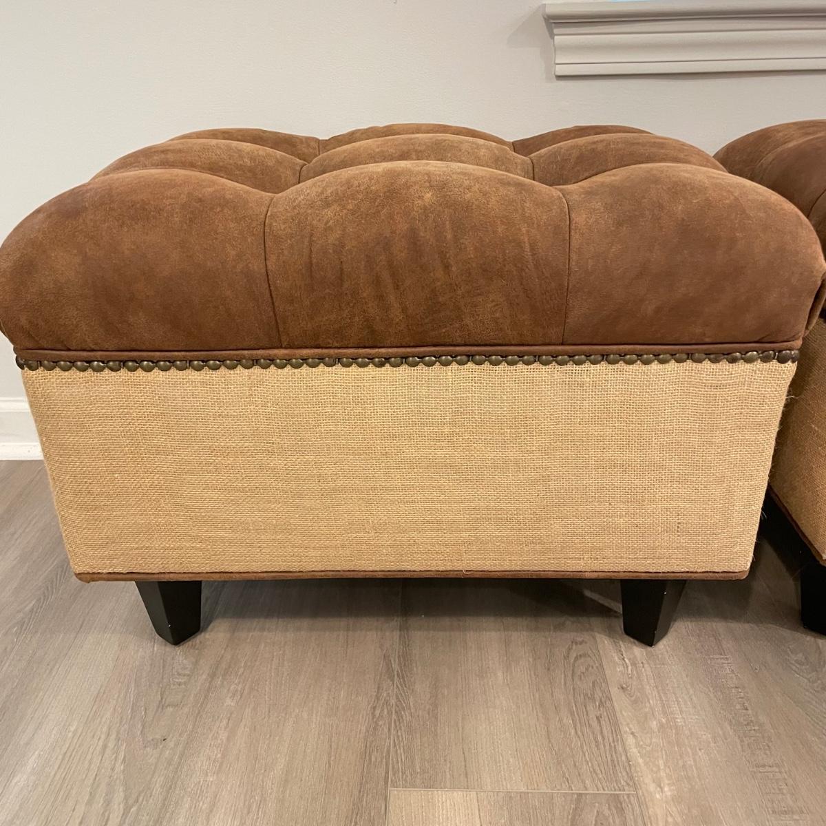 A pair of what appears to be suede tufted ottomans though seller claimed they are vegan leather. These rectangle ottomans have a lower border with a burlap style textile with upholstery tacks. The suede material is a very warm brown with hint of copper. Each measure 24” x 17” x 18”H. These are one piece ottomans, with no storage inside. This auction has another lot with a round ottoman listed with what appears to be the same suede-like fabric. See images. Local pick up only.