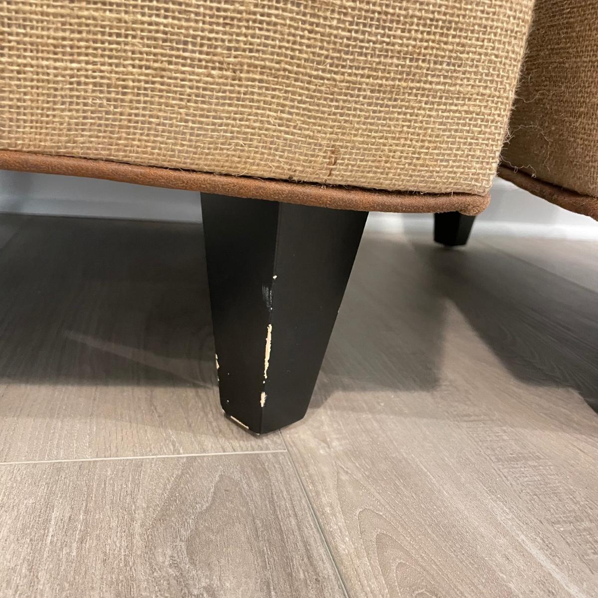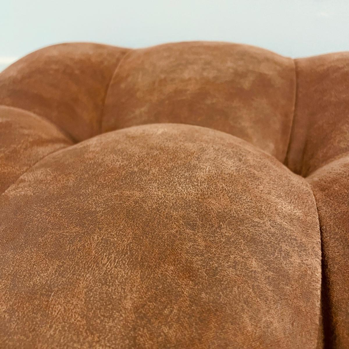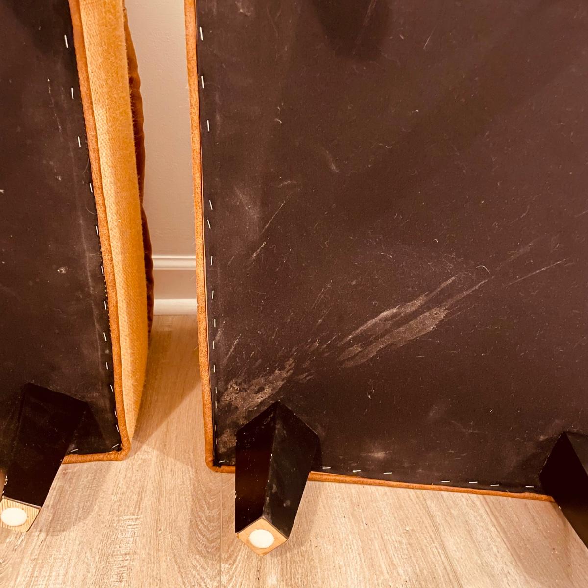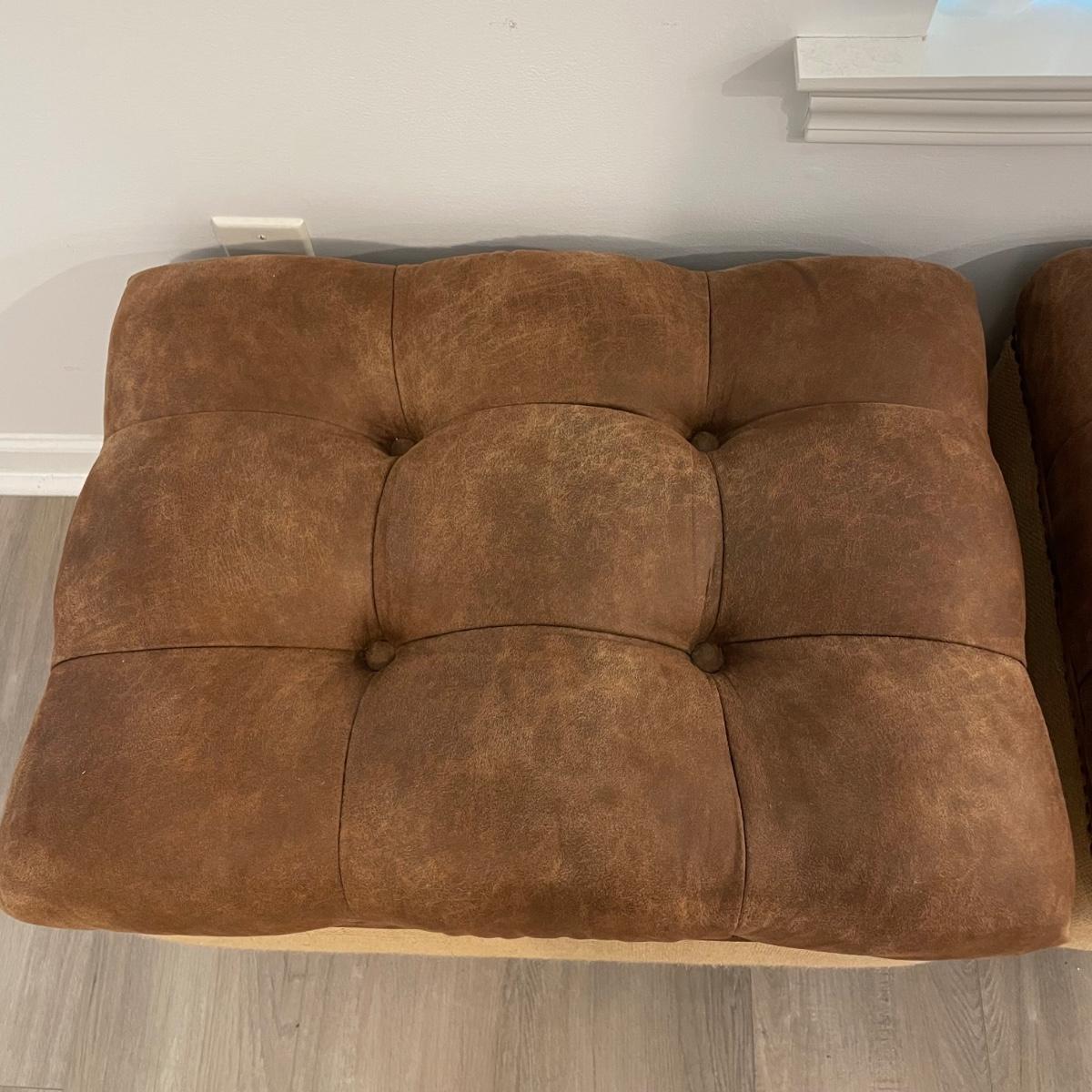 A pair of what appears to be suede tufted ottomans though seller claimed they are vegan leather. These rectangle ottomans have a lower border with a burlap style textile with upholstery tacks. The suede material is a very warm brown with hint of copper. Each measure 24” x 17” x 18”H. These are one piece ottomans, with no storage inside. This auction has another lot with a round ottoman listed with what appears to be the same suede-like fabric. See images. Local pick up only.