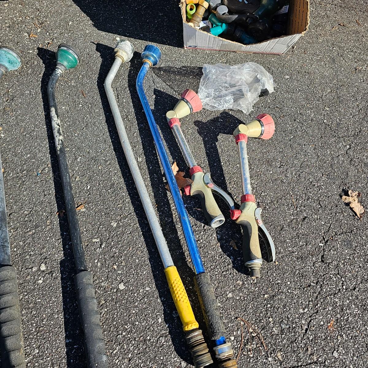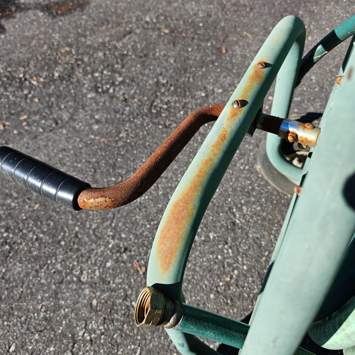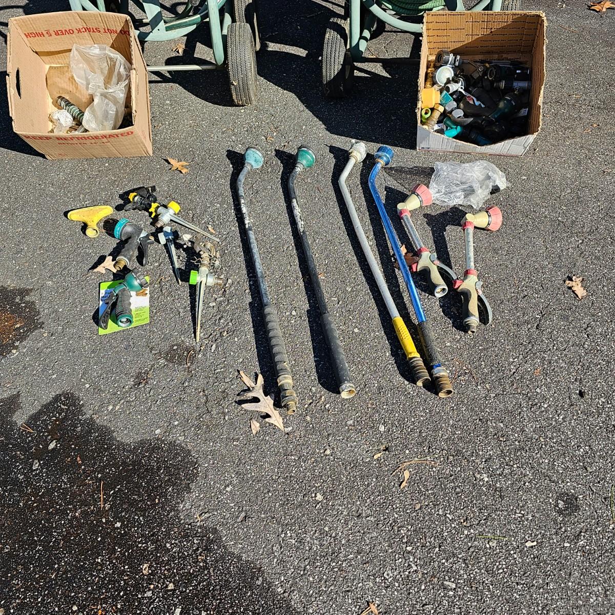 A pair of steel Suncast brand hose carts to store hoses on. Each unit has four pneumatic tires, a hand crank to wind hoses up when done, and connecting points for water supply. Carts measure 24" x 40" x 44"H. Multiple rust spots on both items, and tires currently flat. Also includes four other lengths of hose, several wand attachments, two boxes of connecting pieces and sprinkling heads. See photos for details. Local pickup only.