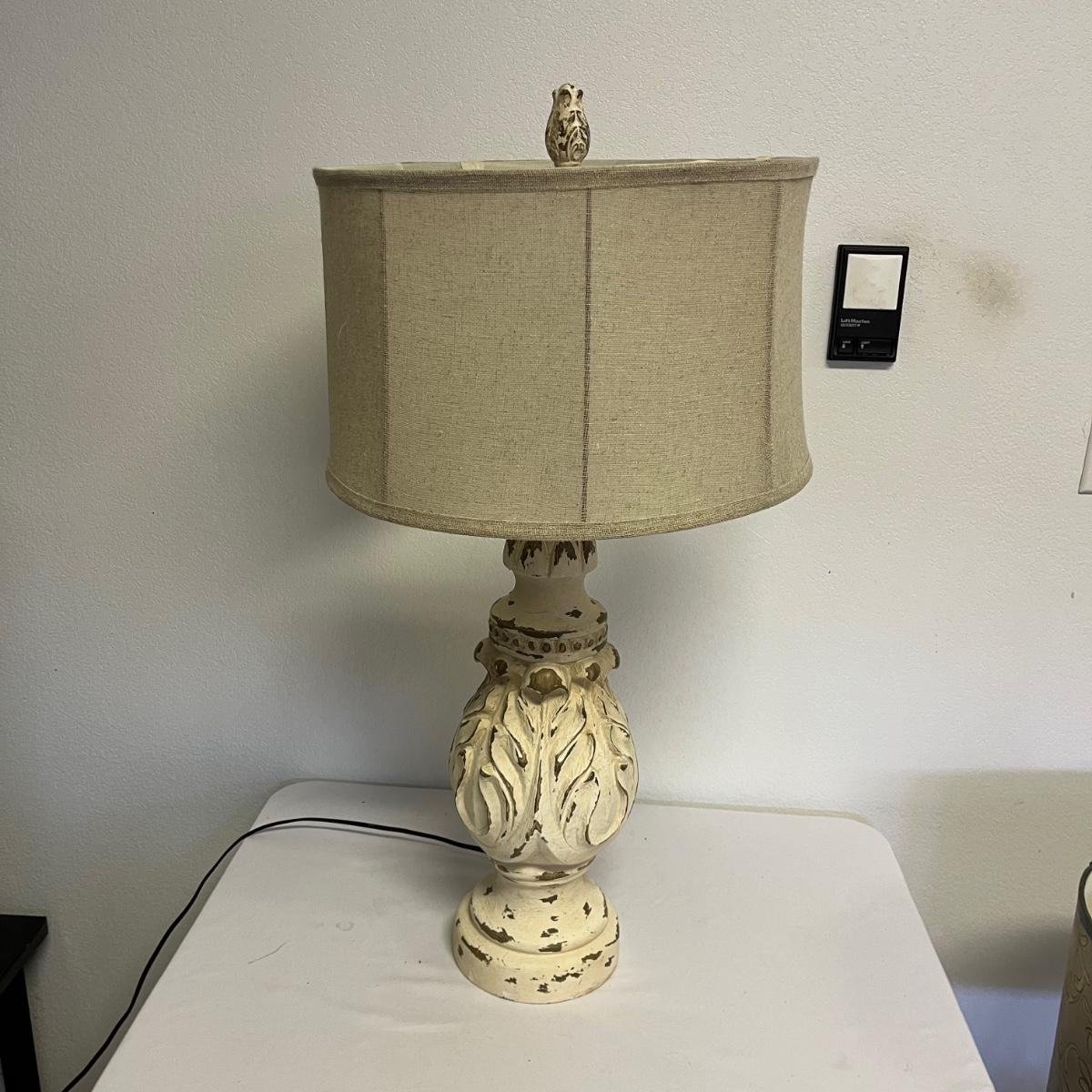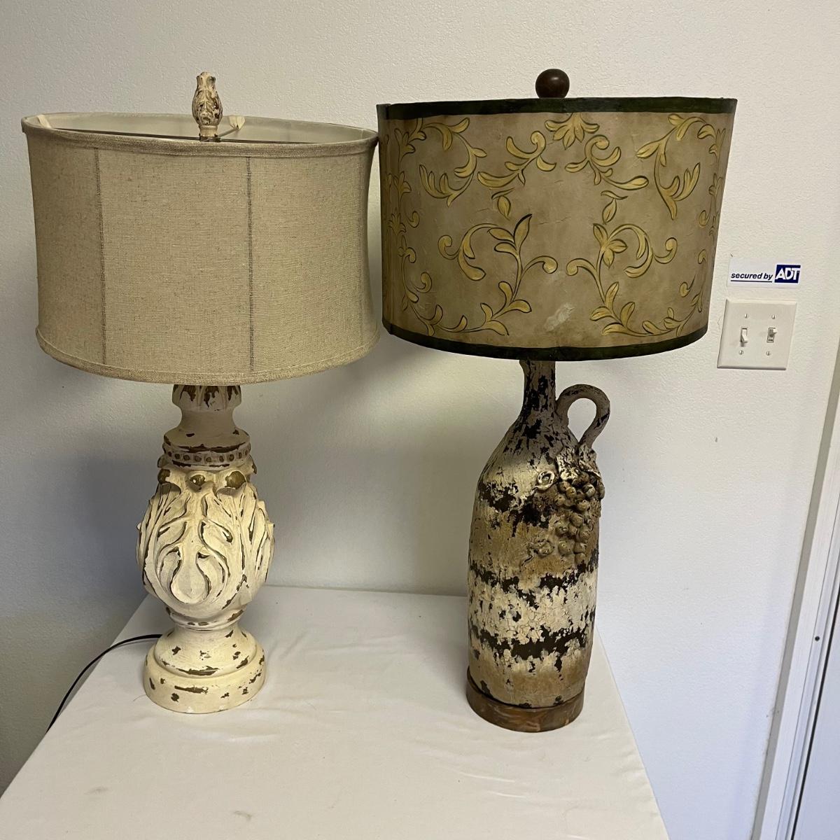 Lot includes one ceramic table lamp and one table lamp that appears to be plaster. Tallest lamp with shade measures 15”D x32” tall. Both lights worked when tested.