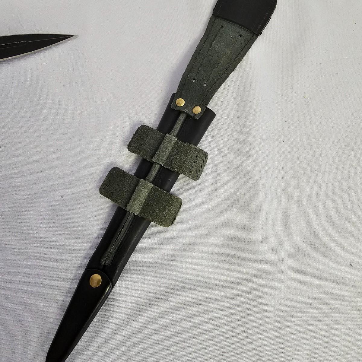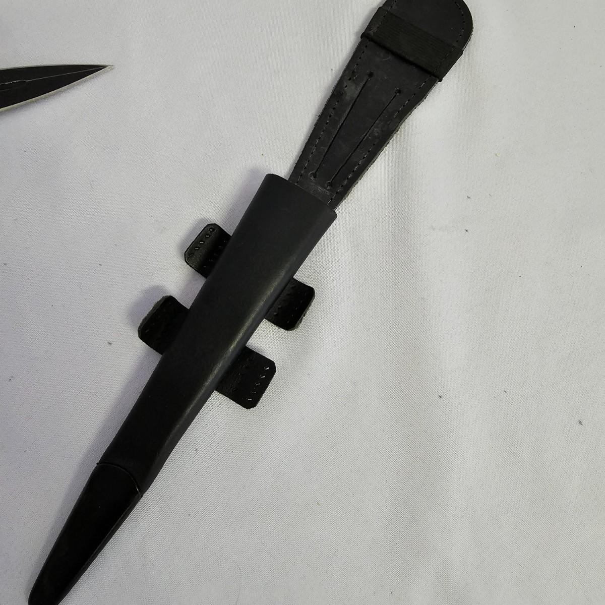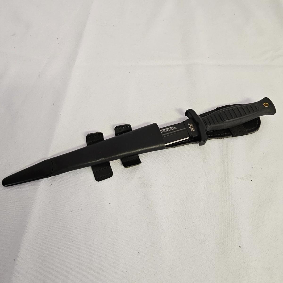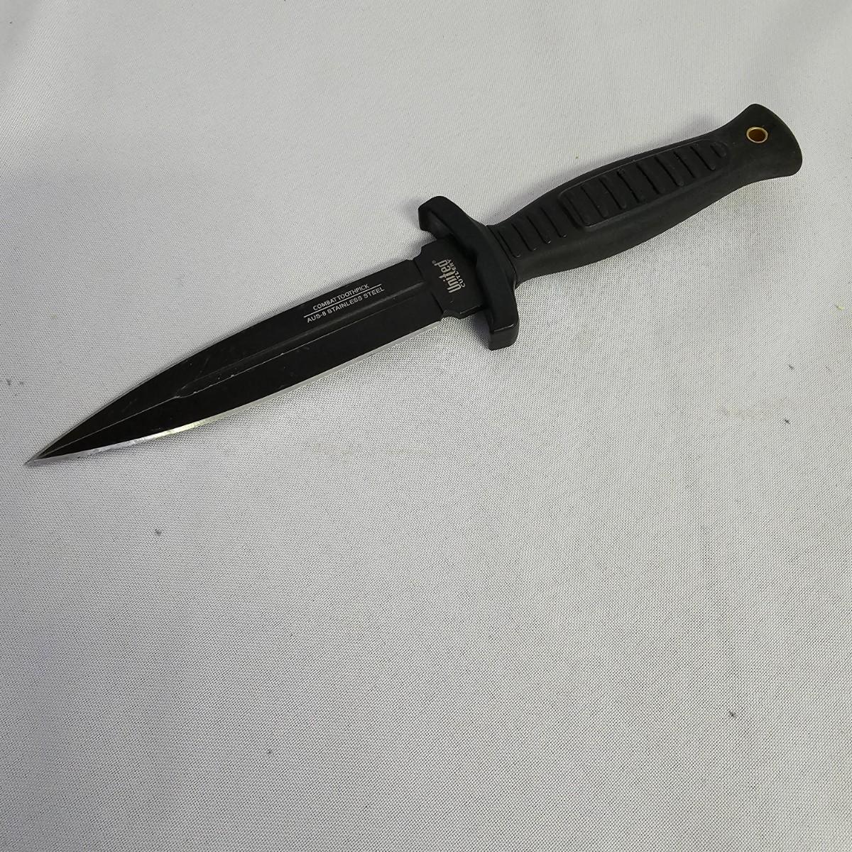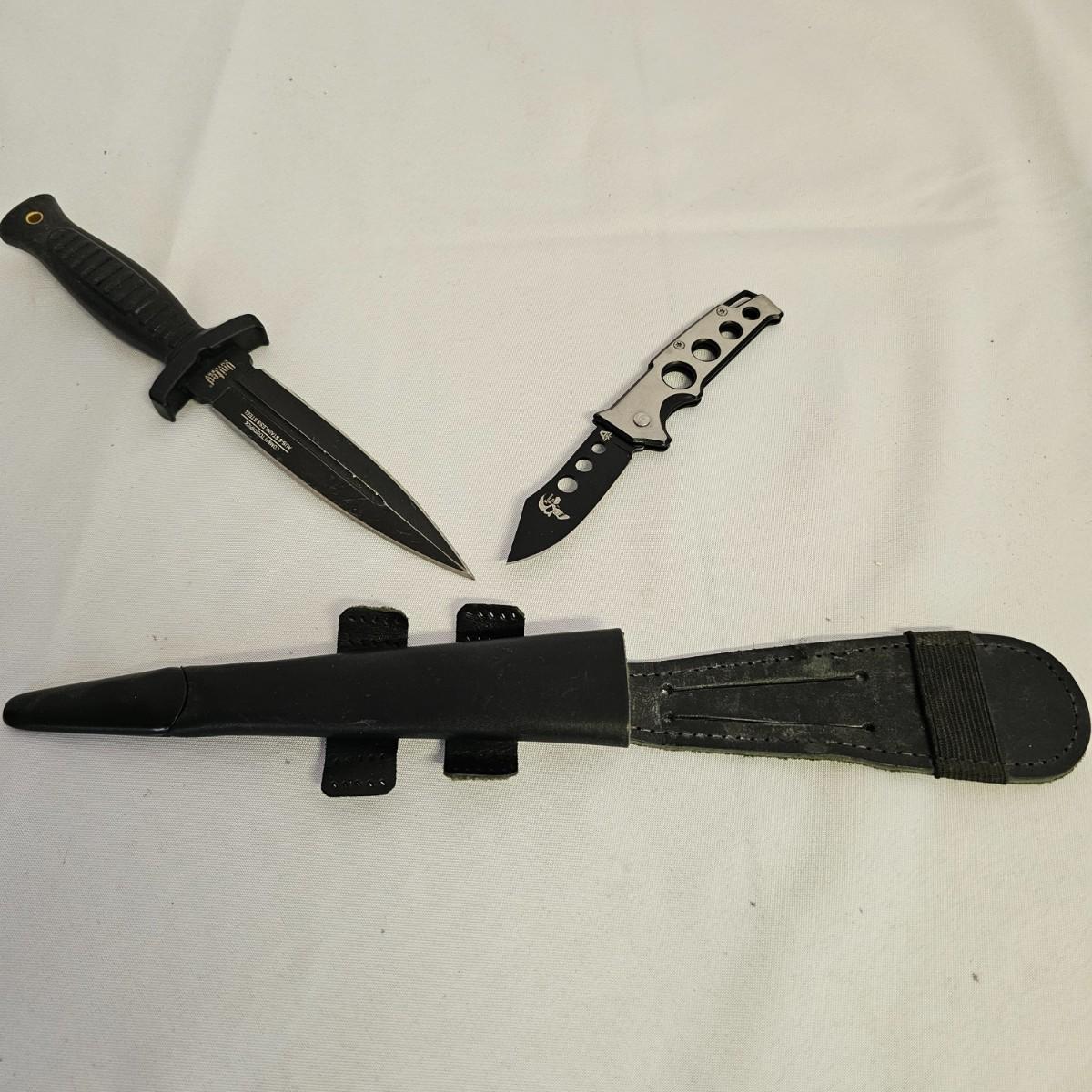 A pair of tactical style knives. One folding type pocket knife, measures 6" overall with a 2.5" blade. All metal construction. The sheathed knife is a combat toothpick with a stainless steel blade. 9.5" overall with 4.5" blade. Includes leather sheath. See photos for details. Shipping available.