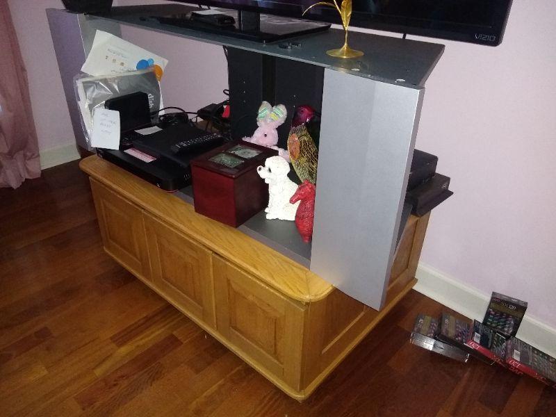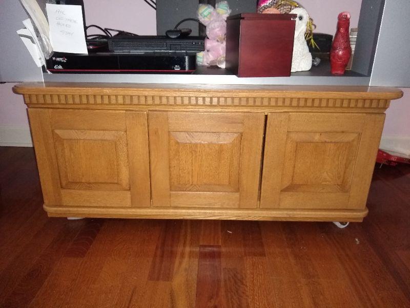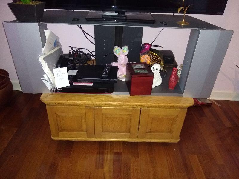 Two tv stands, shown stacked for additional height. When stacked, measures 51¾ inches wide by 16⅜ deep. Contents shown in picture are not included with stands.