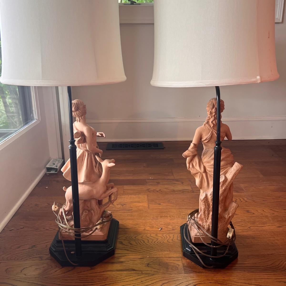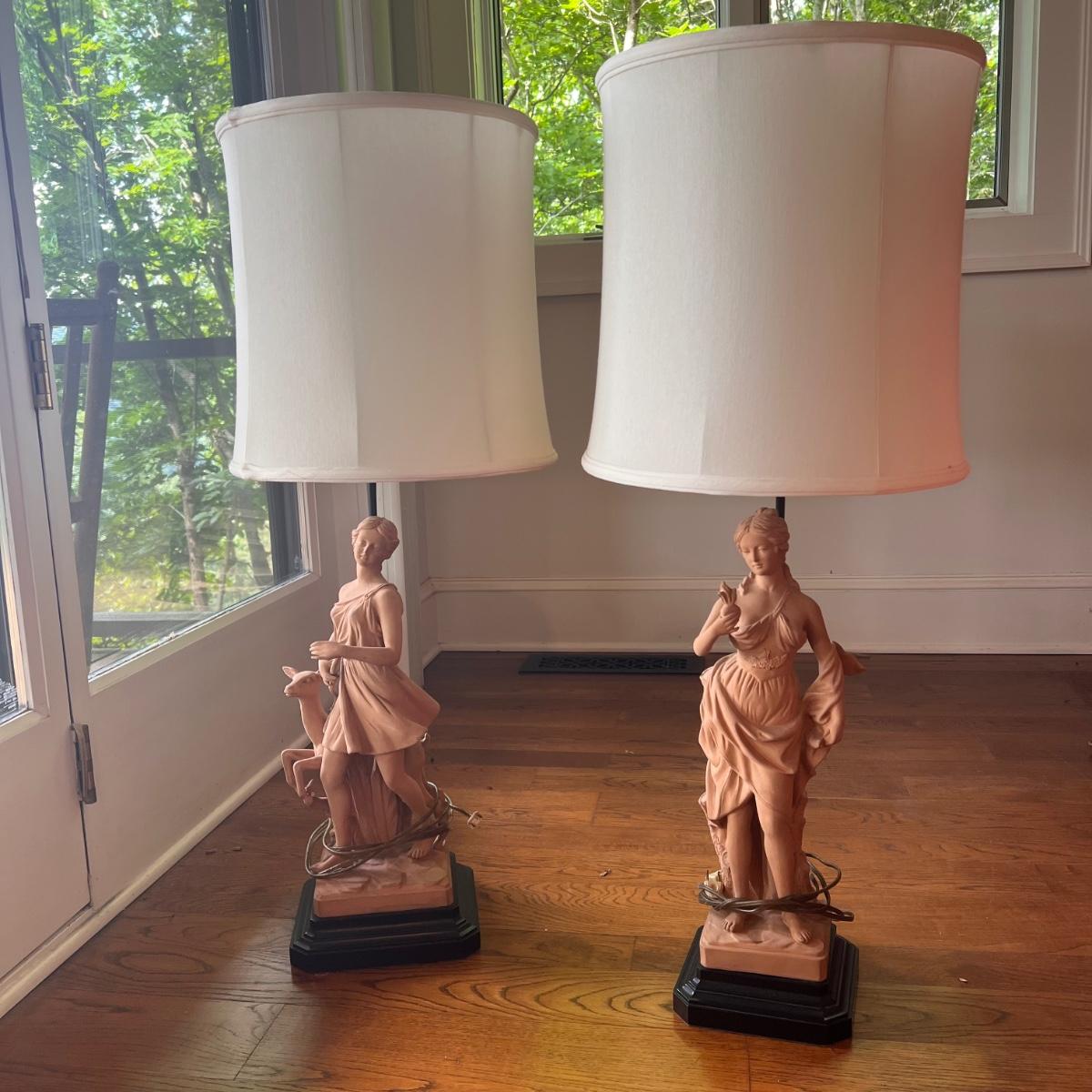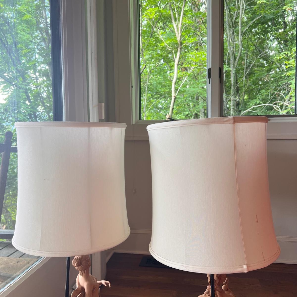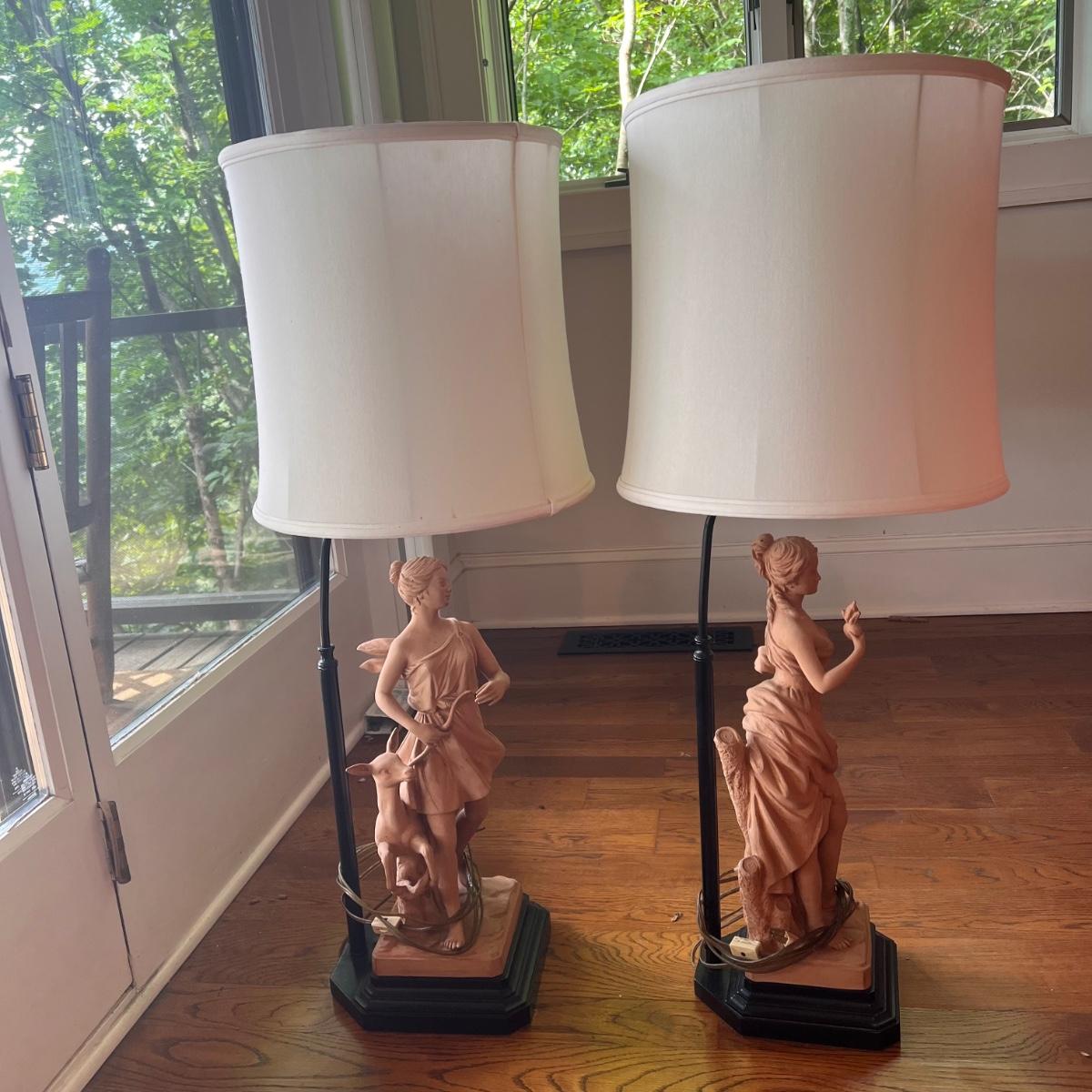 This lot included two terra cotta figural lamps with two white shades. The shades show some signs of wear - see pictures included. The lamps, with the shades included, measure 14”D x 36”H. Both lamps powered on when plugged in. They power on by the switch on the cord, instead of the switch by the bulb.. Shipping available. Shipping may be costly. Please contact our shipping provider, Postage Express for a quote prior to bidding at 828-255-9250 or shipping@postageexpressnc.com.