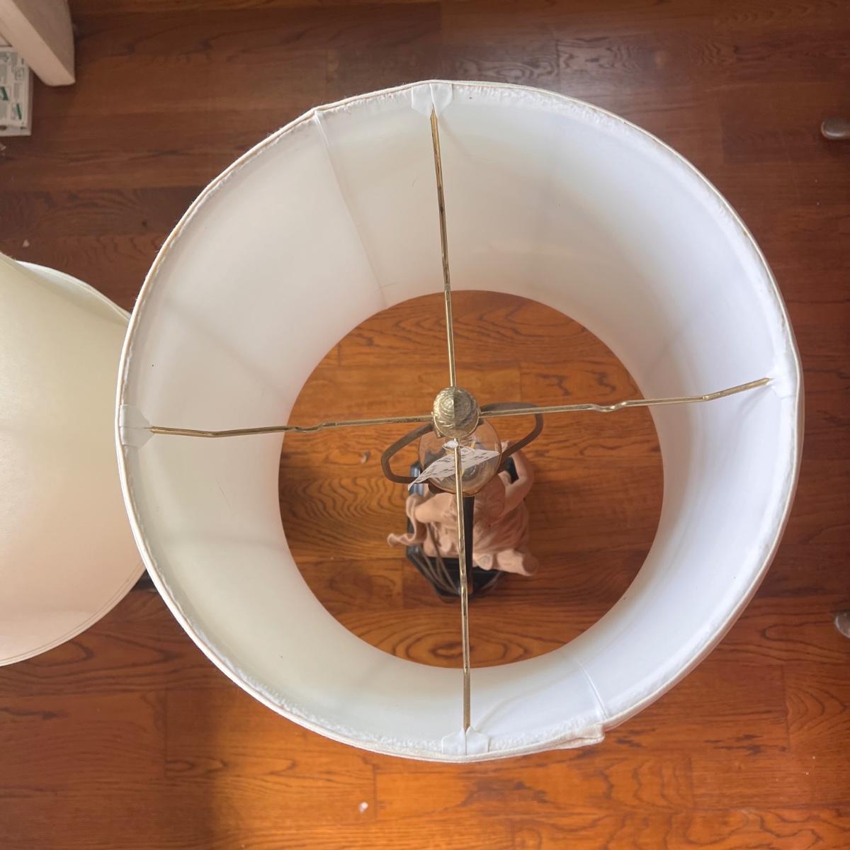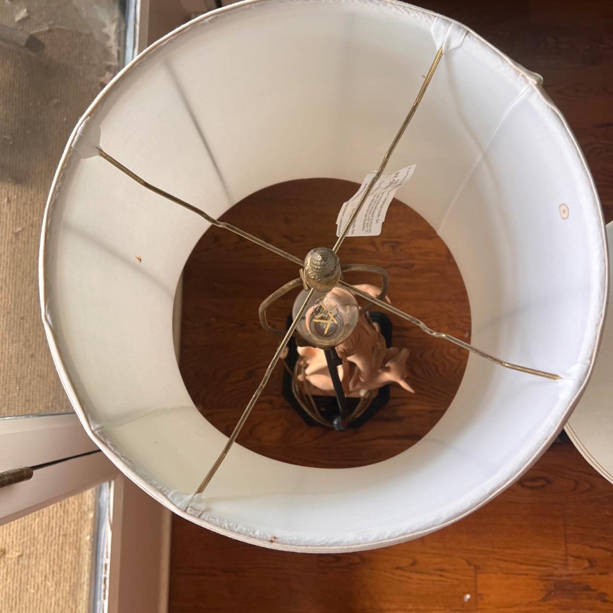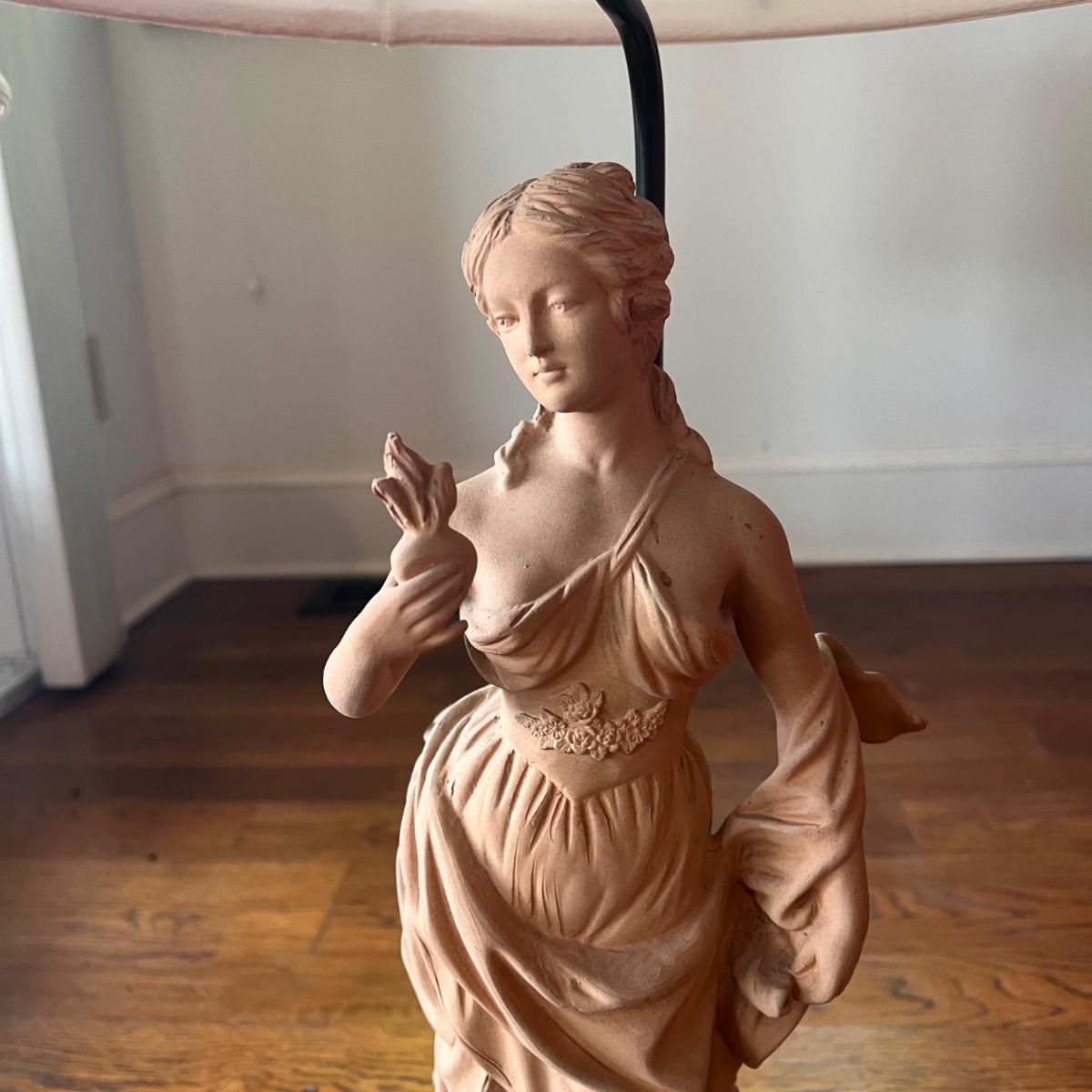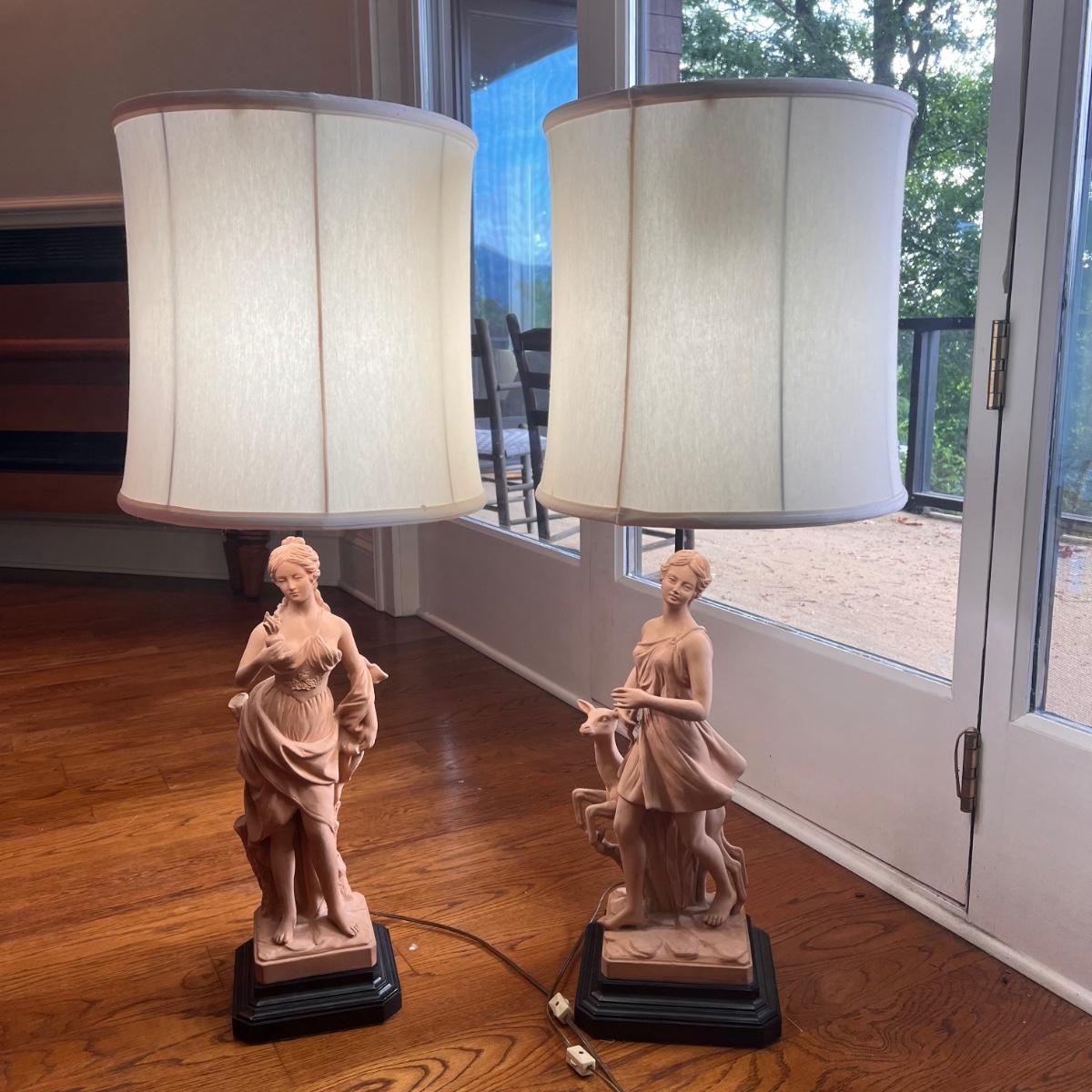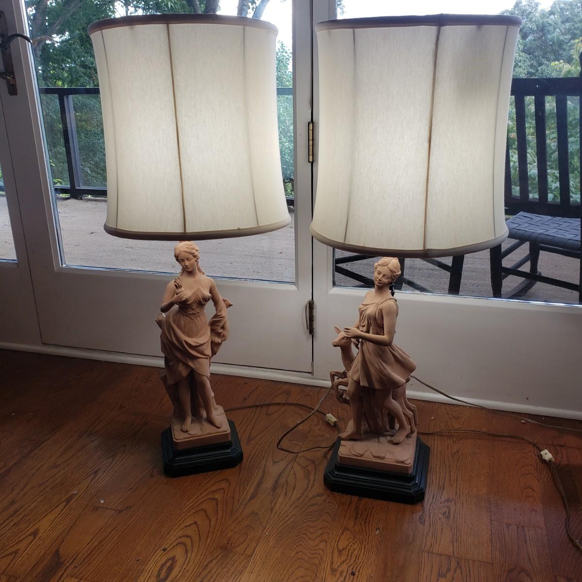 This lot included two terra cotta figural lamps with two white shades. The shades show some signs of wear - see pictures included. The lamps, with the shades included, measure 14”D x 36”H. Both lamps powered on when plugged in. They power on by the switch on the cord, instead of the switch by the bulb.. Shipping available. Shipping may be costly. Please contact our shipping provider, Postage Express for a quote prior to bidding at 828-255-9250 or shipping@postageexpressnc.com.