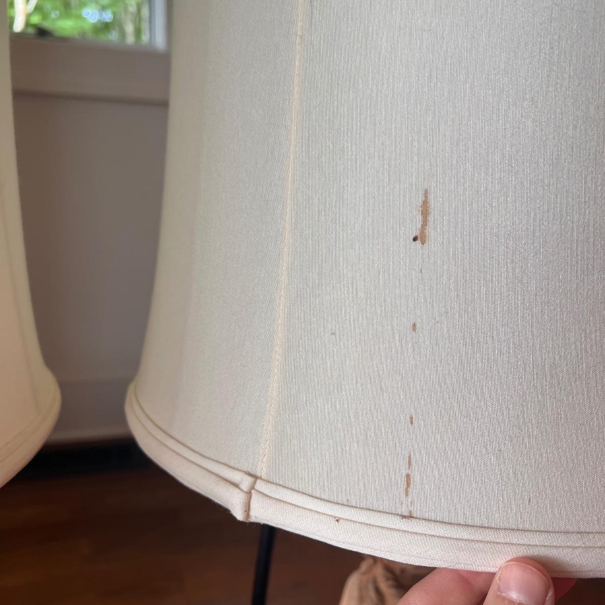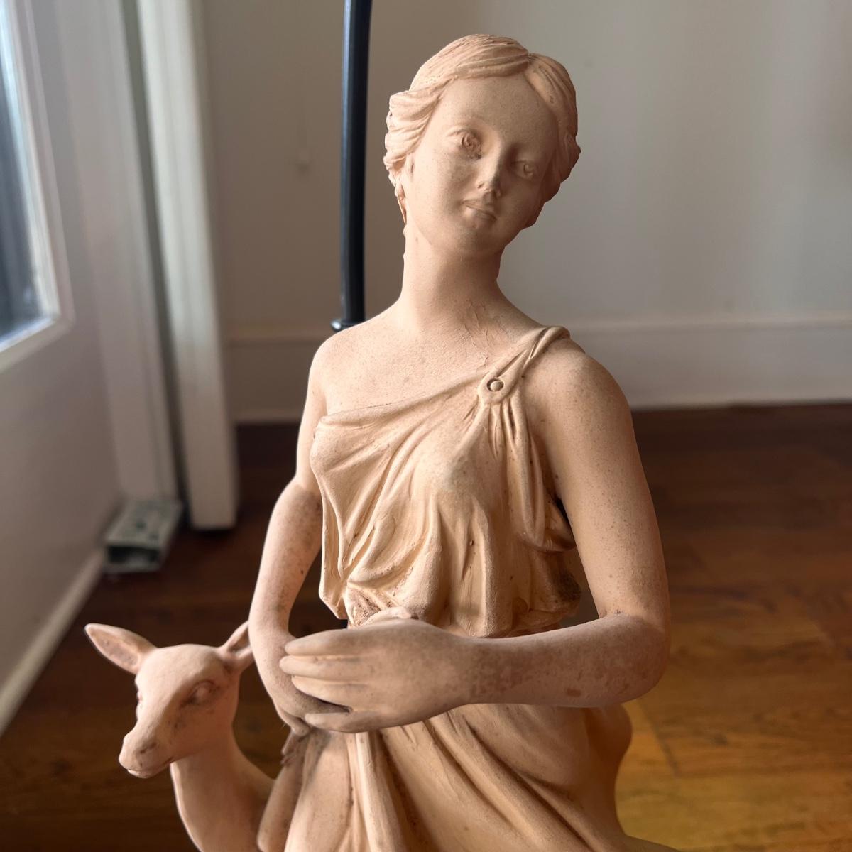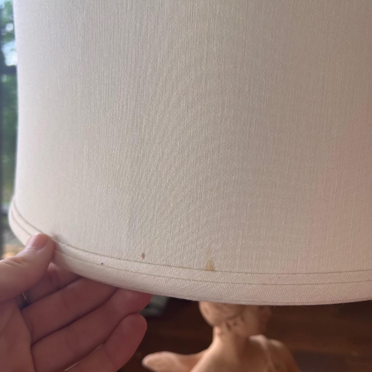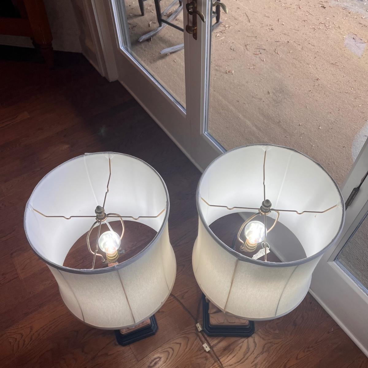 This lot included two terra cotta figural lamps with two white shades. The shades show some signs of wear - see pictures included. The lamps, with the shades included, measure 14”D x 36”H. Both lamps powered on when plugged in. They power on by the switch on the cord, instead of the switch by the bulb.. Shipping available. Shipping may be costly. Please contact our shipping provider, Postage Express for a quote prior to bidding at 828-255-9250 or shipping@postageexpressnc.com.