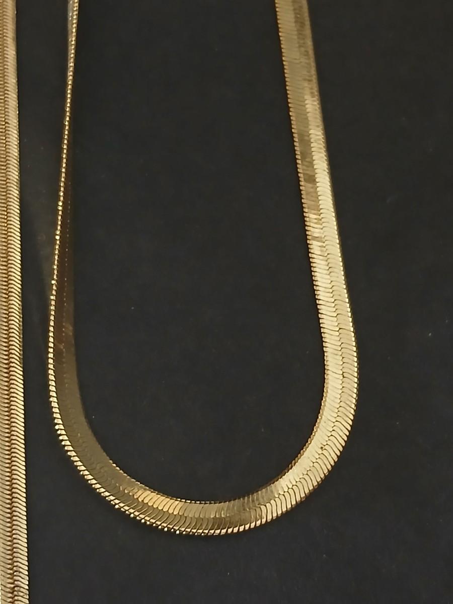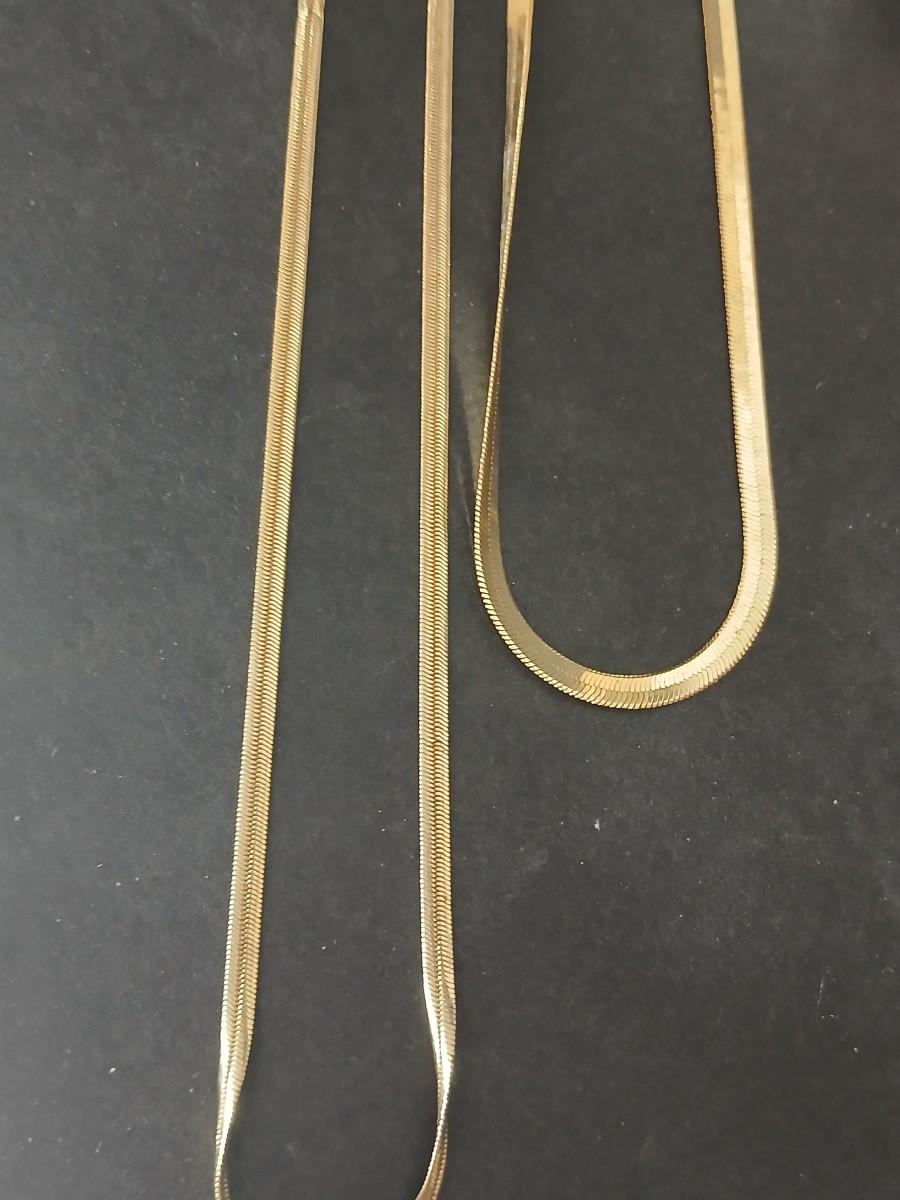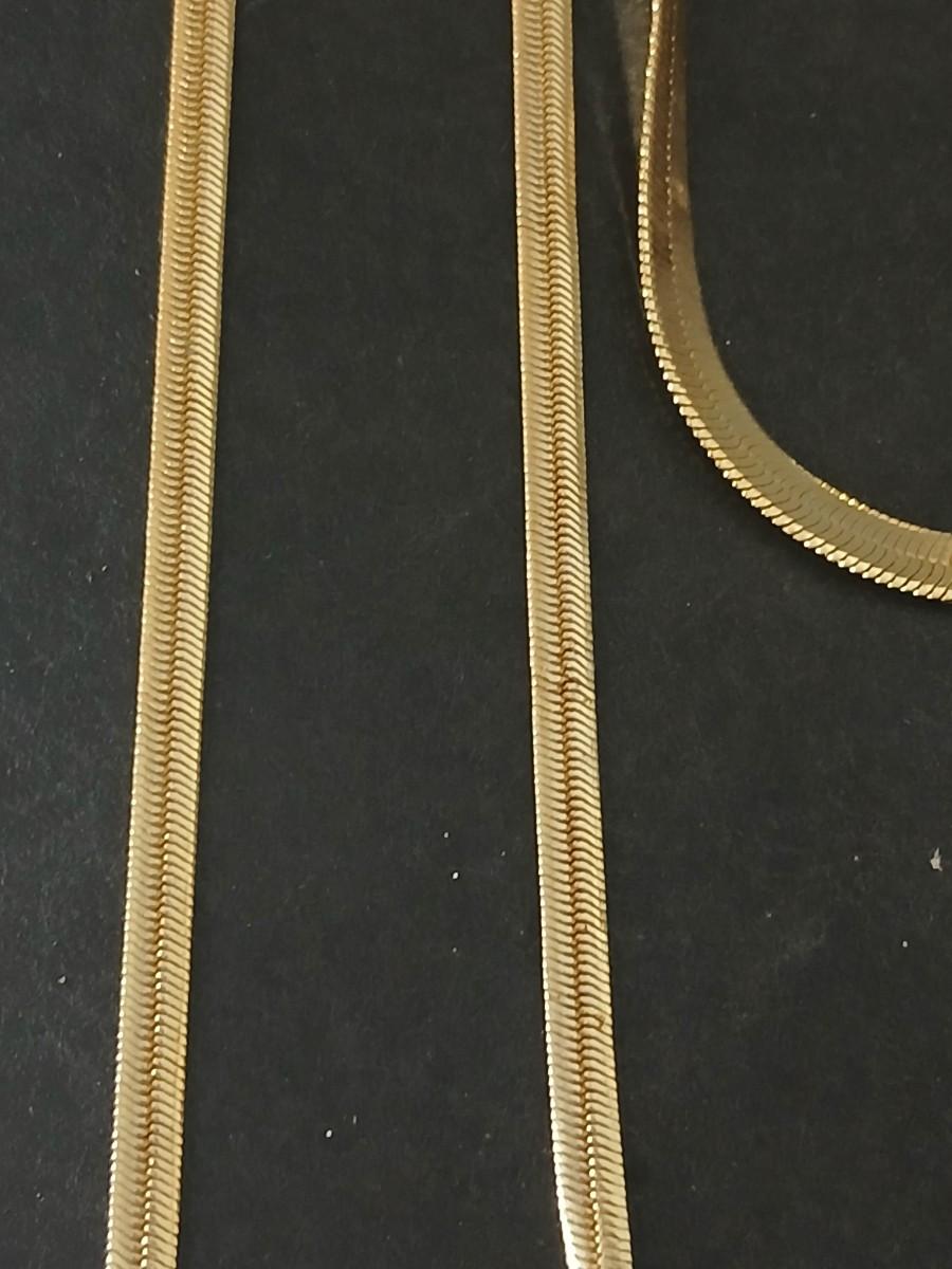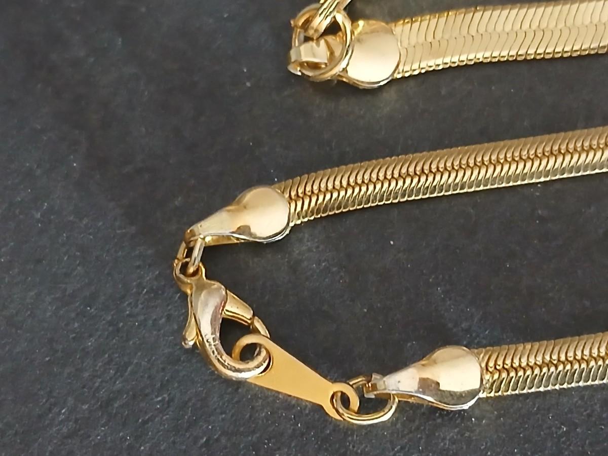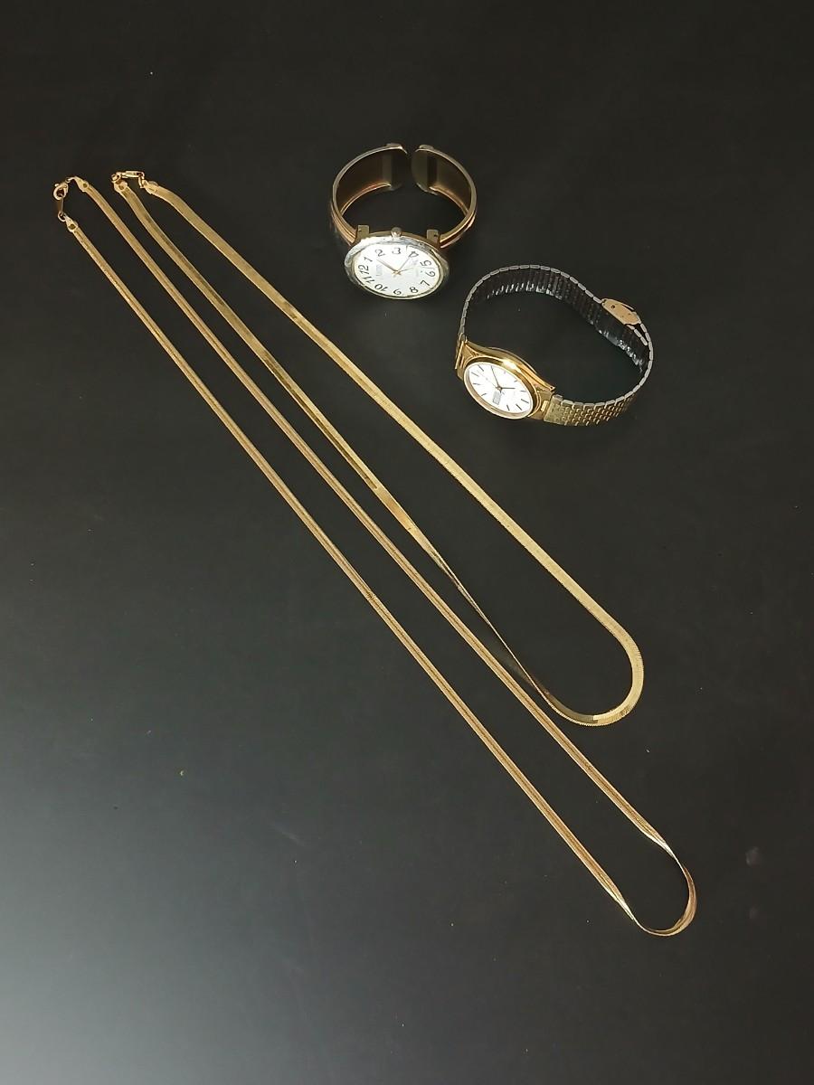 Two thick herringbone gold toned necklaces with two vintage watches one with gold electroplate Bulova band
