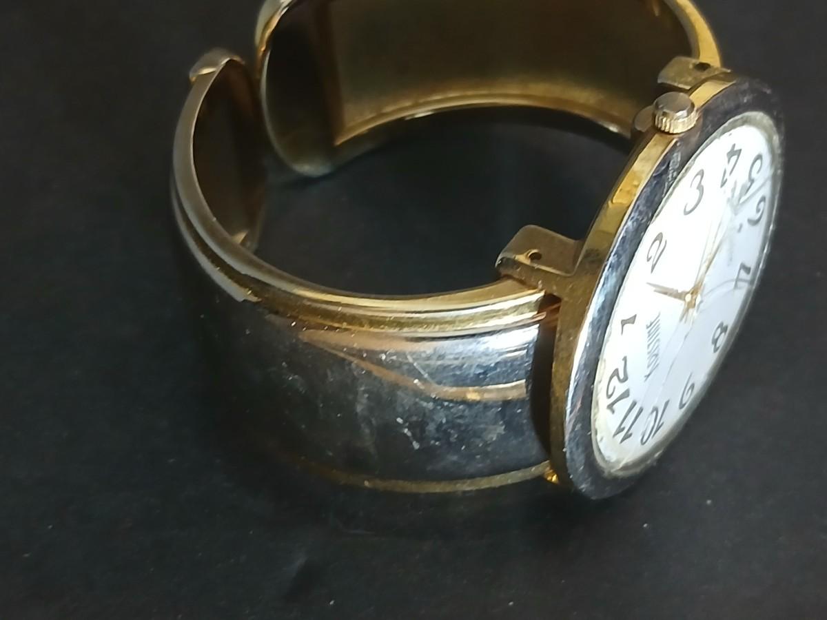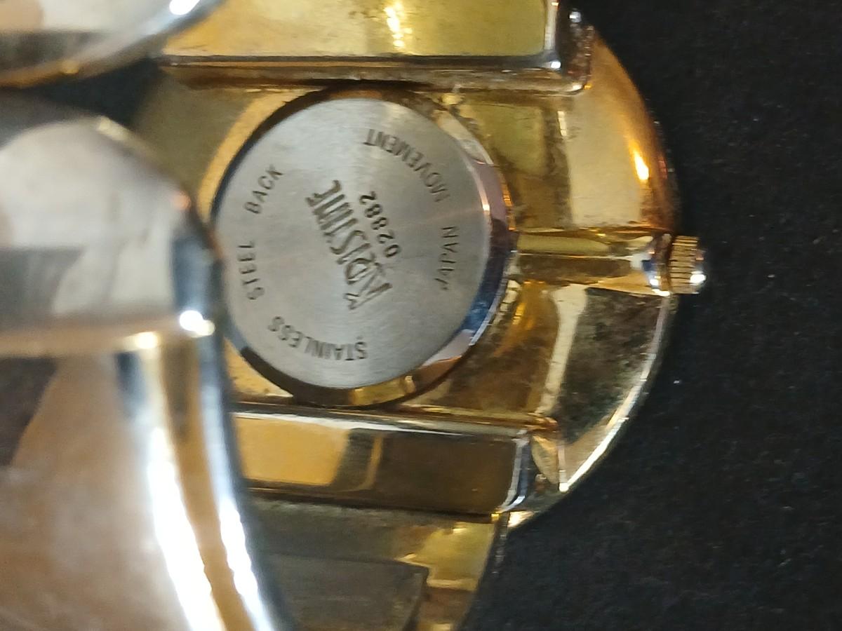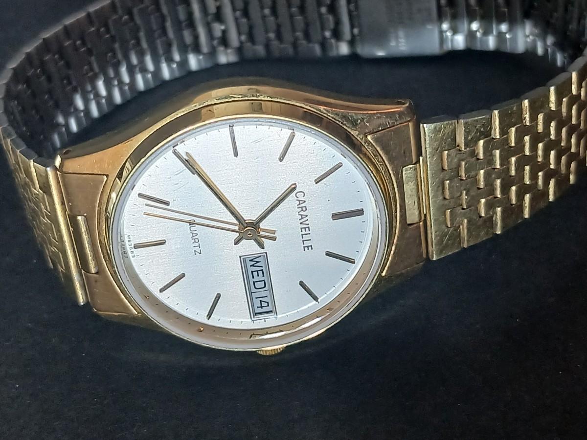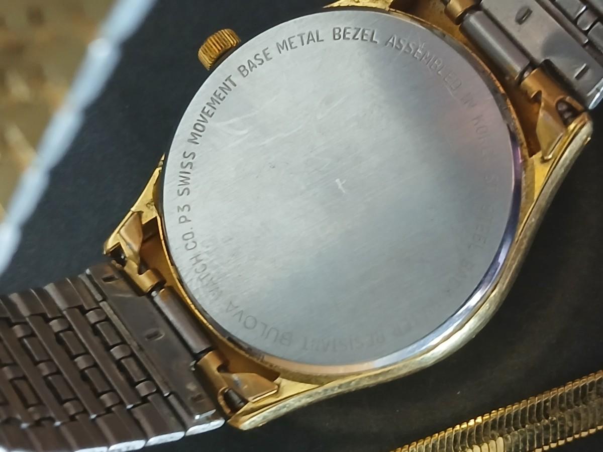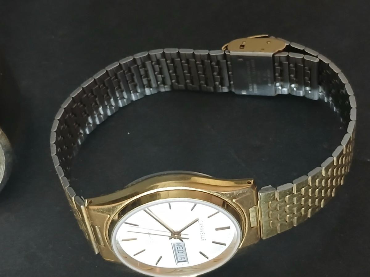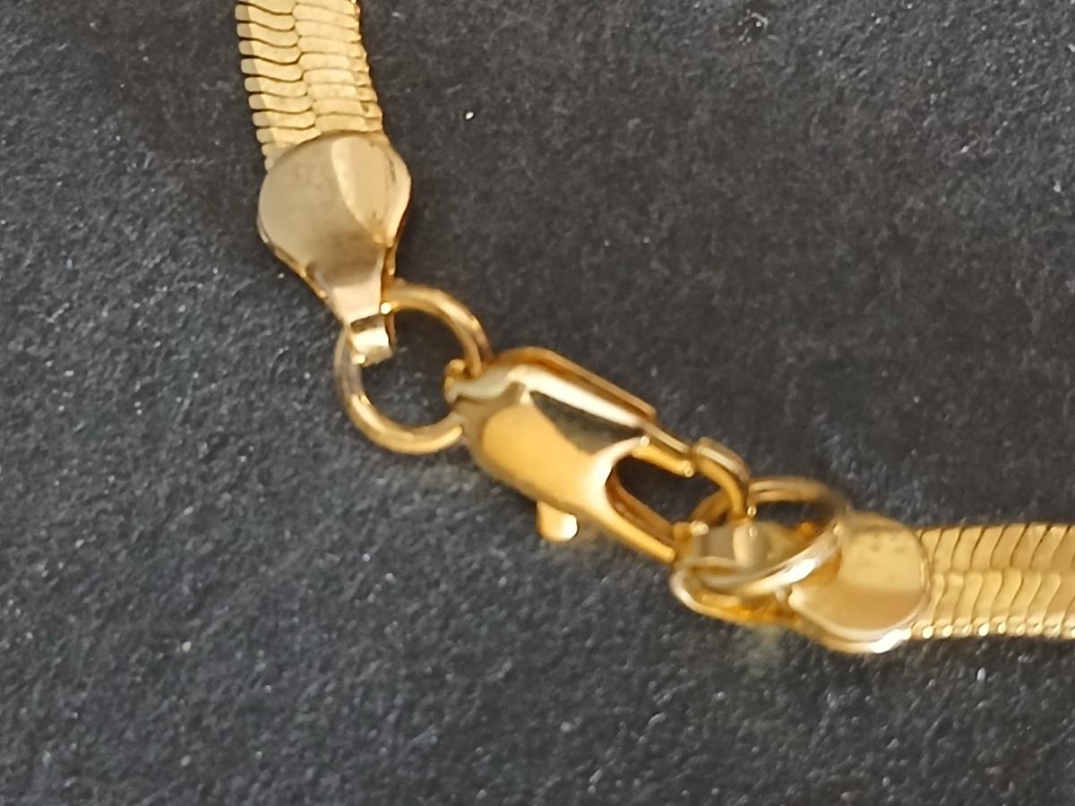 Two thick herringbone gold toned necklaces with two vintage watches one with gold electroplate Bulova band