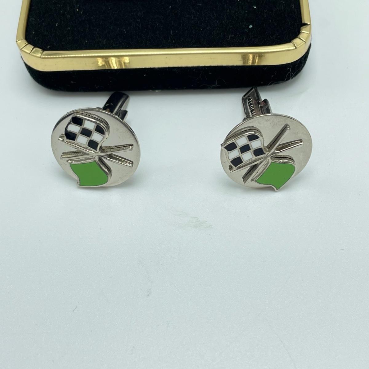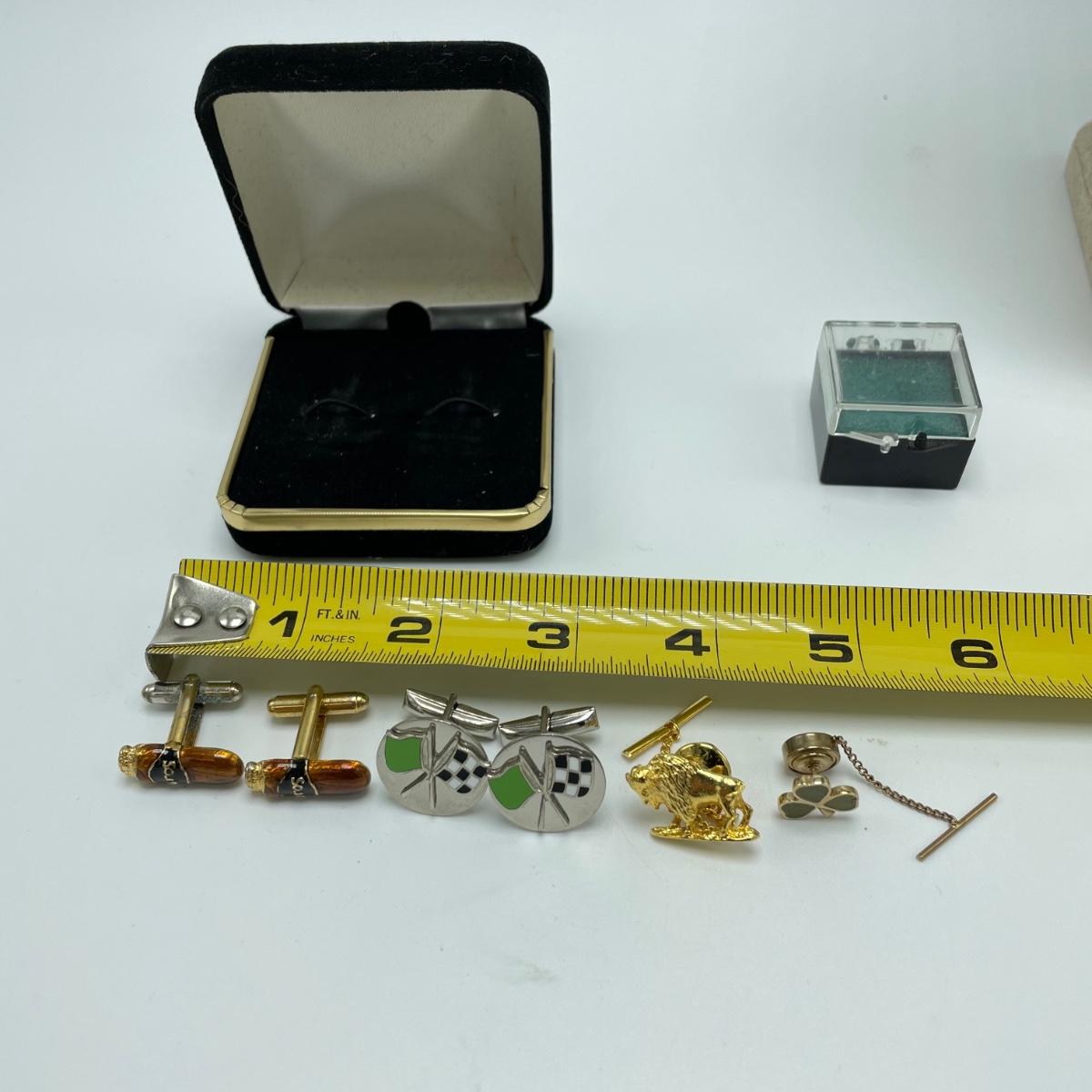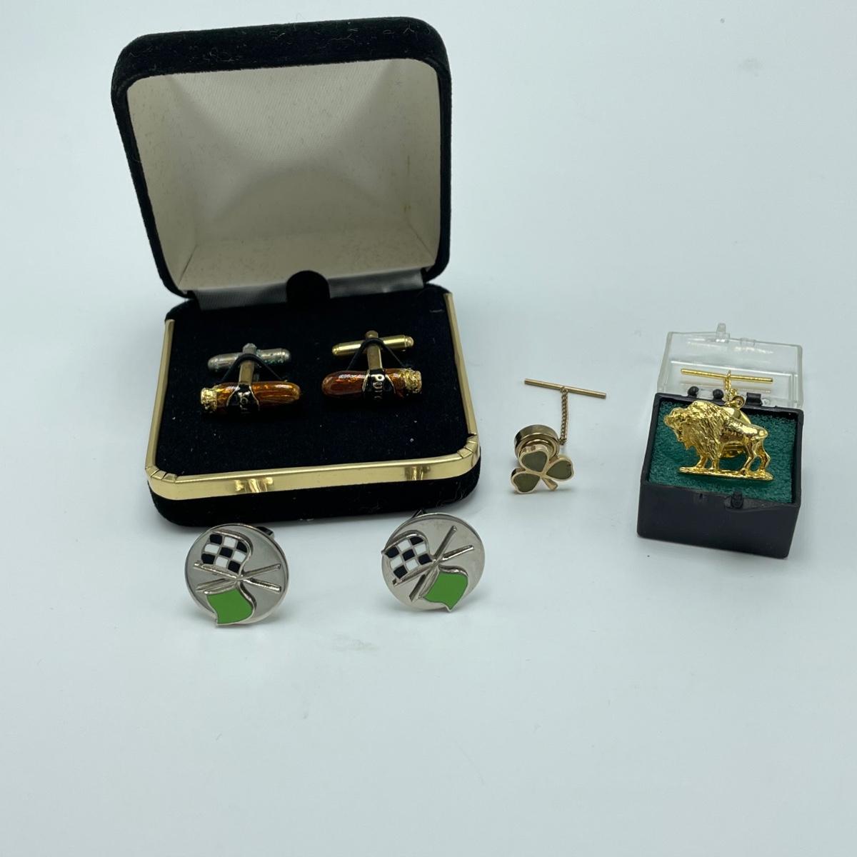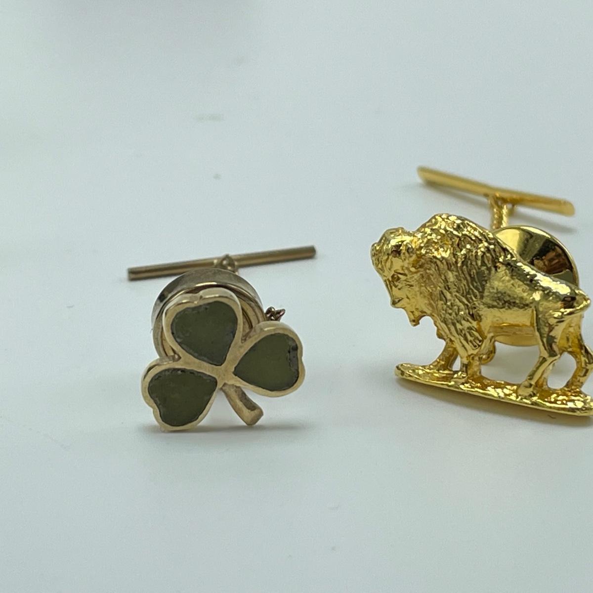 Here’s a lot of personality in a small package. Two tie tacks plus two sets of cufflinks. One bright gold colored buffalo and one shamrock with a 9 and 375 amongst its markings. Lot also contains a sterling Shadow Valley Car Club flag cufflink pair and a cigar cufflink pair. See images. Shipping available.