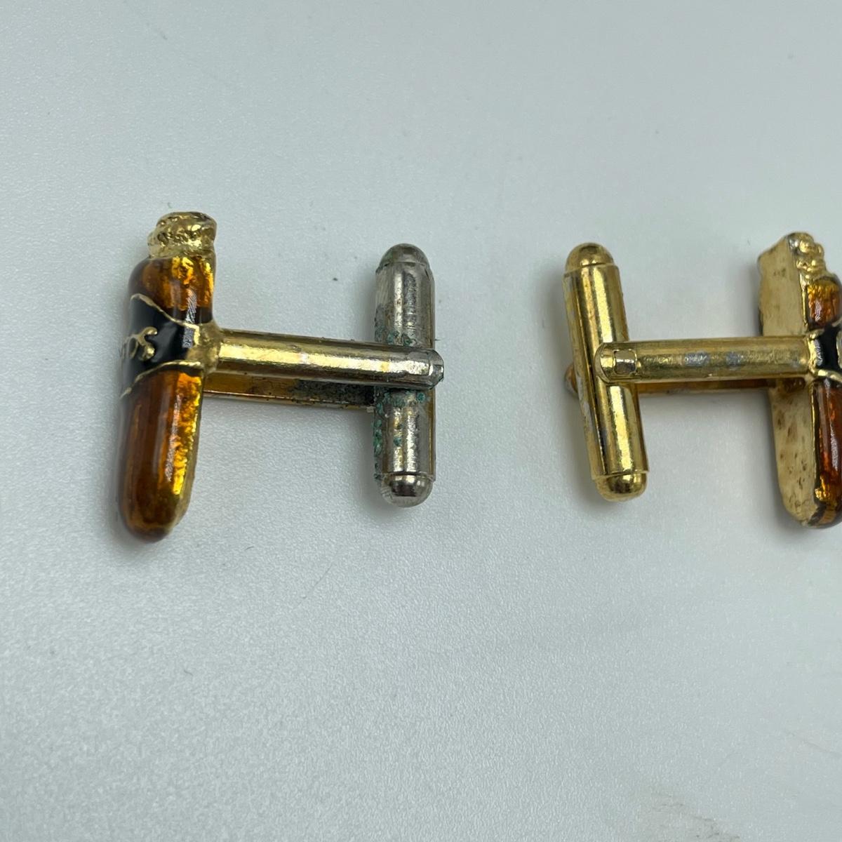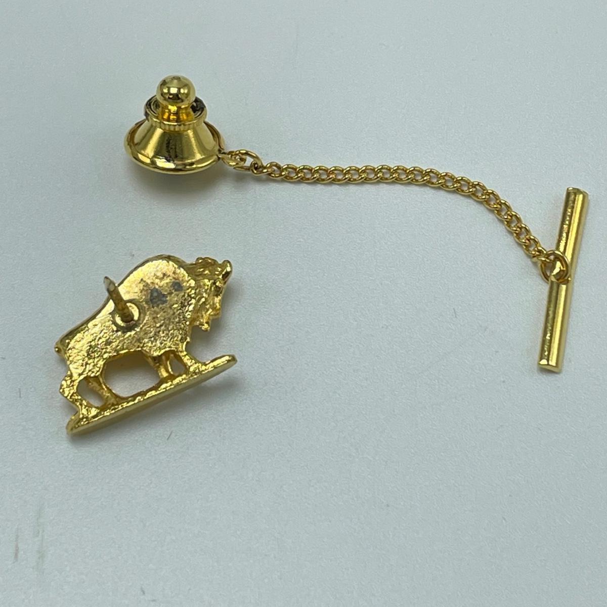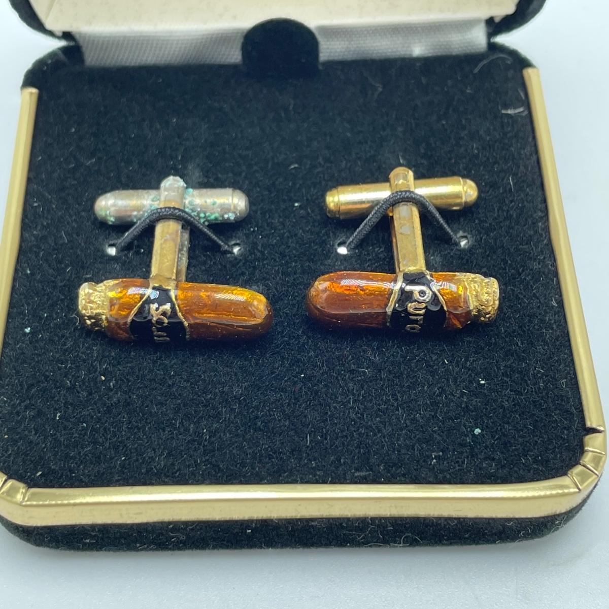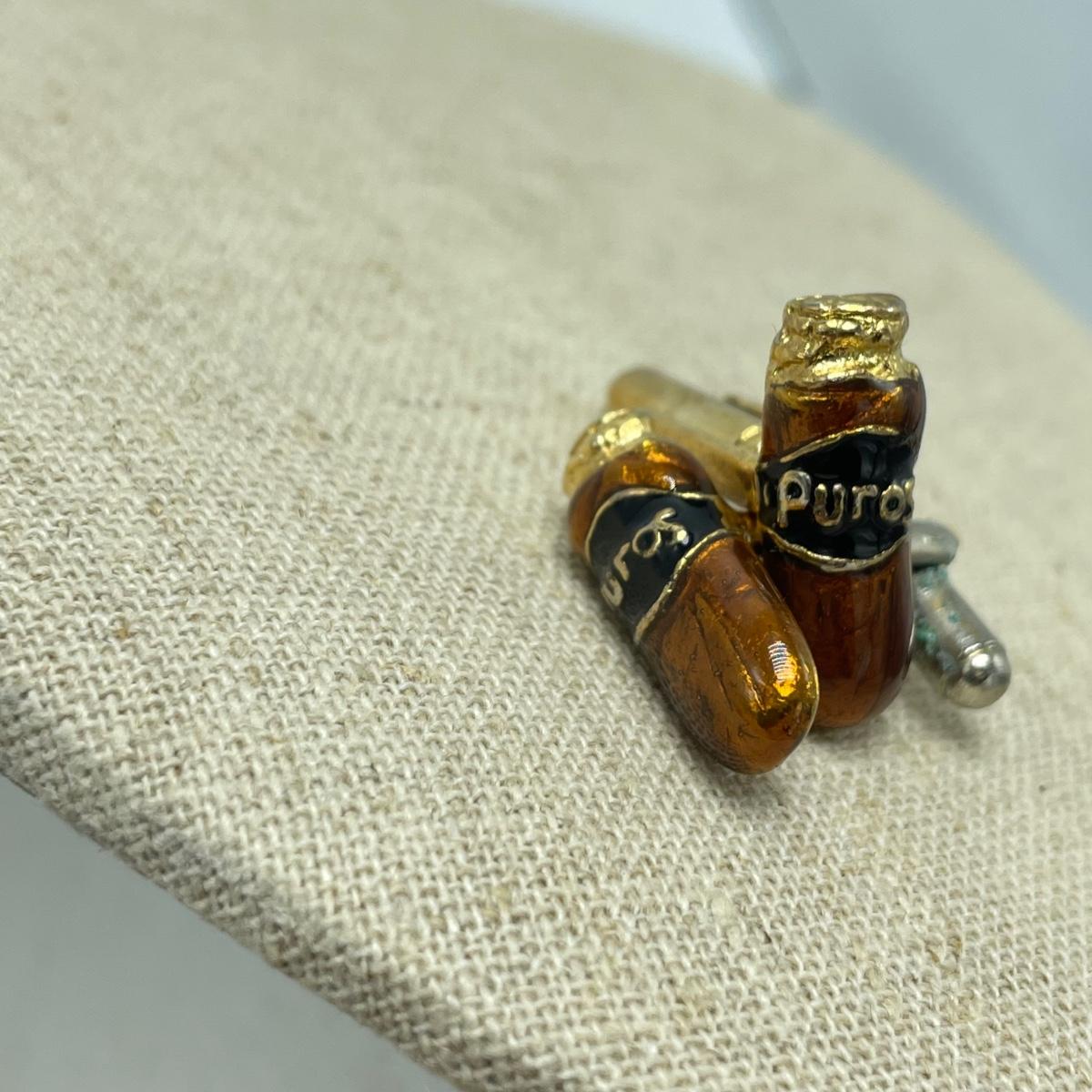 Here’s a lot of personality in a small package. Two tie tacks plus two sets of cufflinks. One bright gold colored buffalo and one shamrock with a 9 and 375 amongst its markings. Lot also contains a sterling Shadow Valley Car Club flag cufflink pair and a cigar cufflink pair. See images. Shipping available.