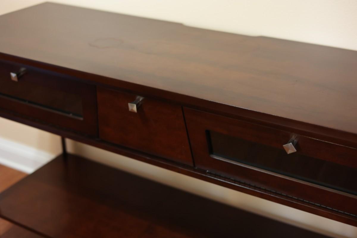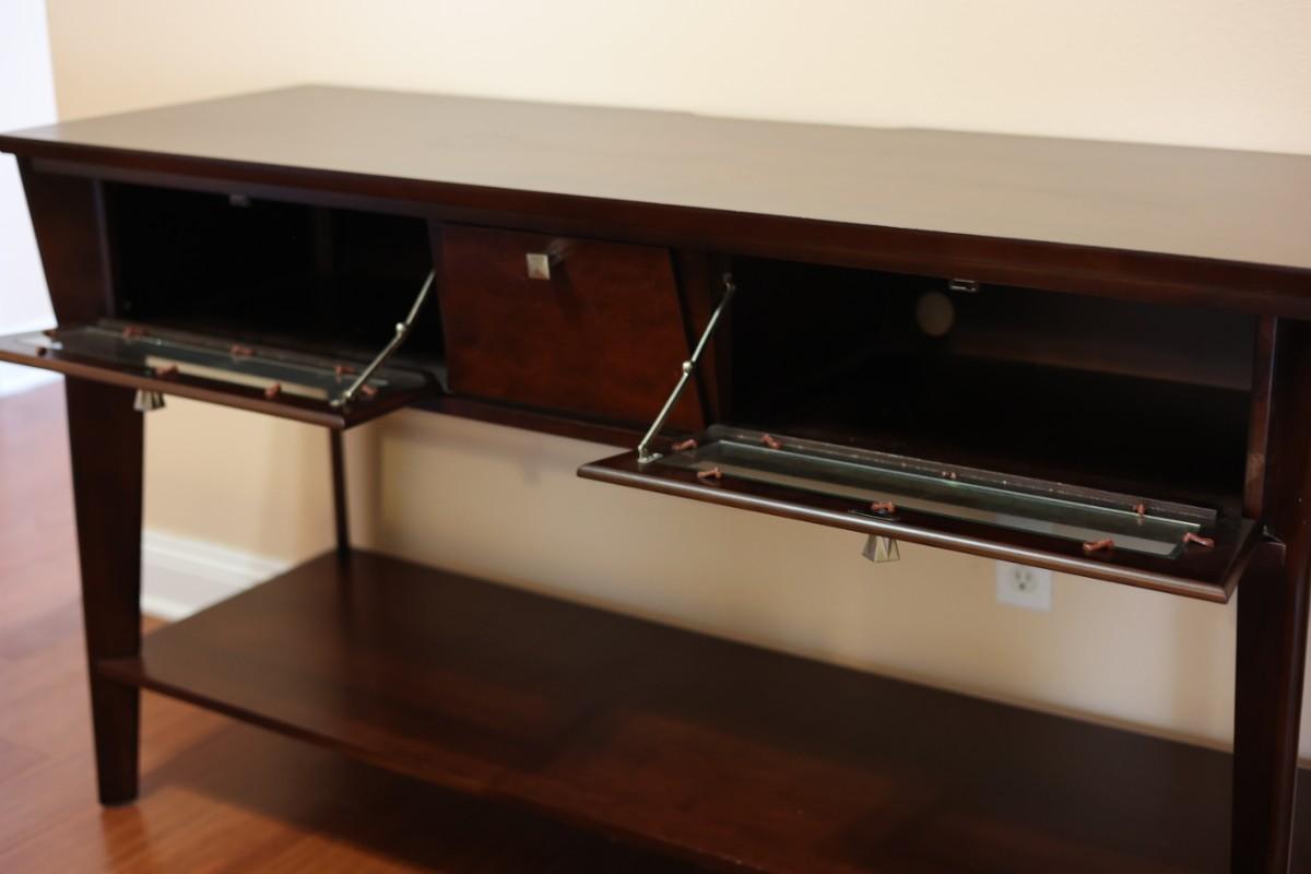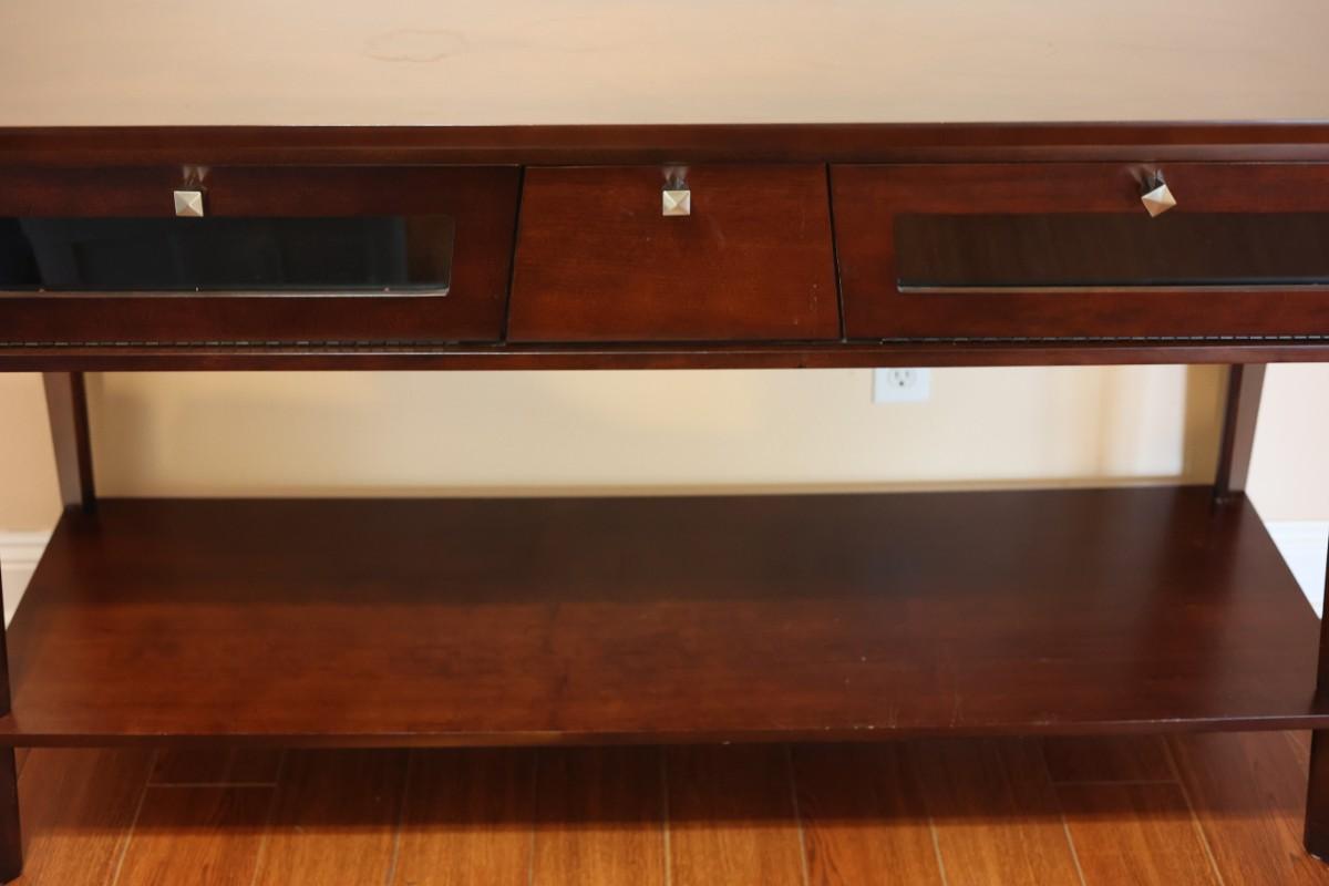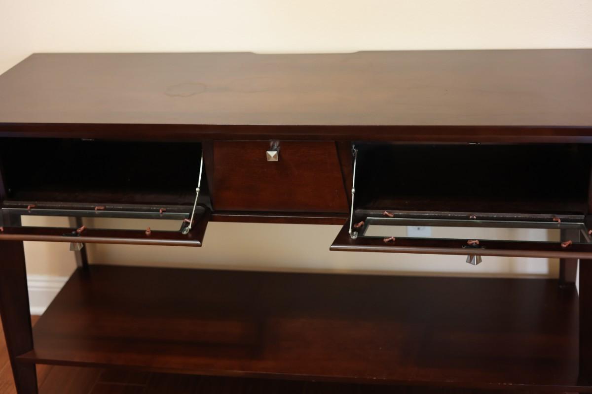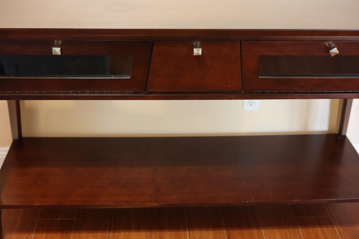 Minor scratches on the bottom shelf, see pictures. One middle drawer and two outer pull down cabinets.
