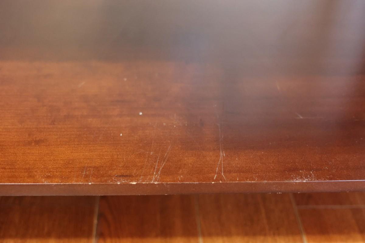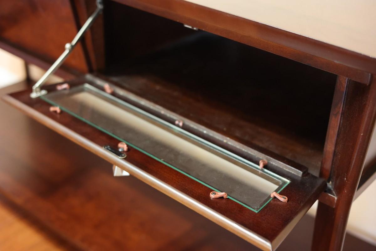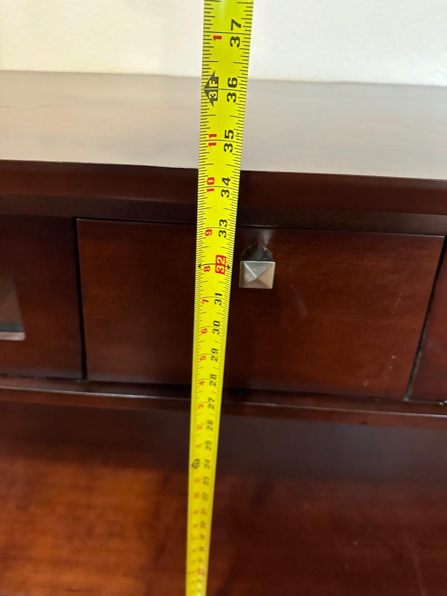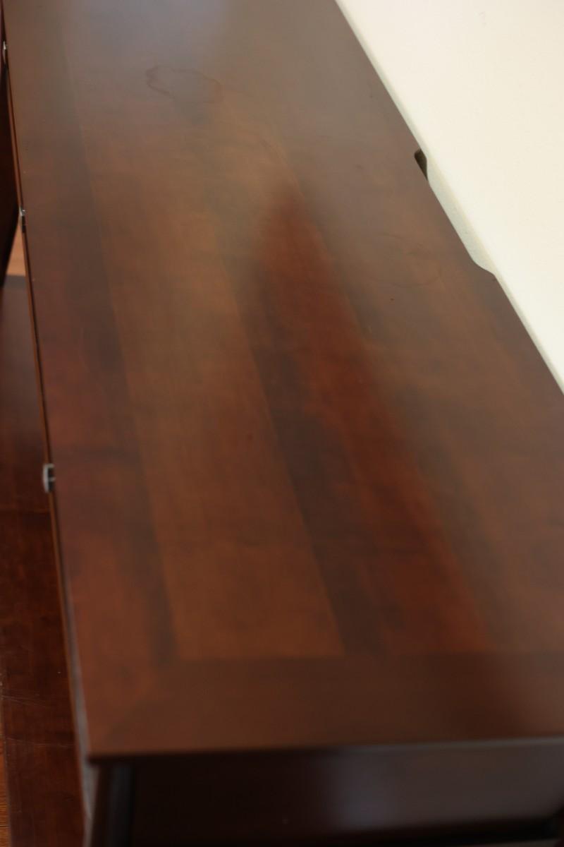Minor scratches on the bottom shelf, see pictures. One middle drawer and two outer pull down cabinets.