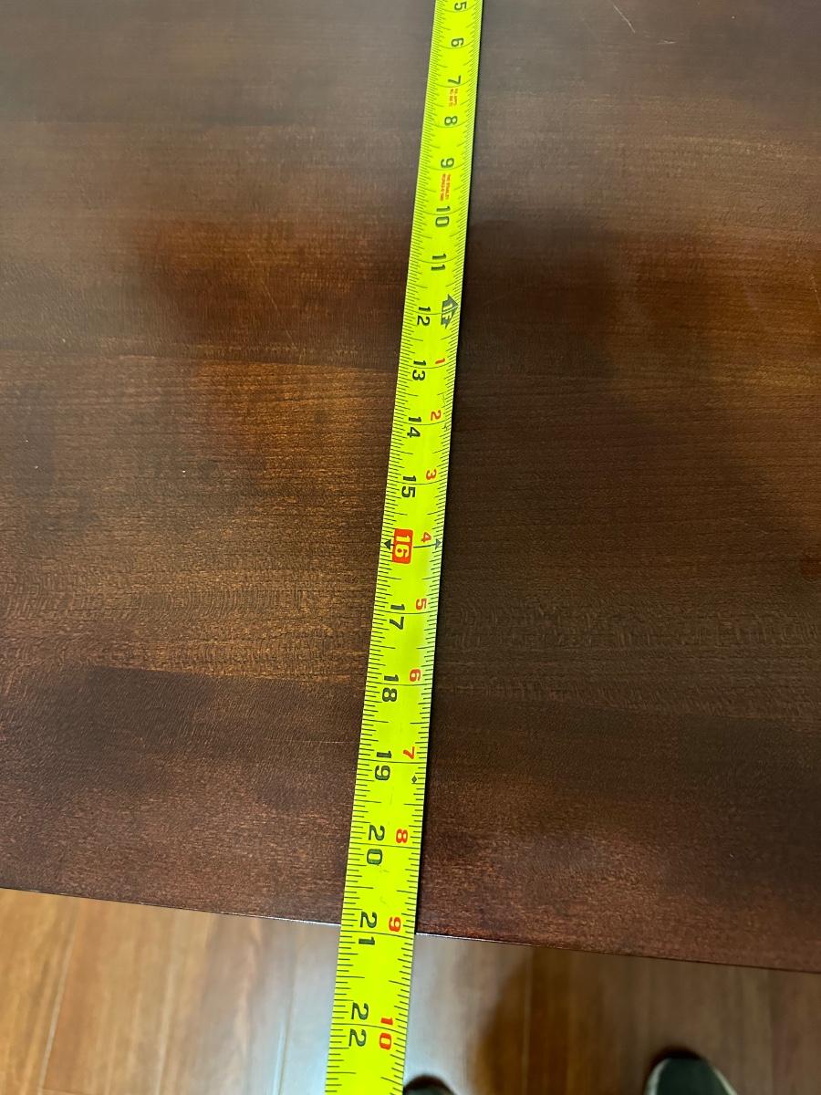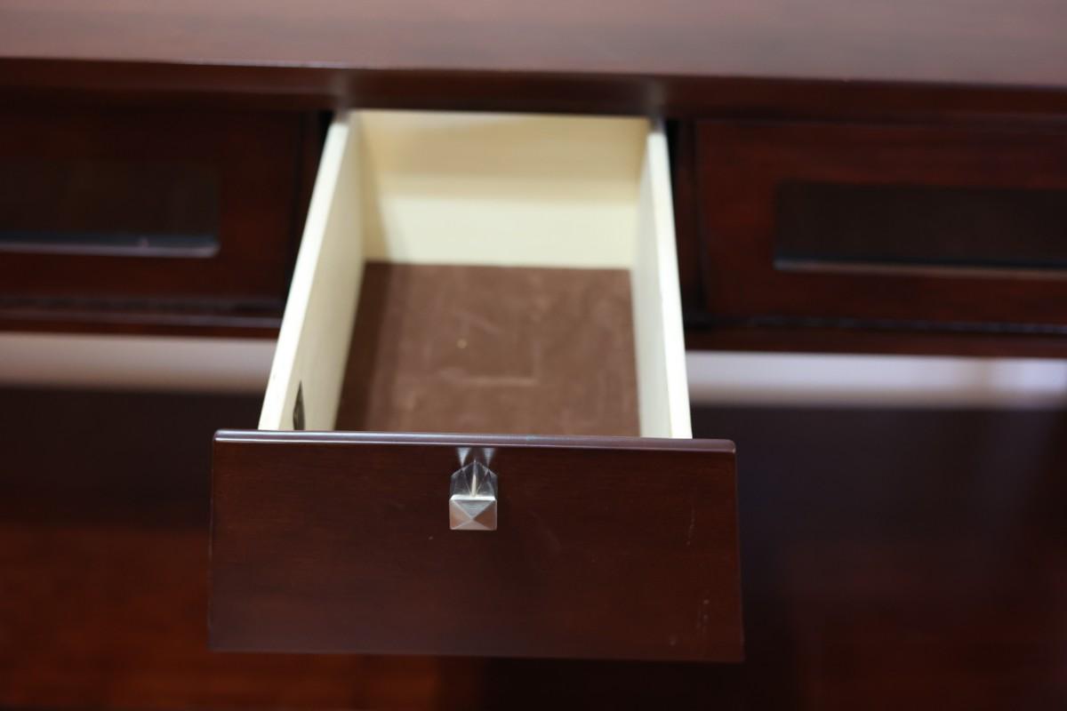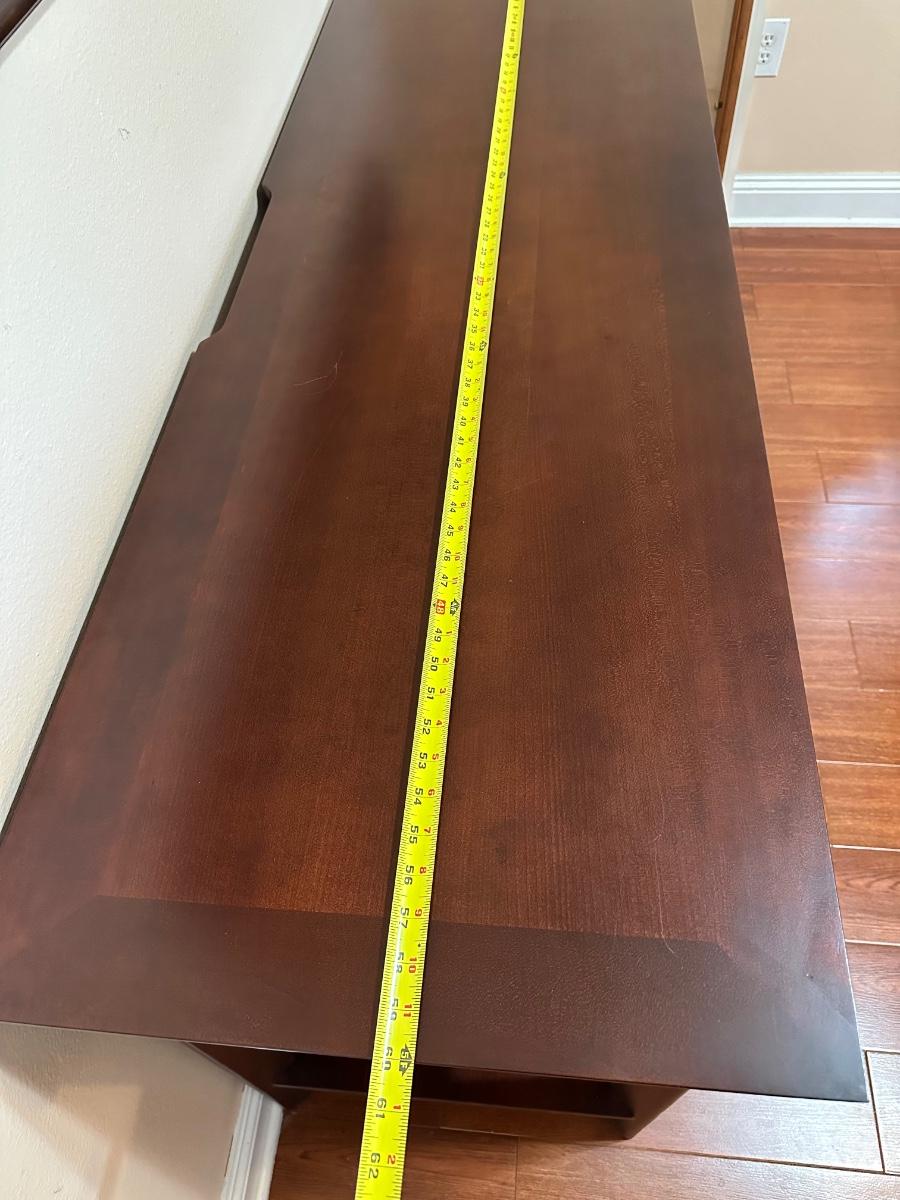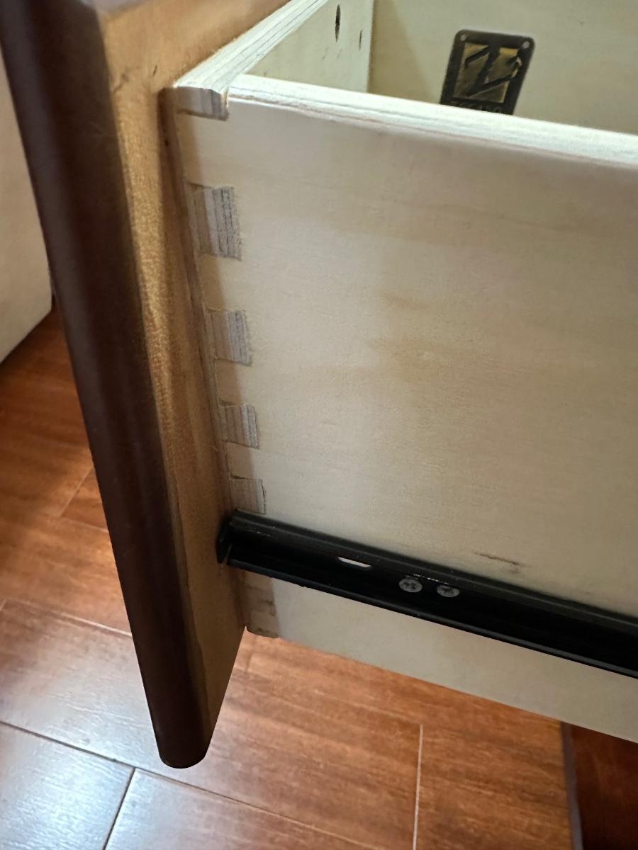 Minor scratches on the bottom shelf, see pictures. One middle drawer and two outer pull down cabinets.