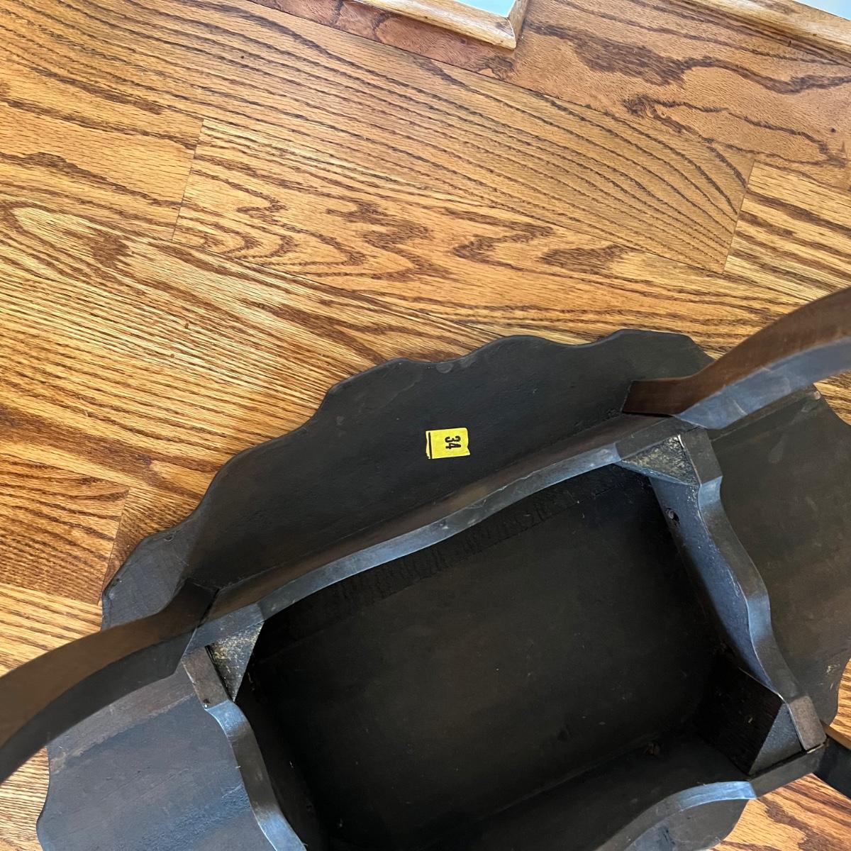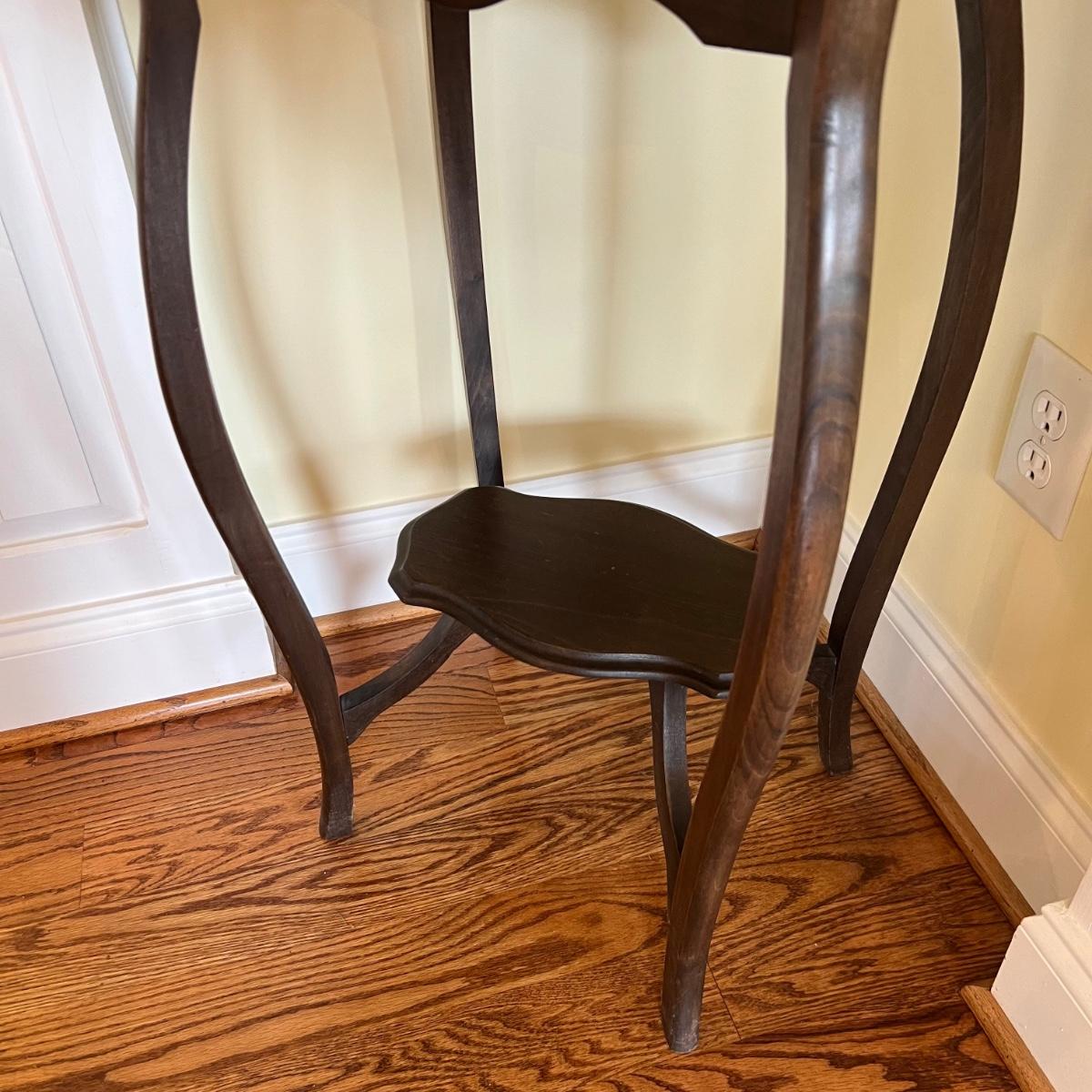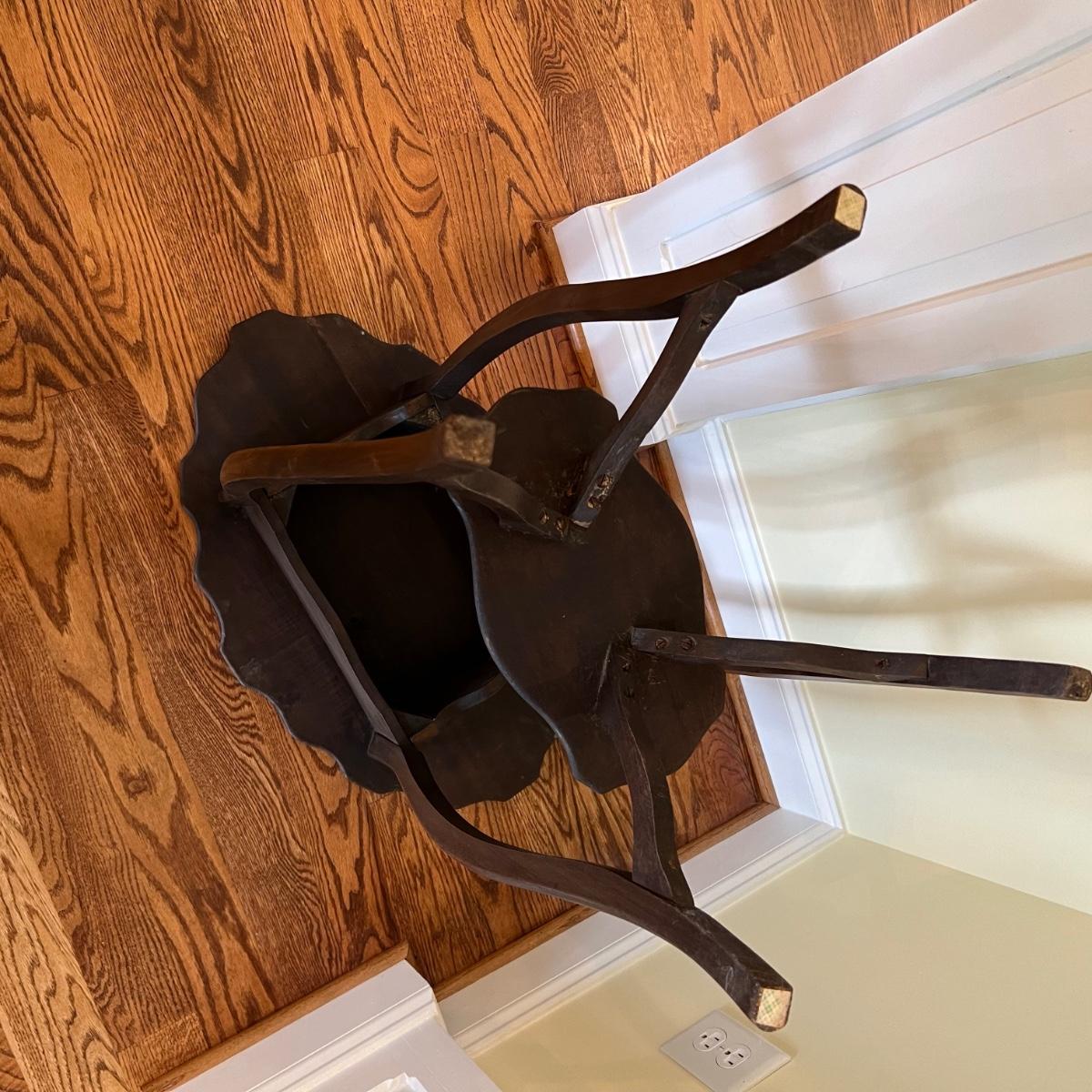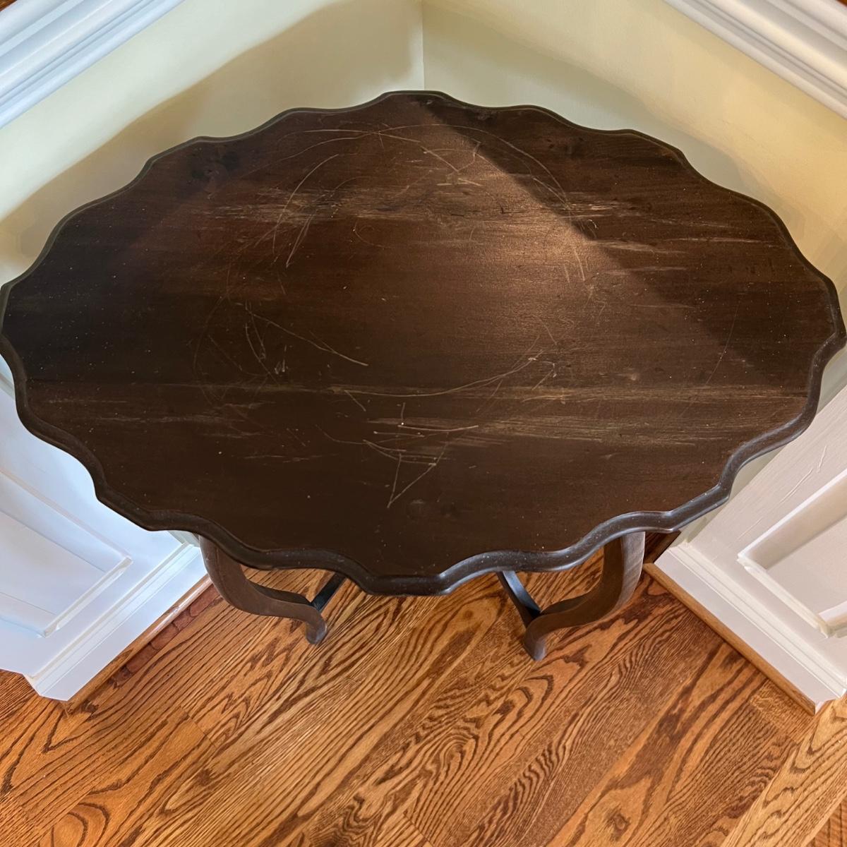 This elegant table has a scalloped edge design and is solid dark stained wood. Top surface to table has some scuff marks, see image.