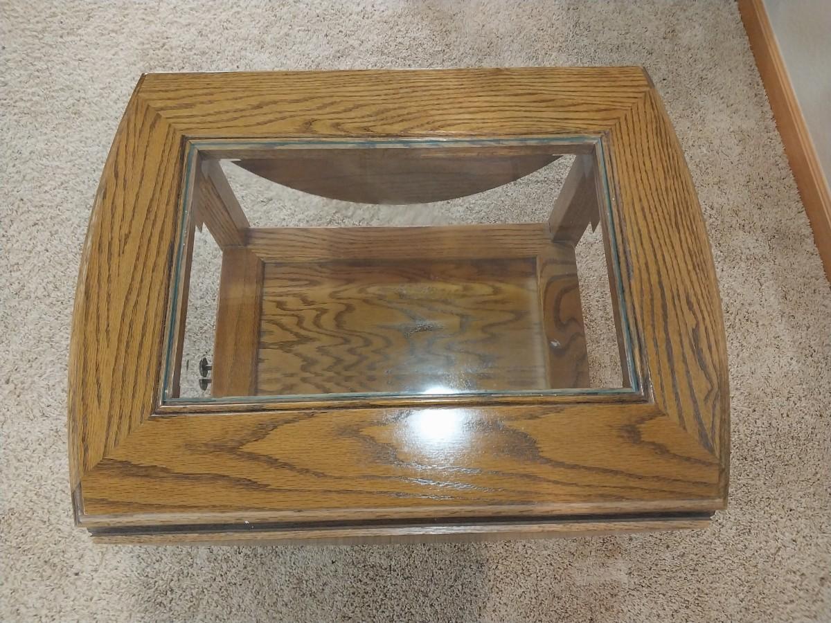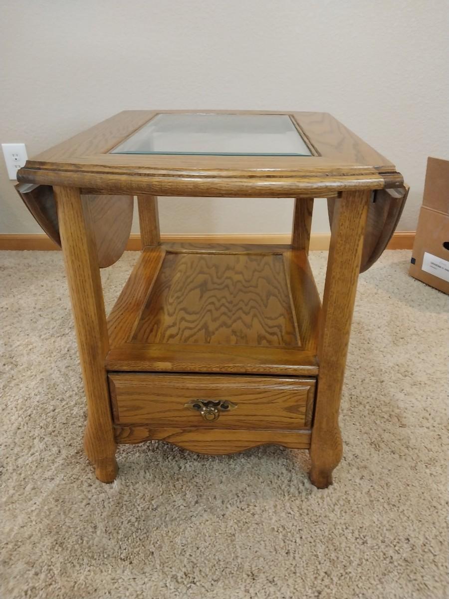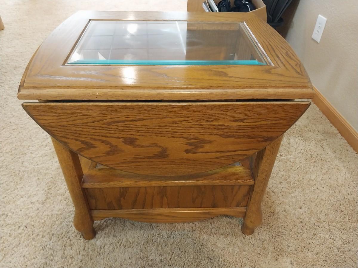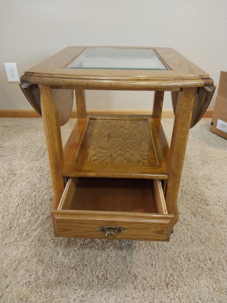 TWO TIER GLASS TOP WOODEN DROPLEAF TABLE WITH DRAWER