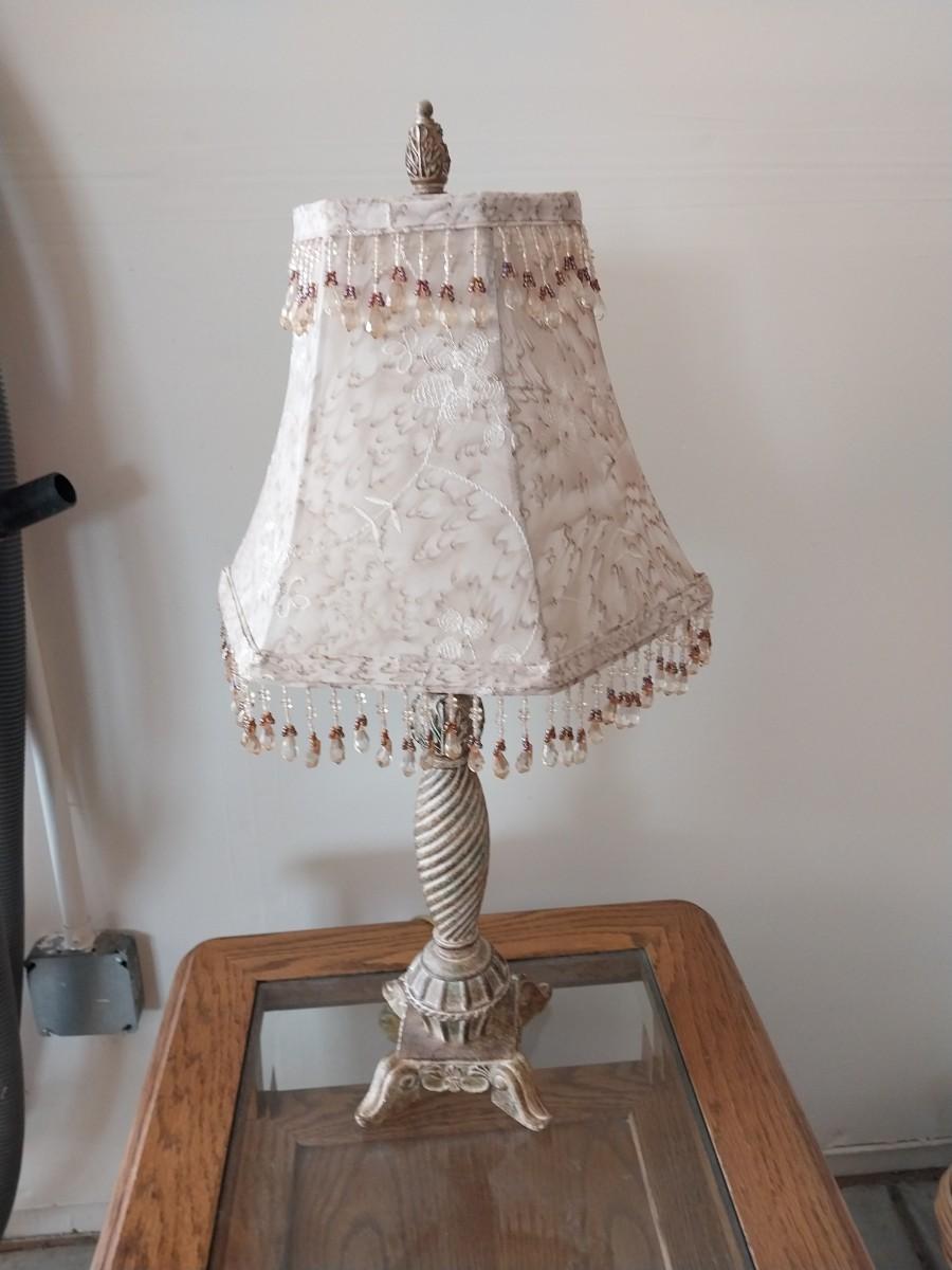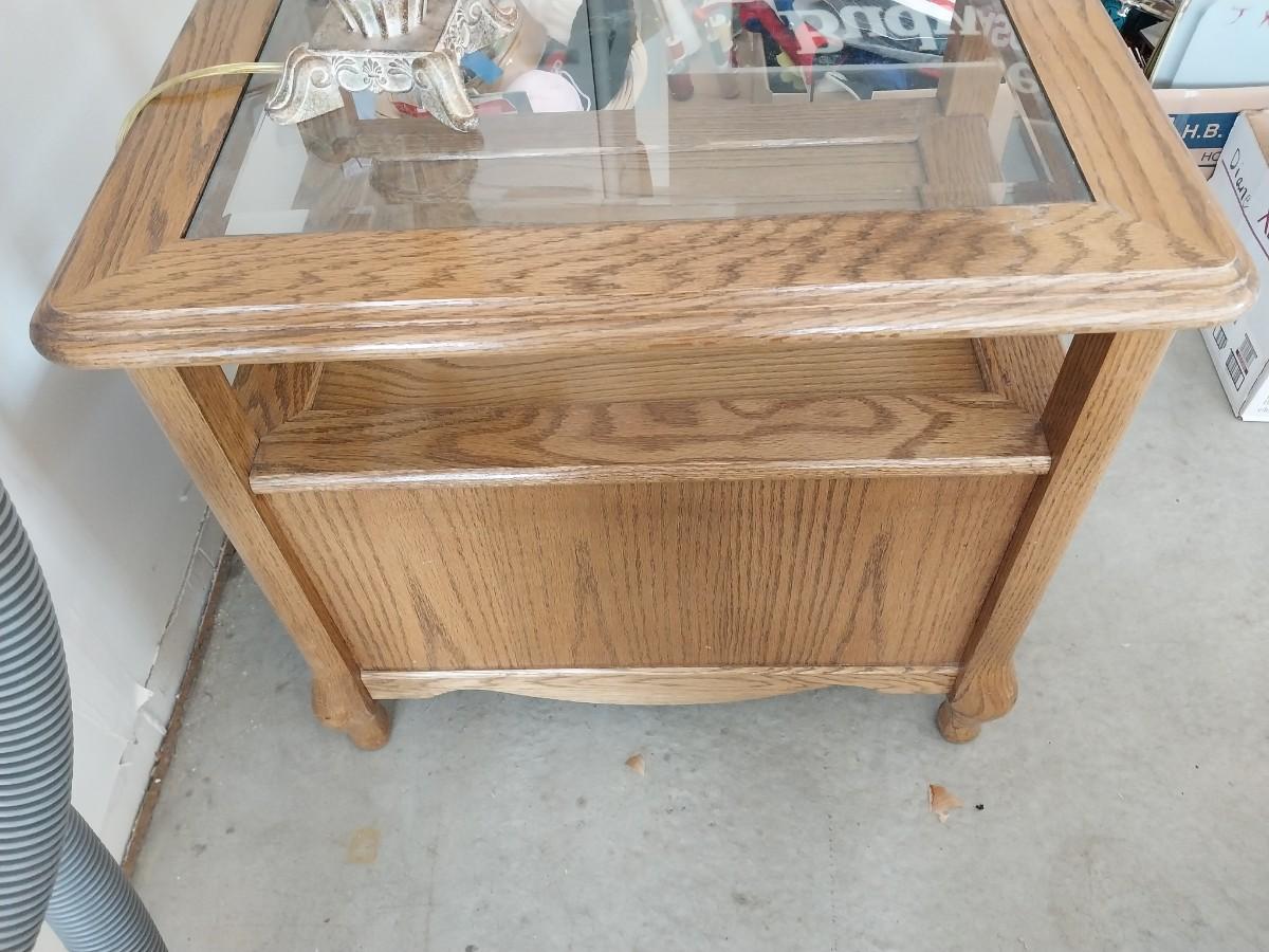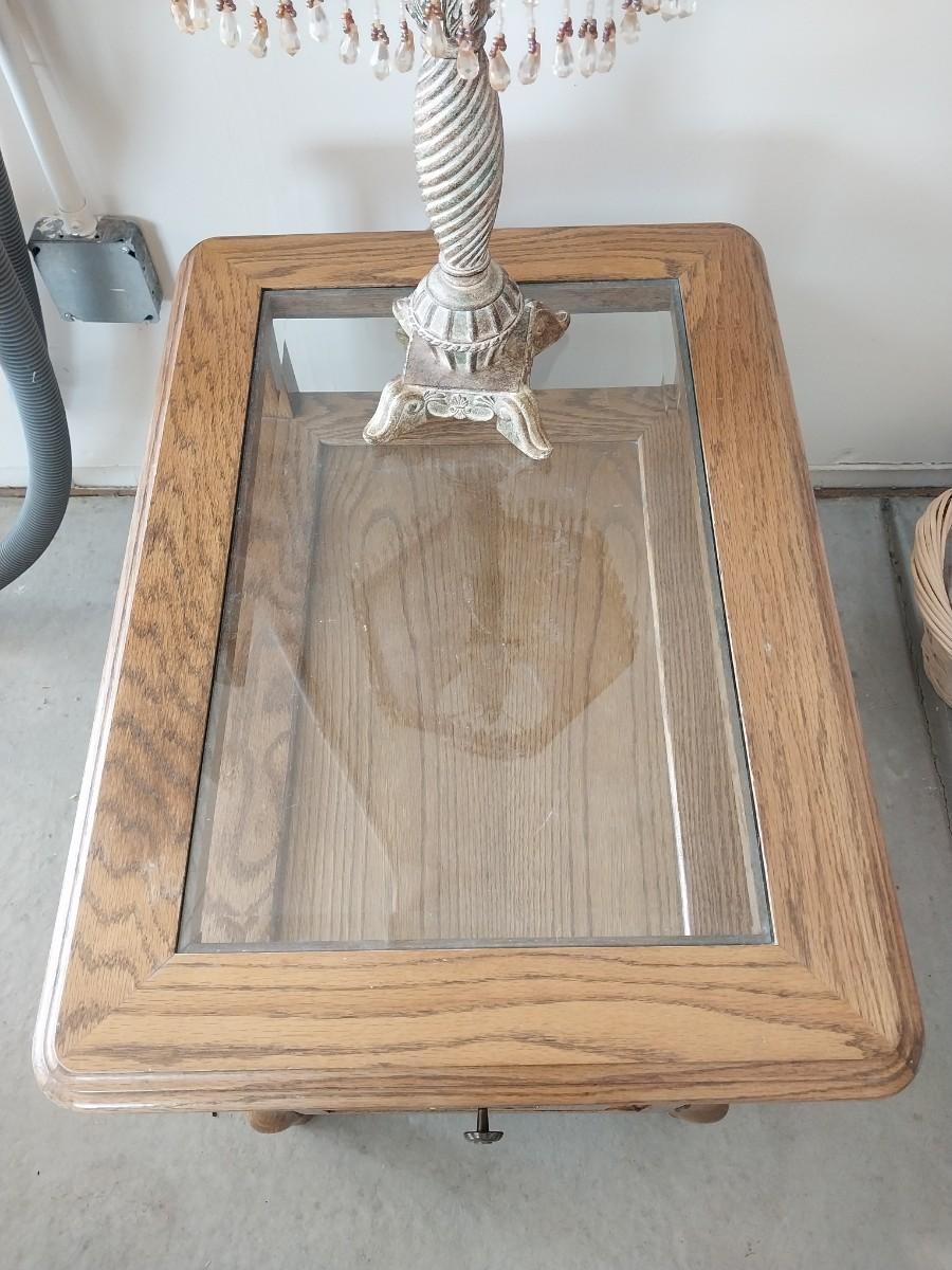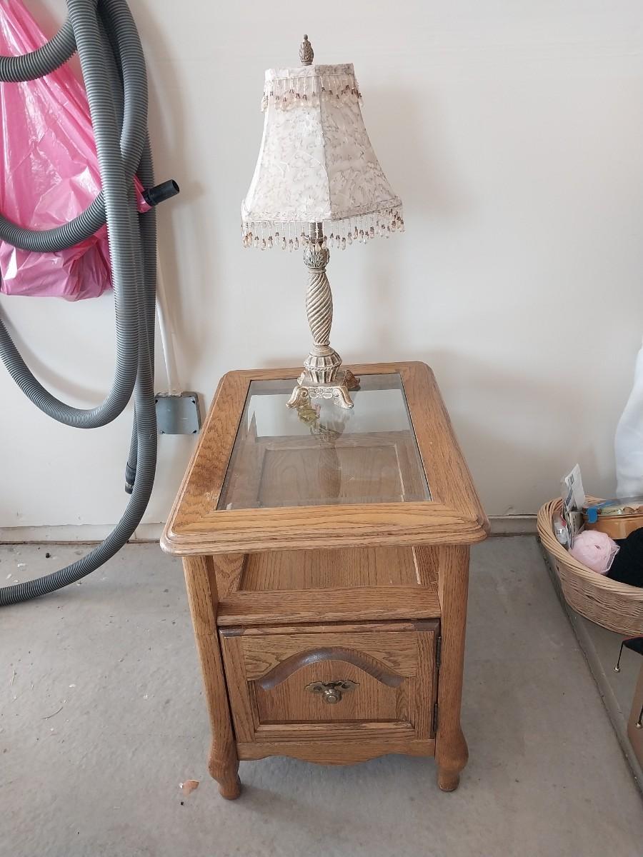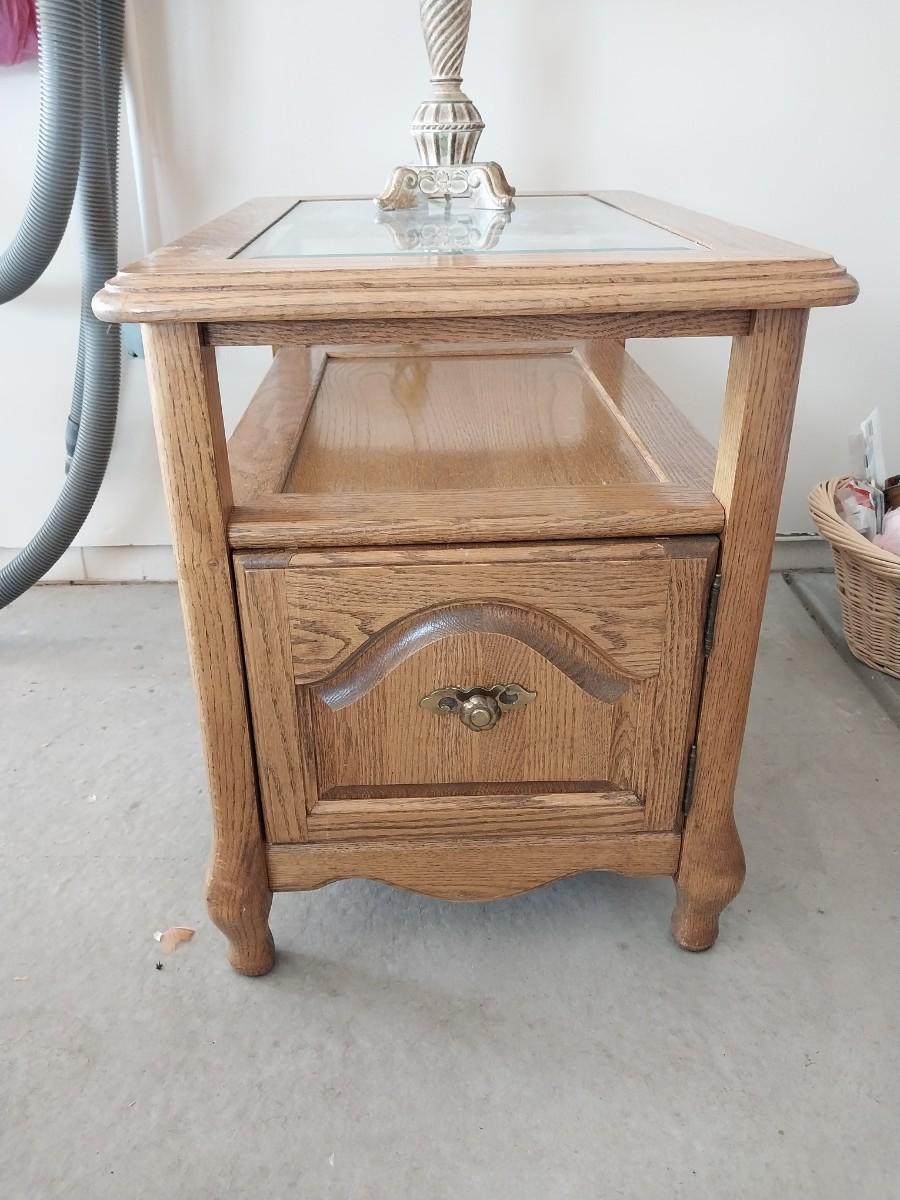 TWO TIER GLASS TOP WOODEN ENDTABLE WITH DRAWER AND LAMP