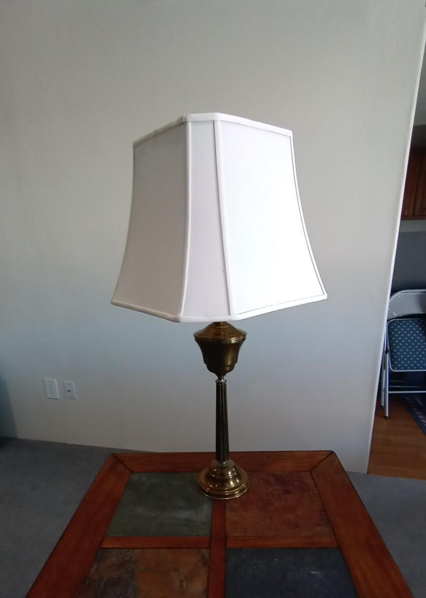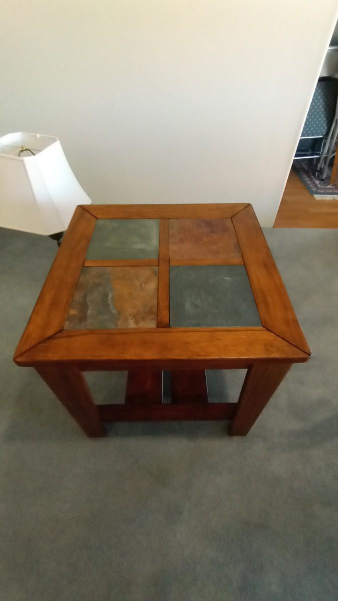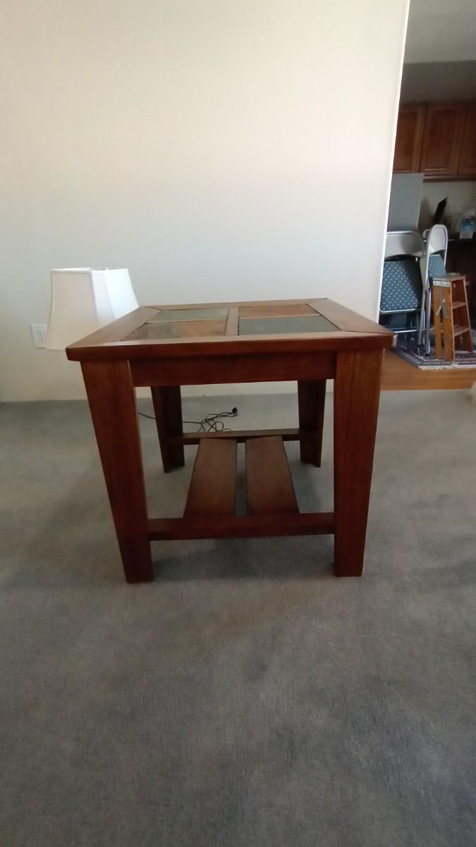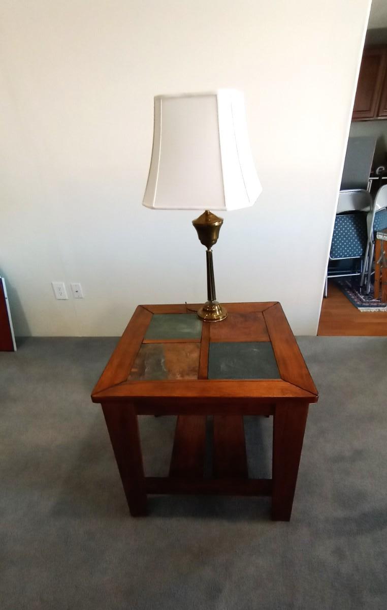TWO TIER TILE INLAY WOODEN ENDTABLE APPROX. 26X50 AND LAMP WITH SHADE APPROX. 30" TALL