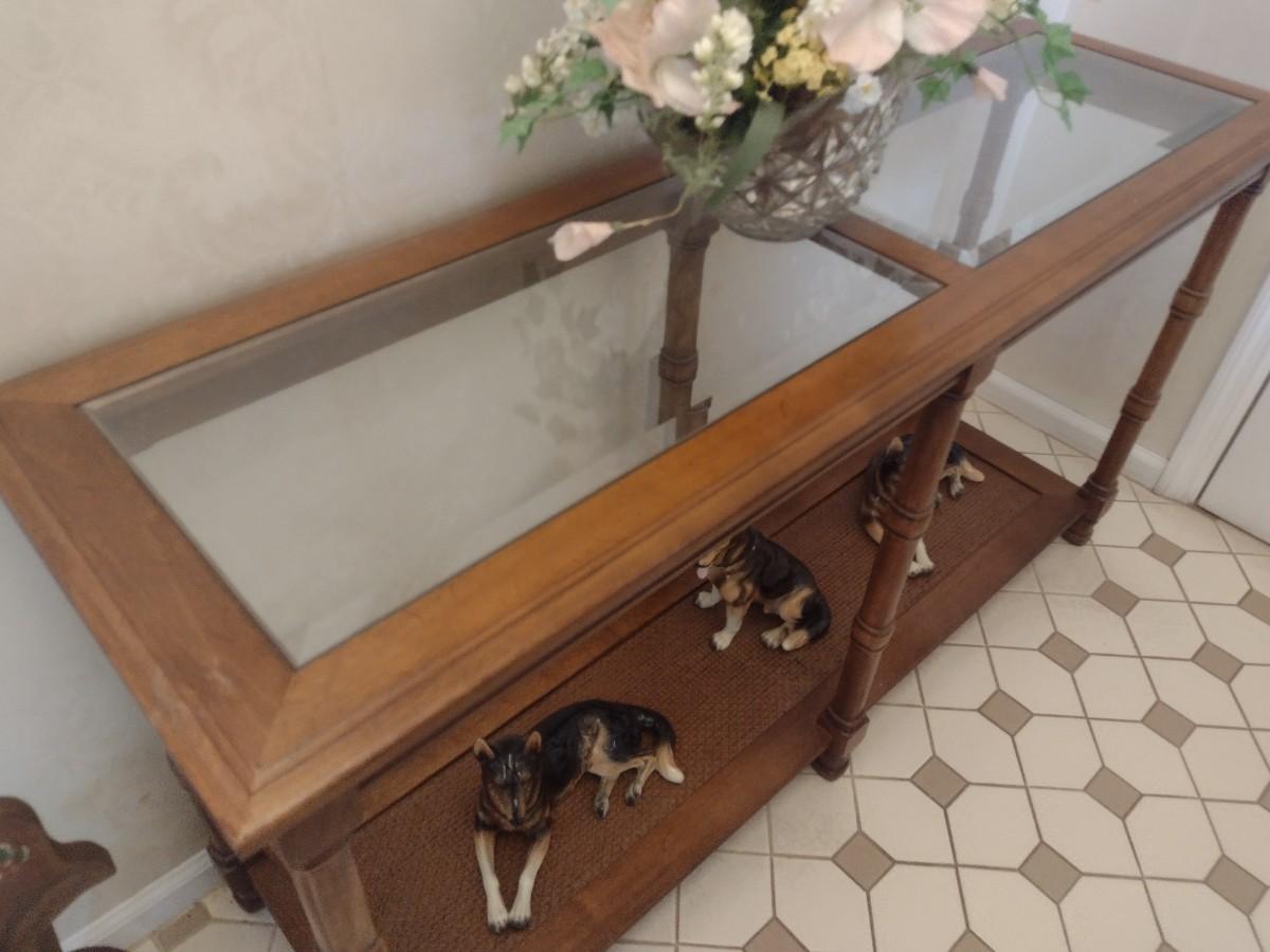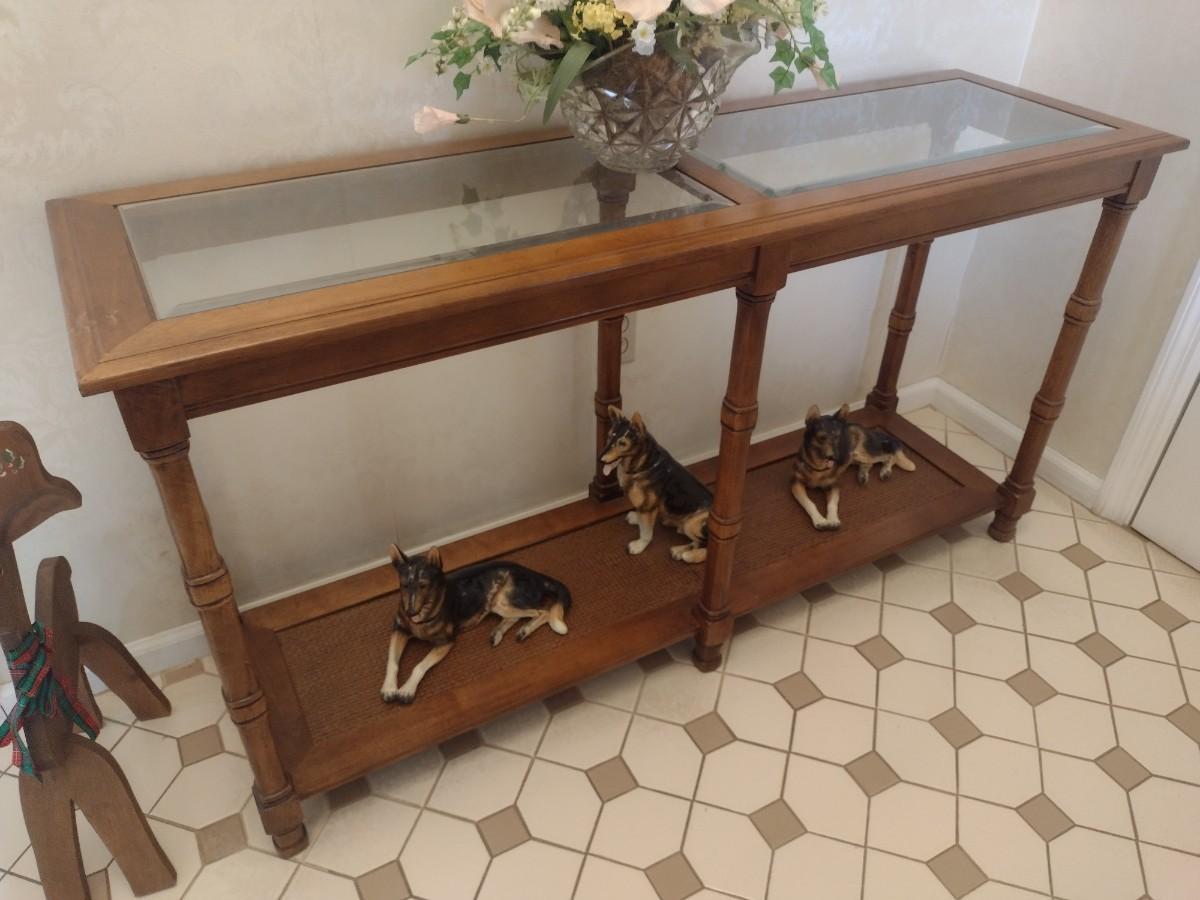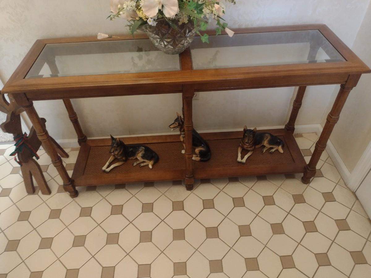 Two Tier Window of Sofa Table with Glass Top and Lower Cane Shelf (No Contents)