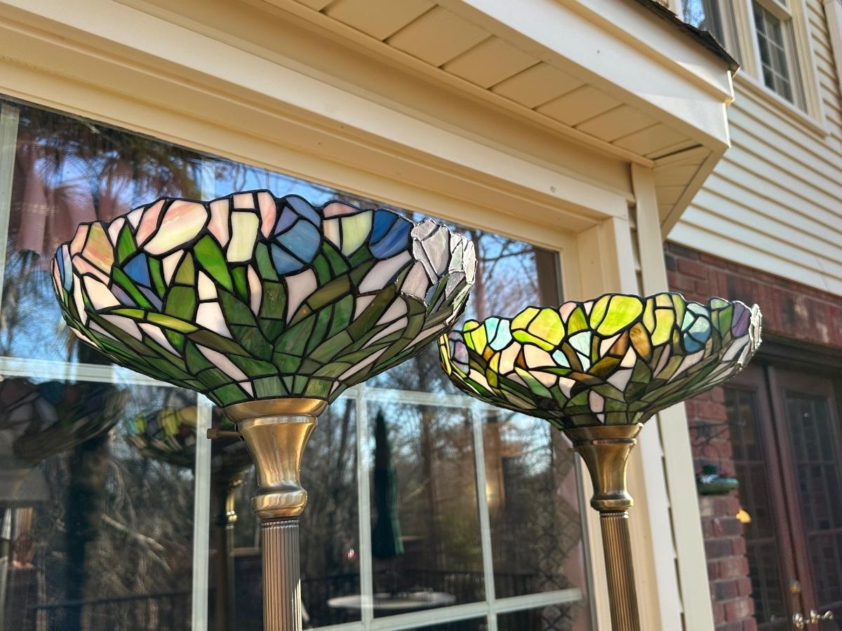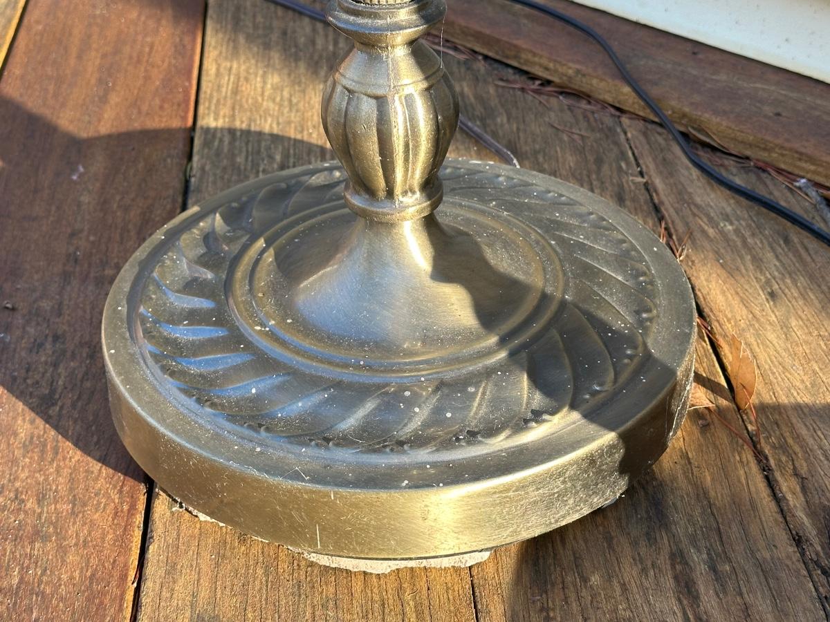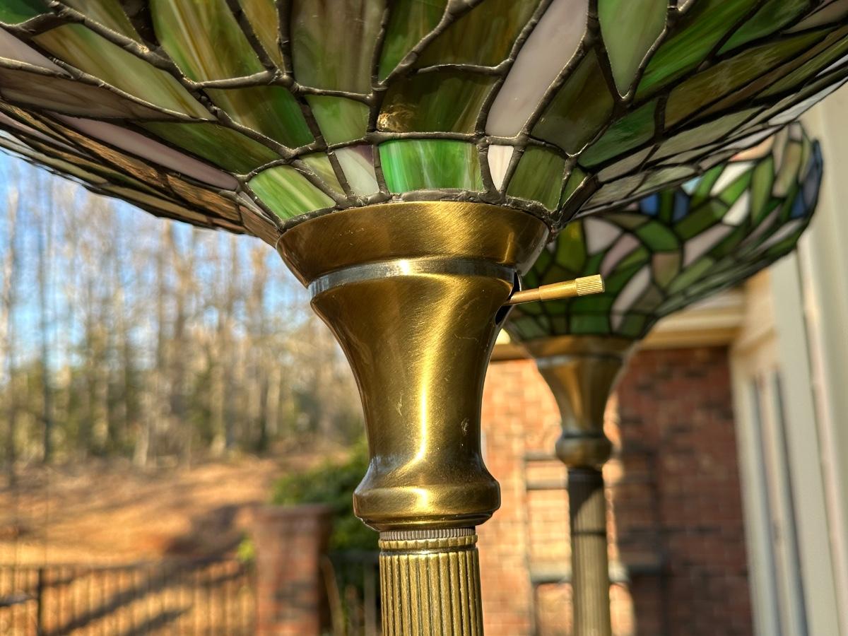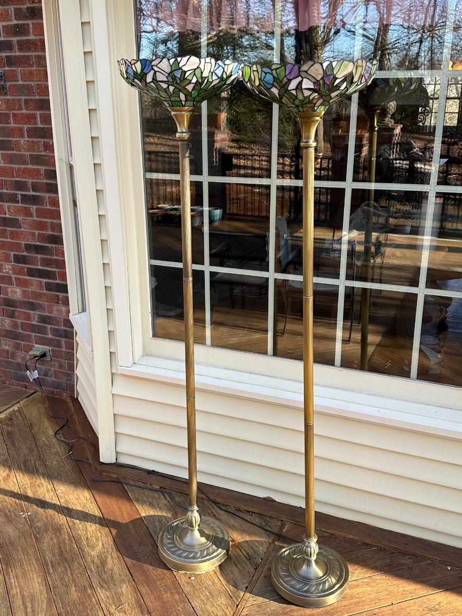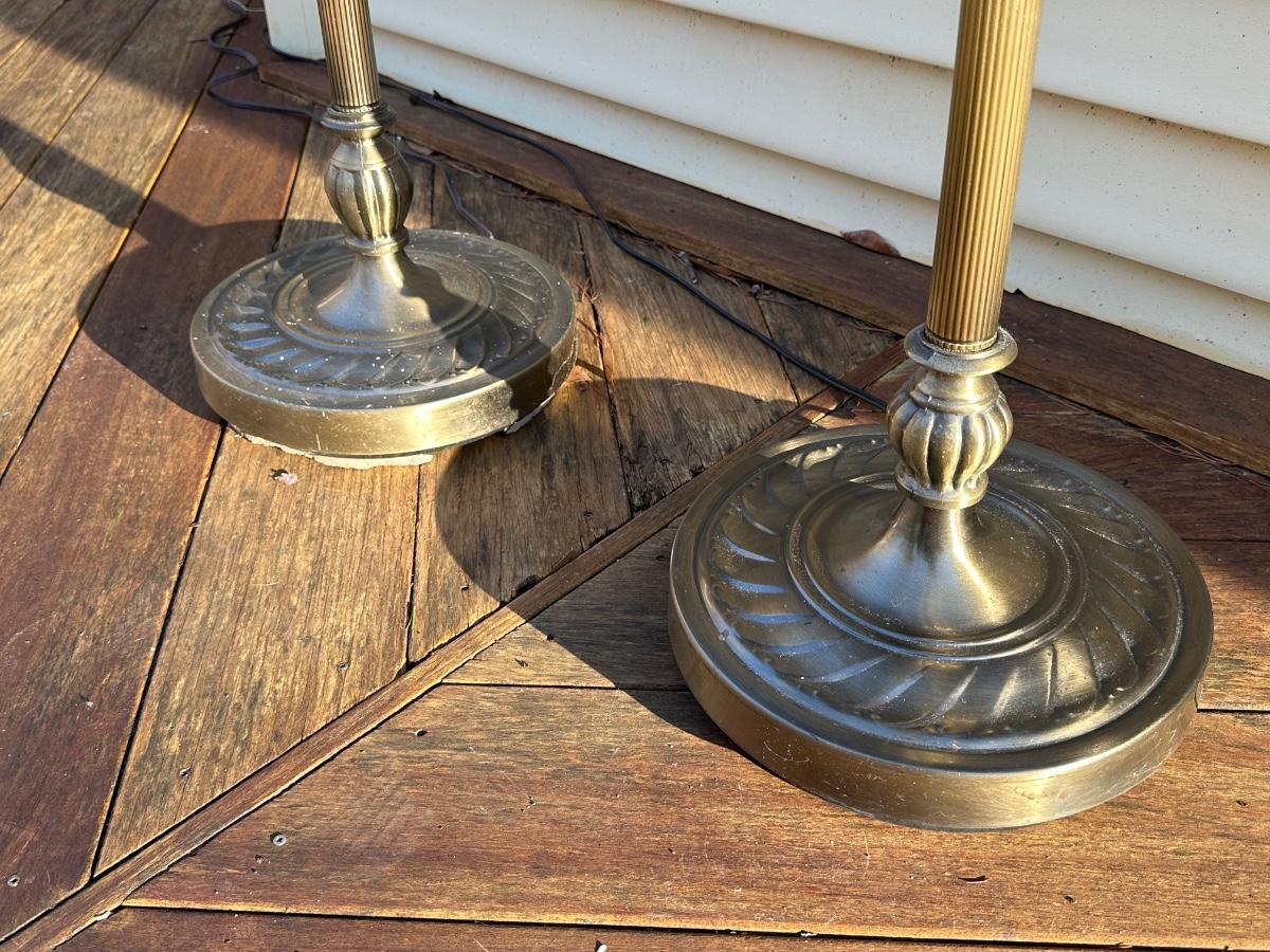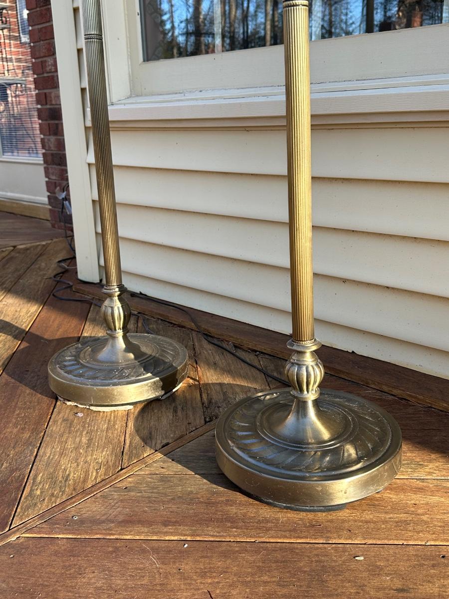 Please review photos carefully. Important — Lamps are in good condition, however there is about a 1” height difference. One lamp does slightly lean (it may need to be tightened, but we are not entirely sure) and one is missing half of a base foundation (pictured)