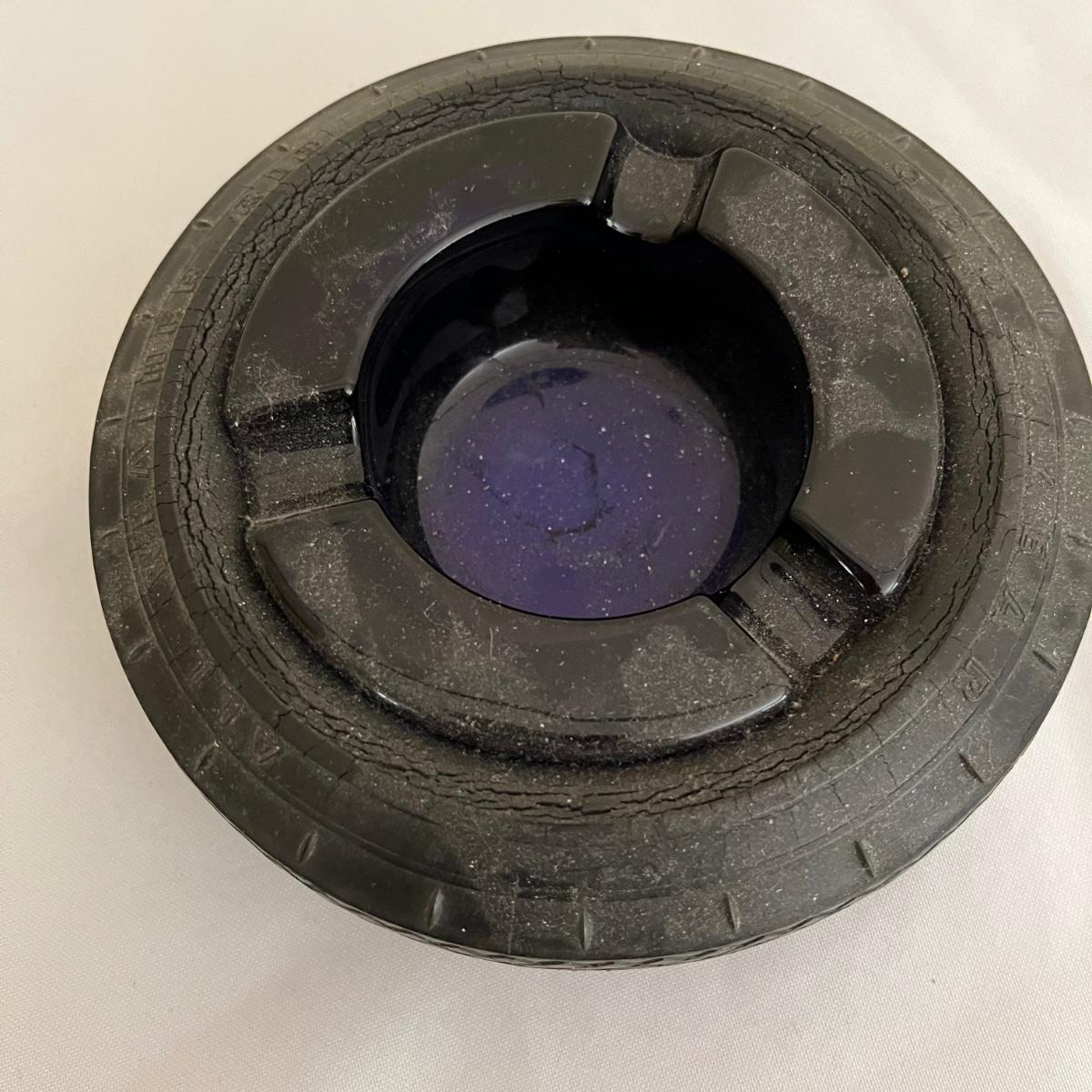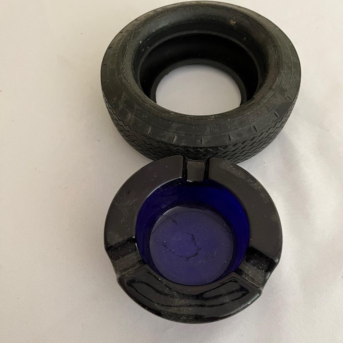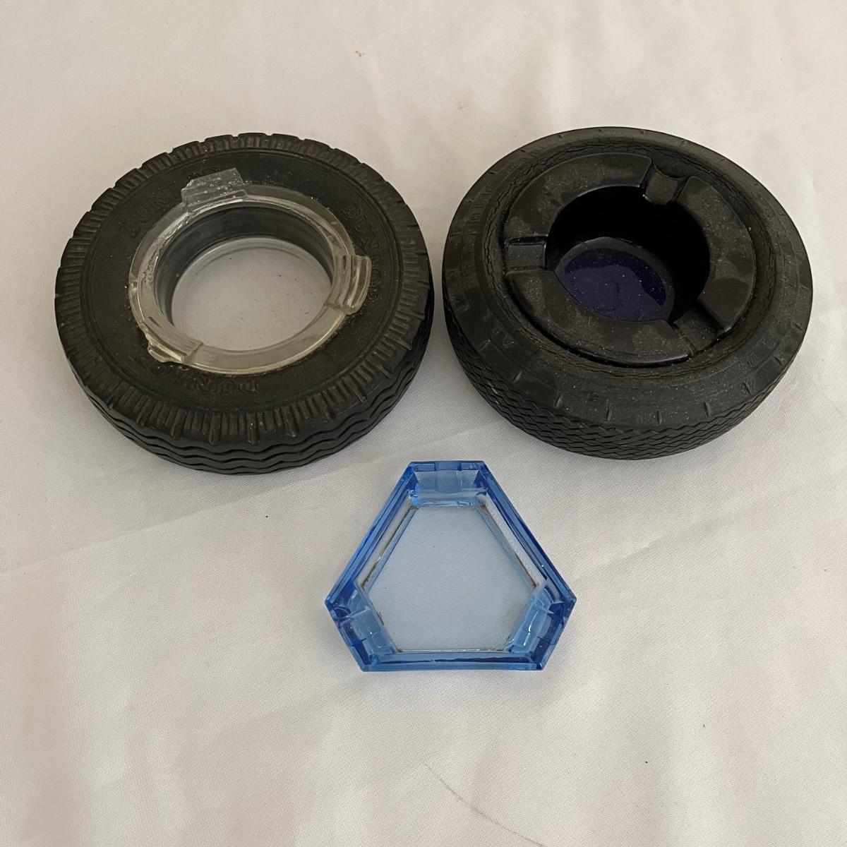 Lot includes a Goodyear tire ashtray with blue glass insert, Dunlop tire ashtray with clear glass insert and BBC a blue glass ashtray. Largest tire measures 6” x 1.75”.
