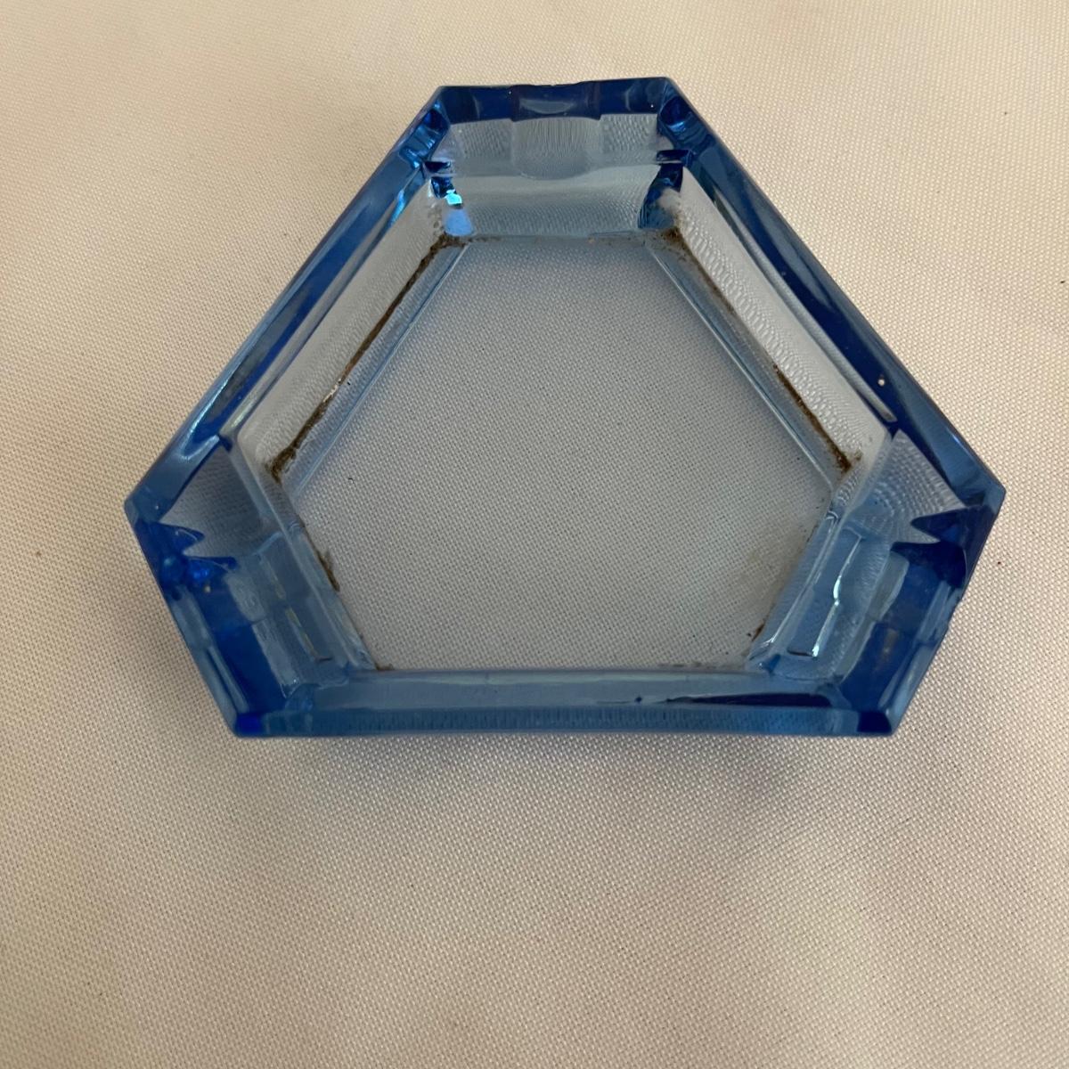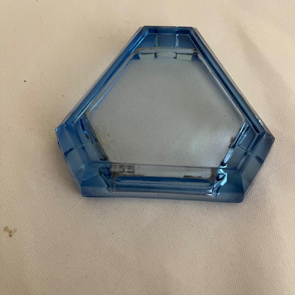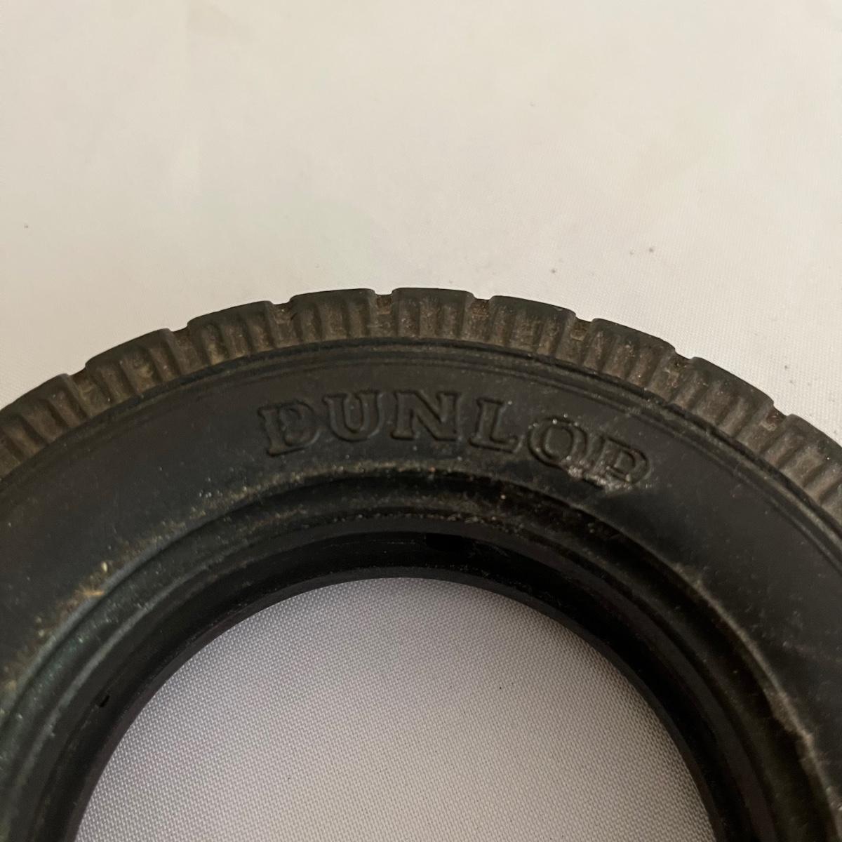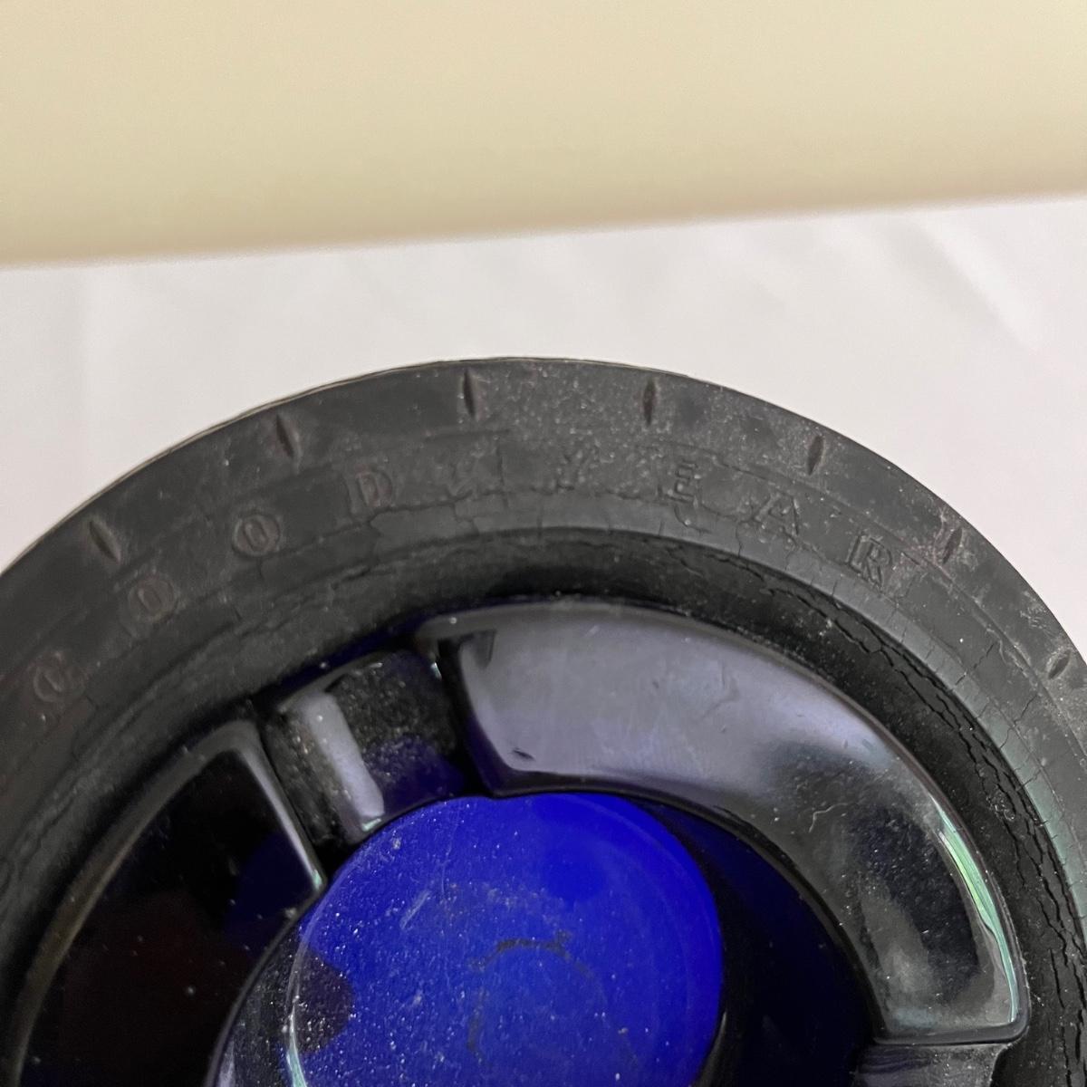 Lot includes a Goodyear tire ashtray with blue glass insert, Dunlop tire ashtray with clear glass insert and BBC a blue glass ashtray. Largest tire measures 6” x 1.75”.