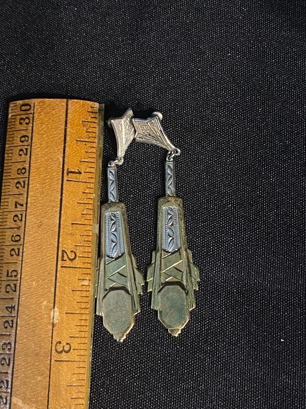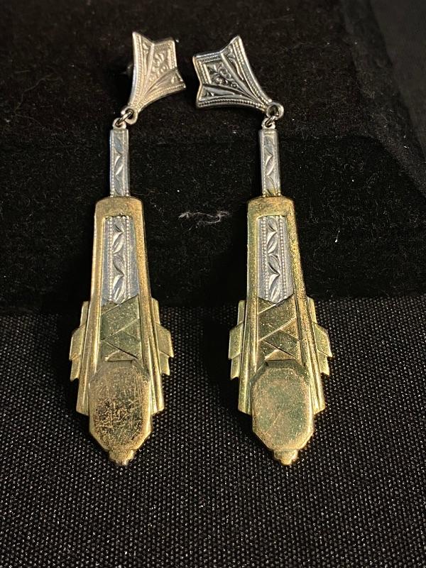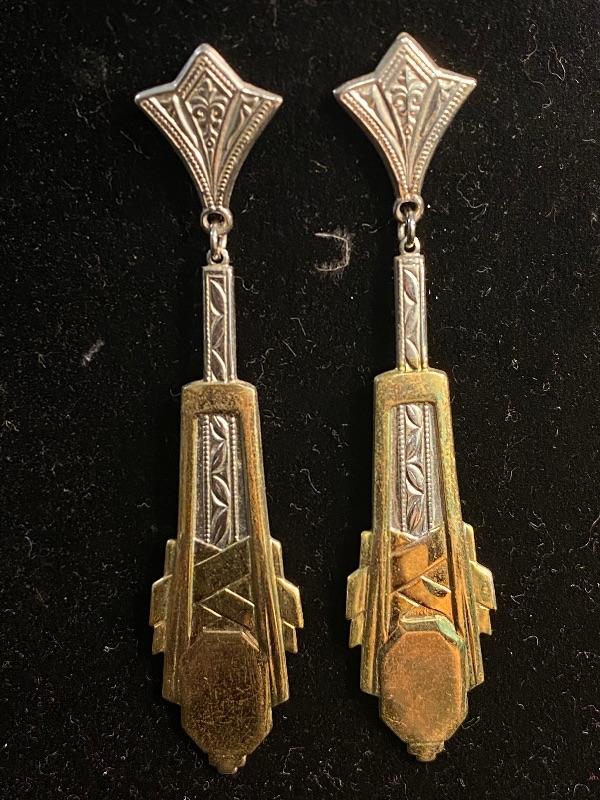 Two tone Art Deco style Earrings. Dangle earrings, almost 3" in length. For pierced ears. Previously owned.