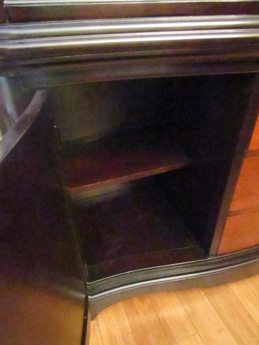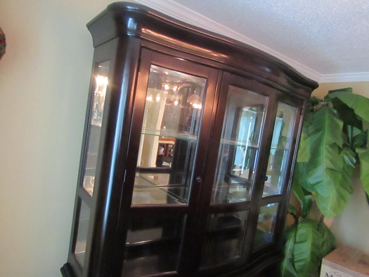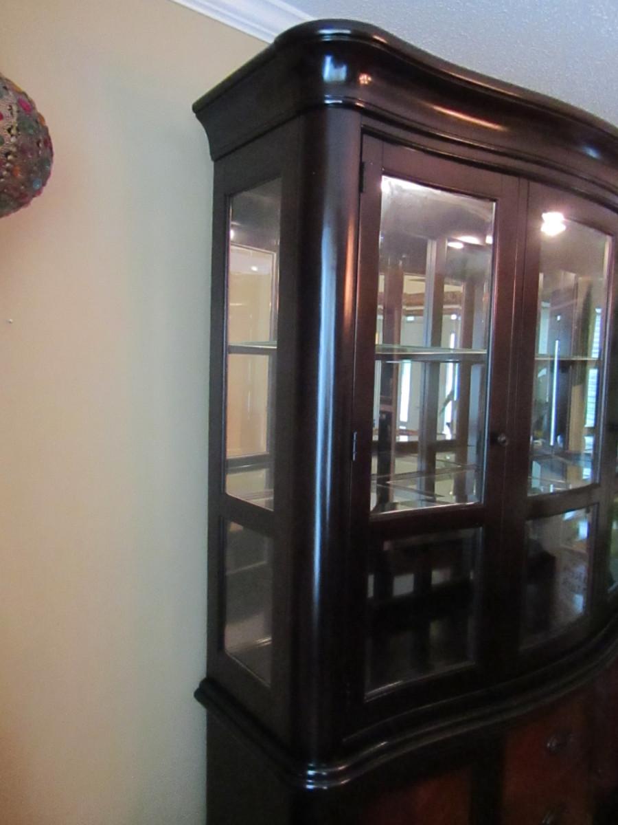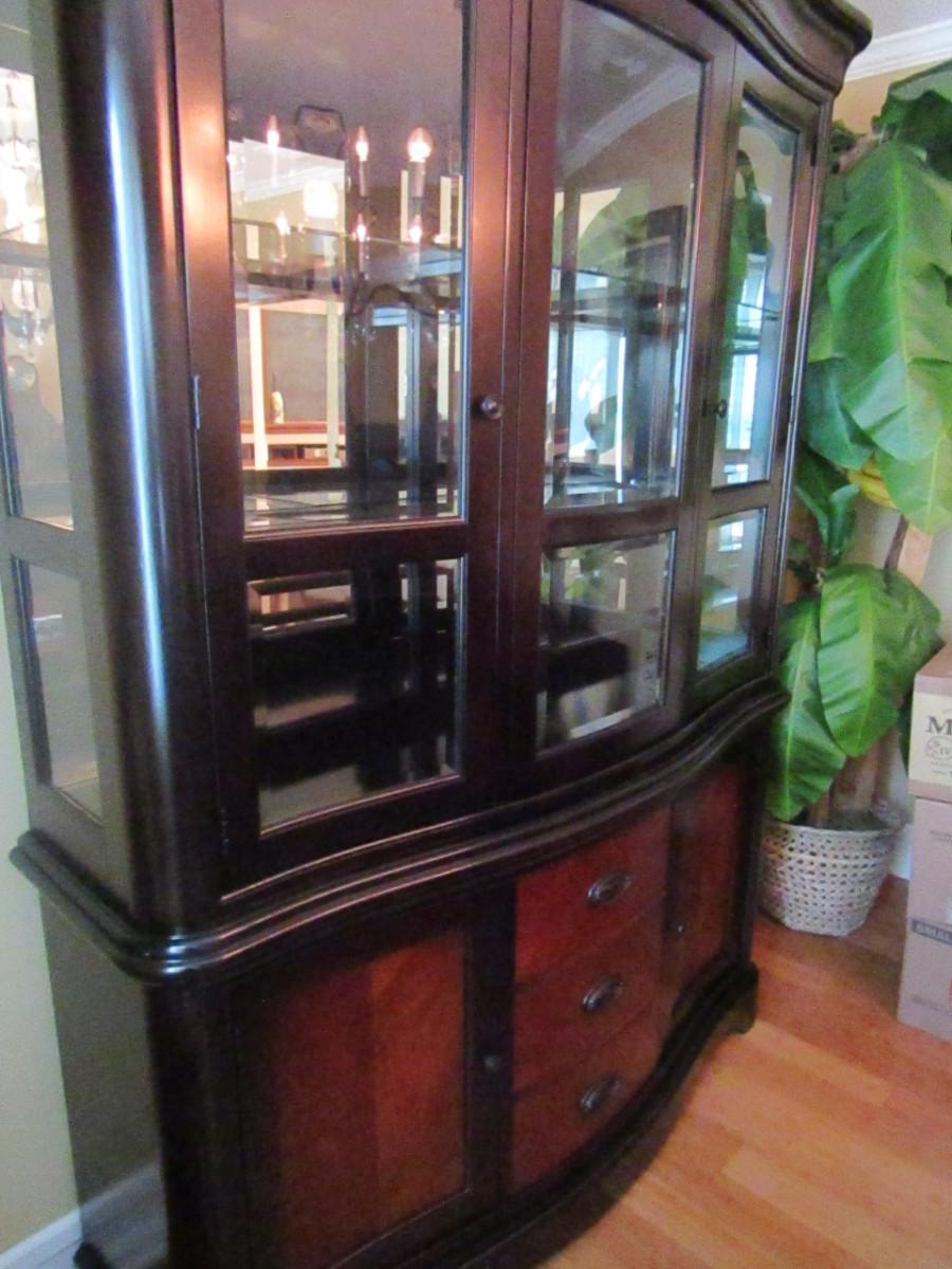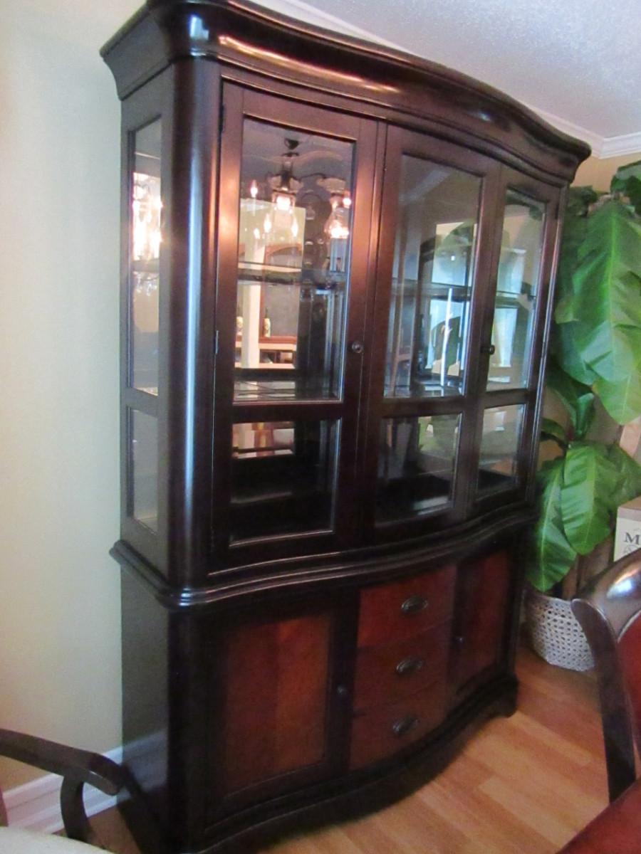 Two Tone Lighted Hutch Cabinet with Enclosed Storage Underneath. No maker's mark found. Storage area has two cabinets and three drawers.